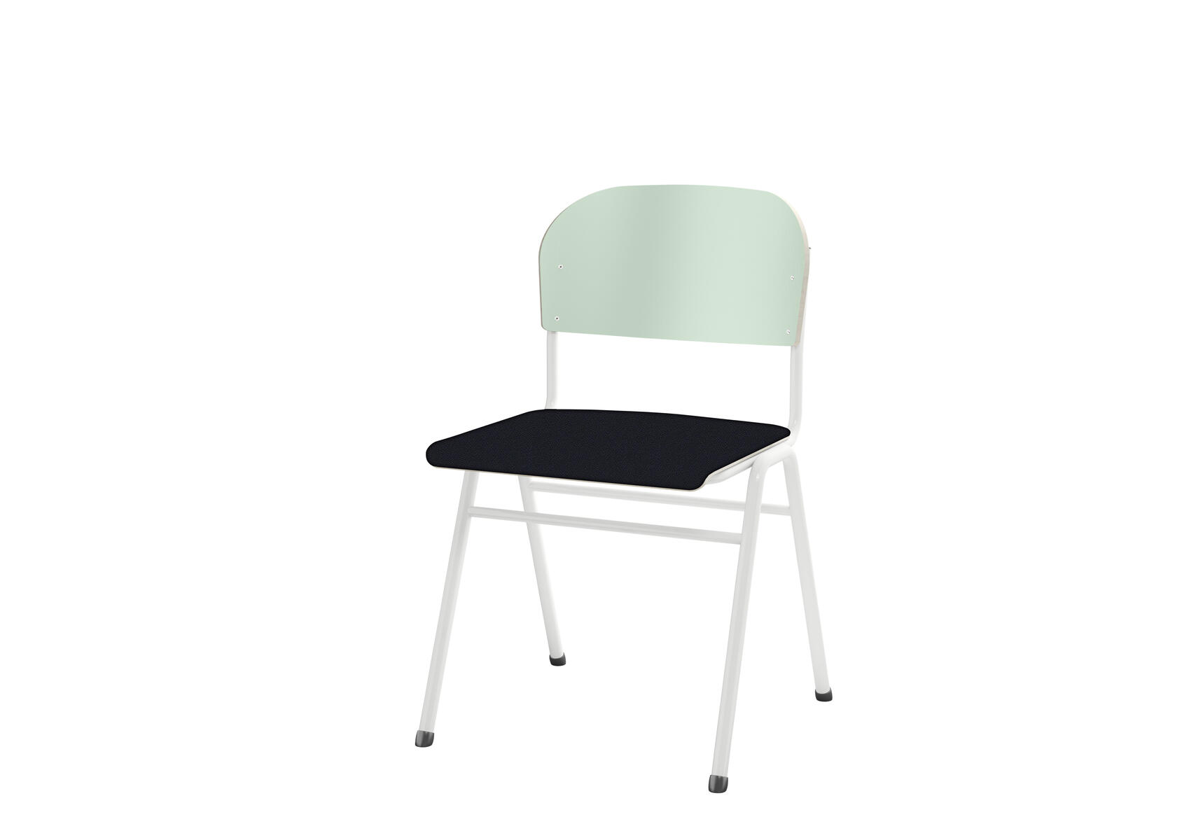 Stapelbar (max 4 st/stapel). Ljuddämpande tassar. Upphängningsbar på bord. Reglerbar fotbräda i 3 fasta lägen. Sitthöjd 50 cm. Sitsmått: B36xD35 cm. Totaldjupet på stativet är 54 cm. Vikt 4,6 kg. Sits och rygg i högtryckslaminat. Silverlackerat stativ, RAL 9006.