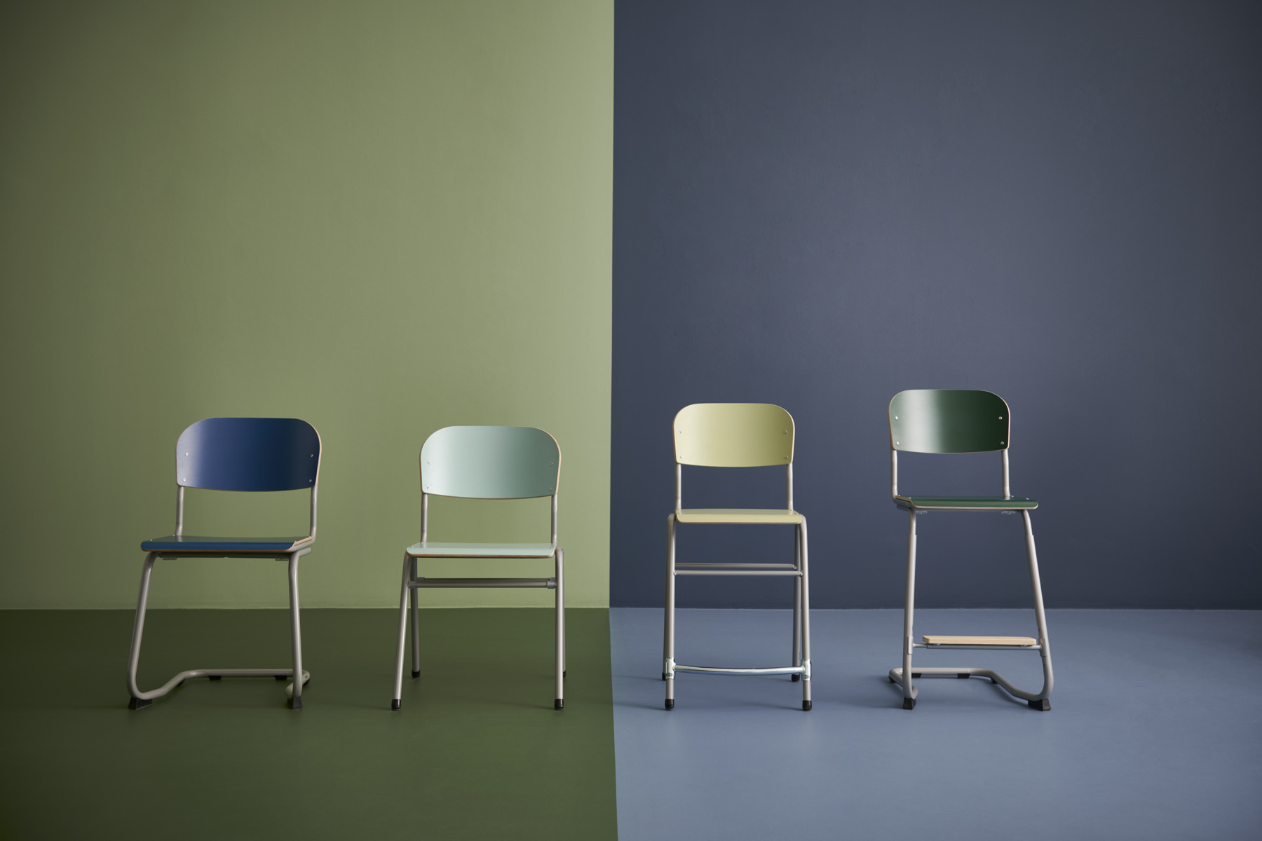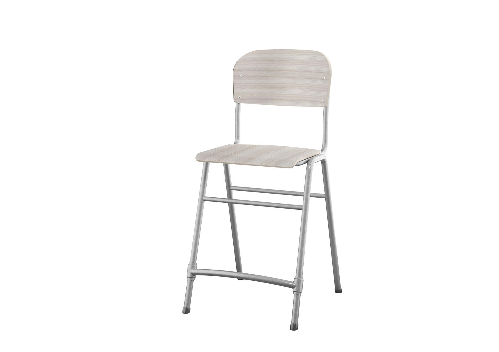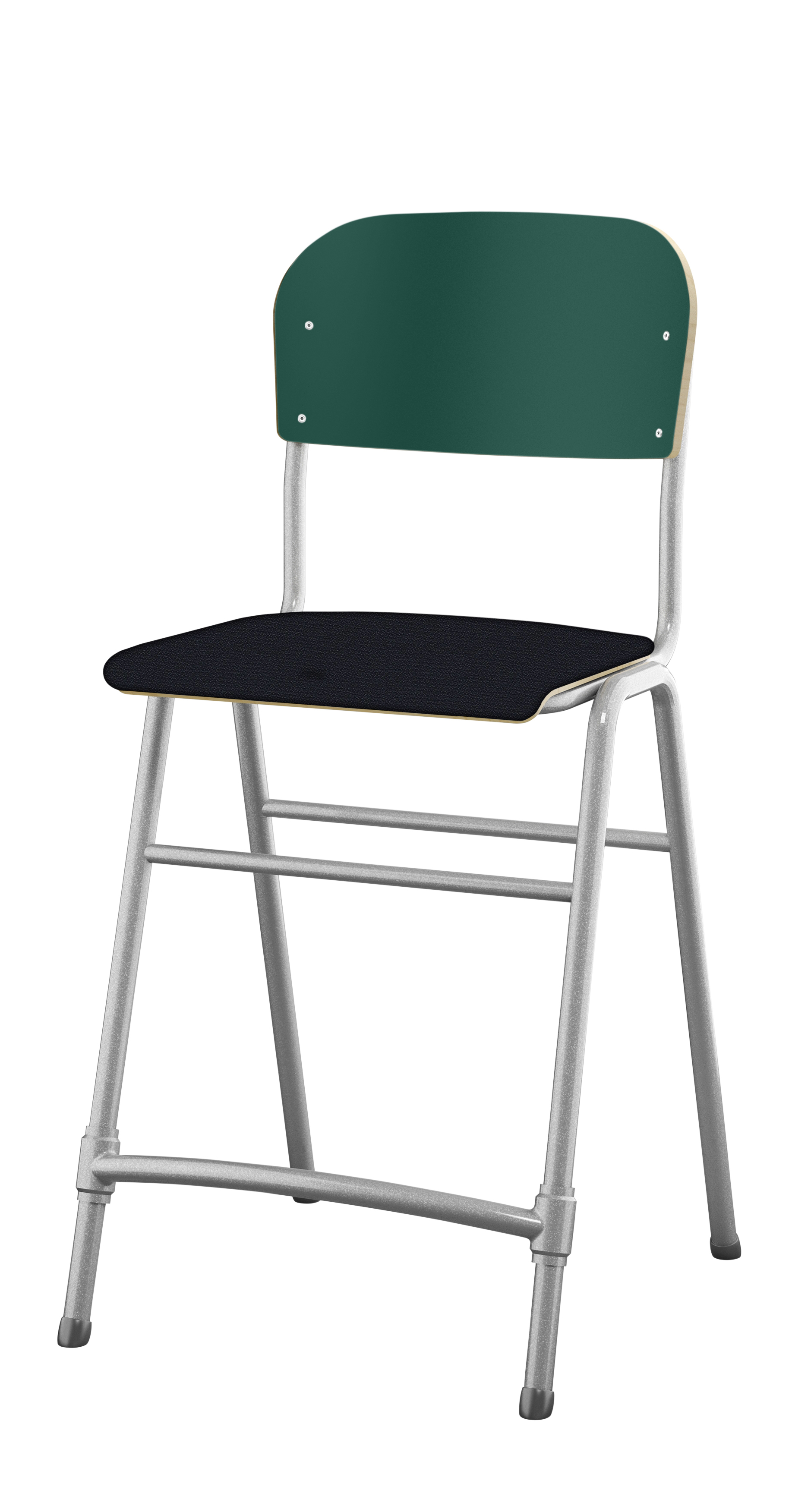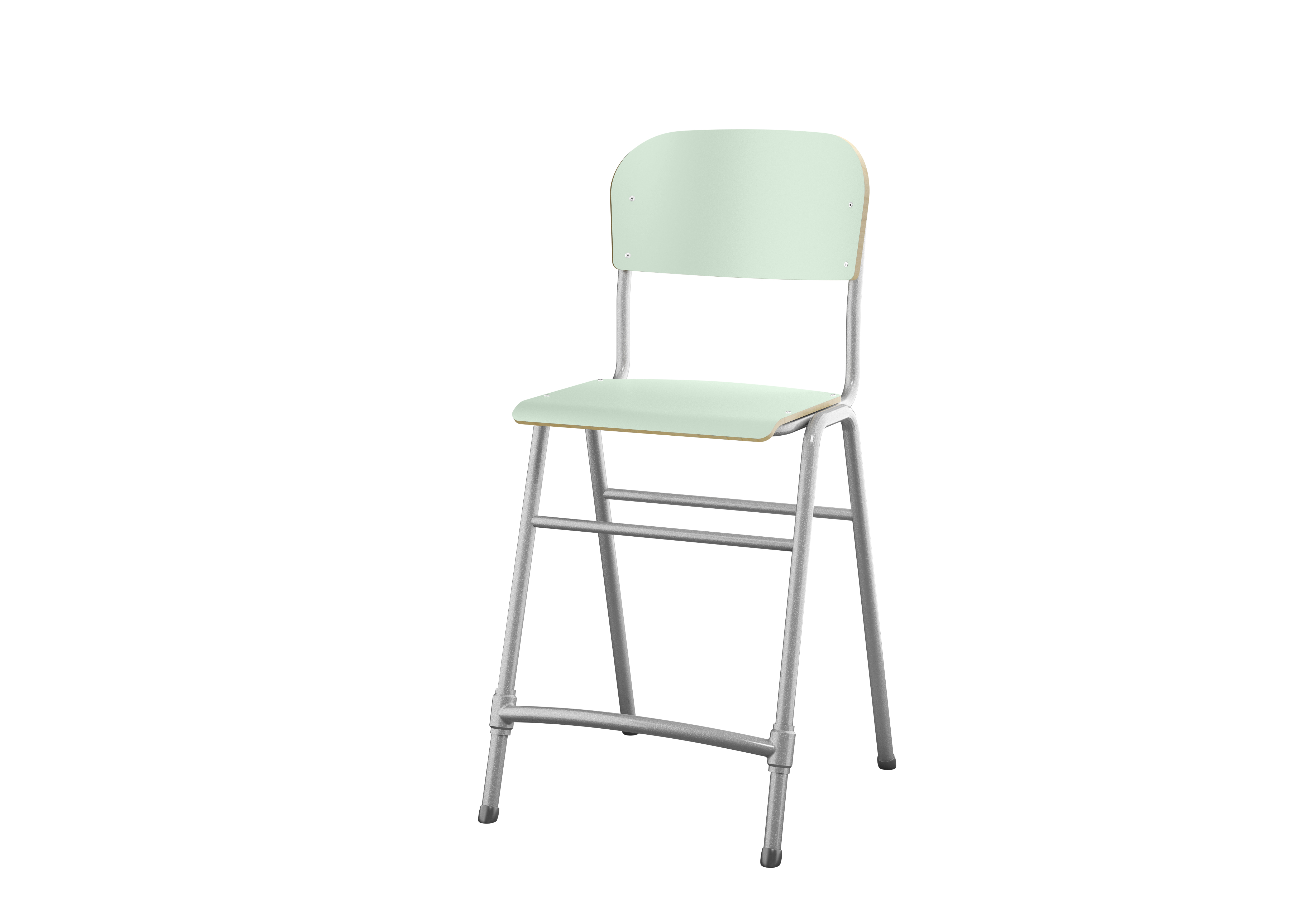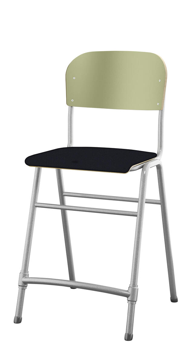 Justerbara tassar. Sitthöjd: ställbar till 38, 43, 46 eller 51 cm. Mått: B36xD35 cm. Vikt 4,8 kg. Sits och rygg i högtryckslaminat. Silverlackerat stativ, RAL 9006.
