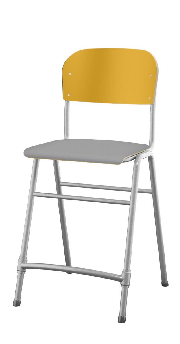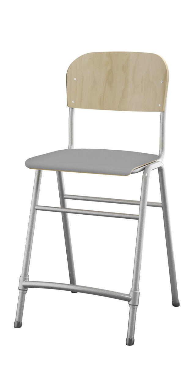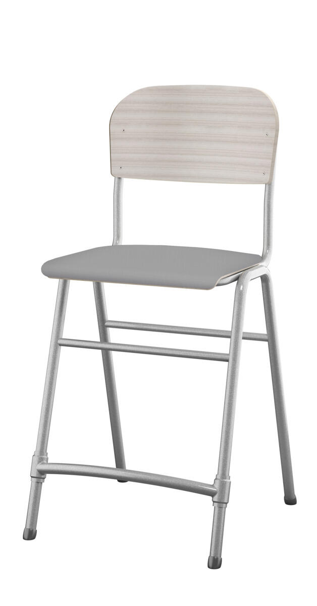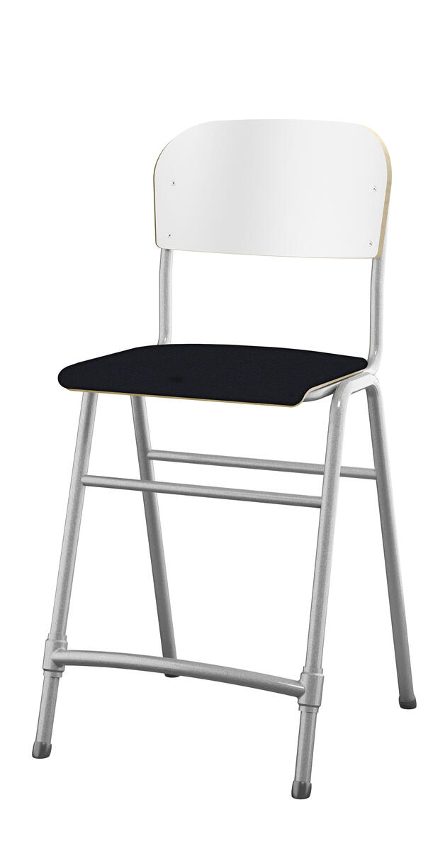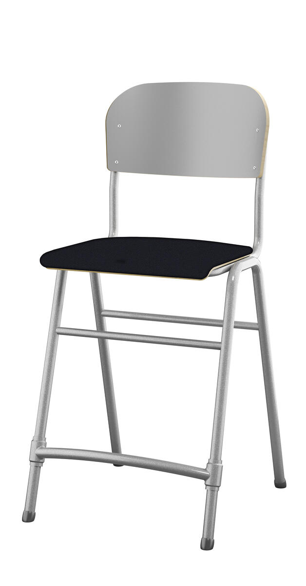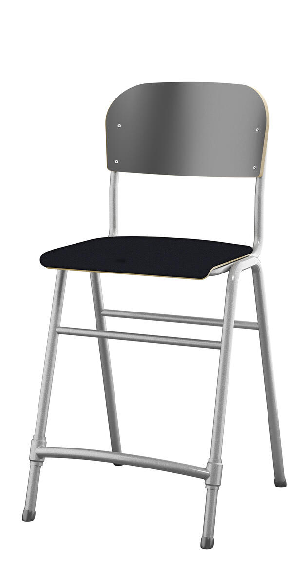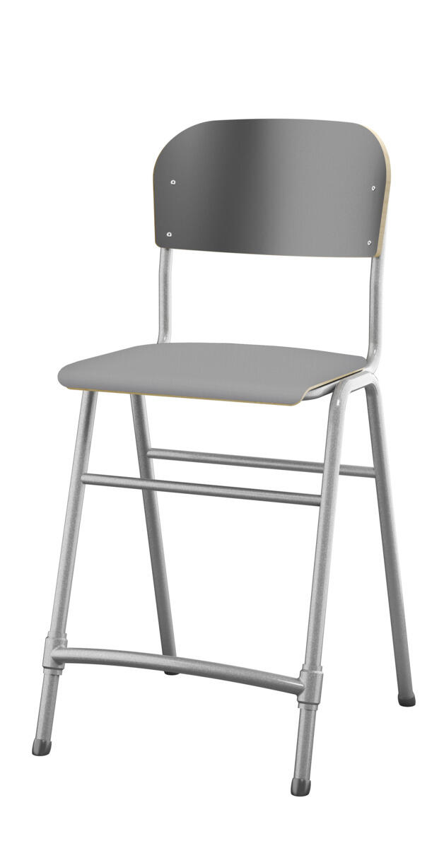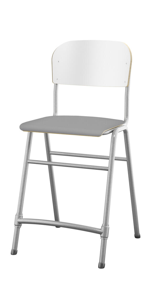 Stapelbar. Ljuddämpande tassar. Reglerbart fotstöd. Sitthöjd: 65 cm. Sitsmått: B42xD39 cm. Vikt 5,3 kg. Sits och rygg i högtryckslaminat. Silverlackerat stativ, RAL 9006.