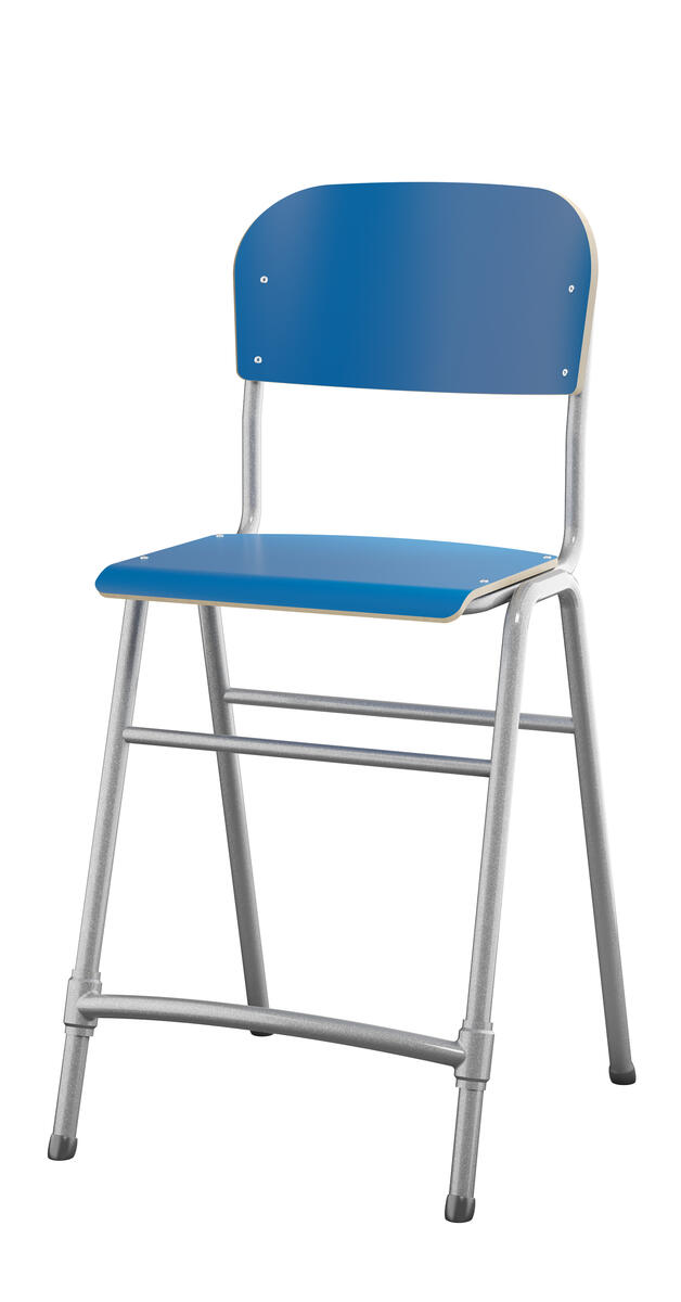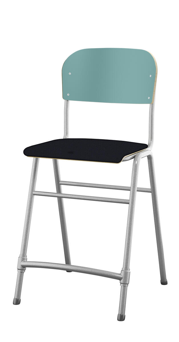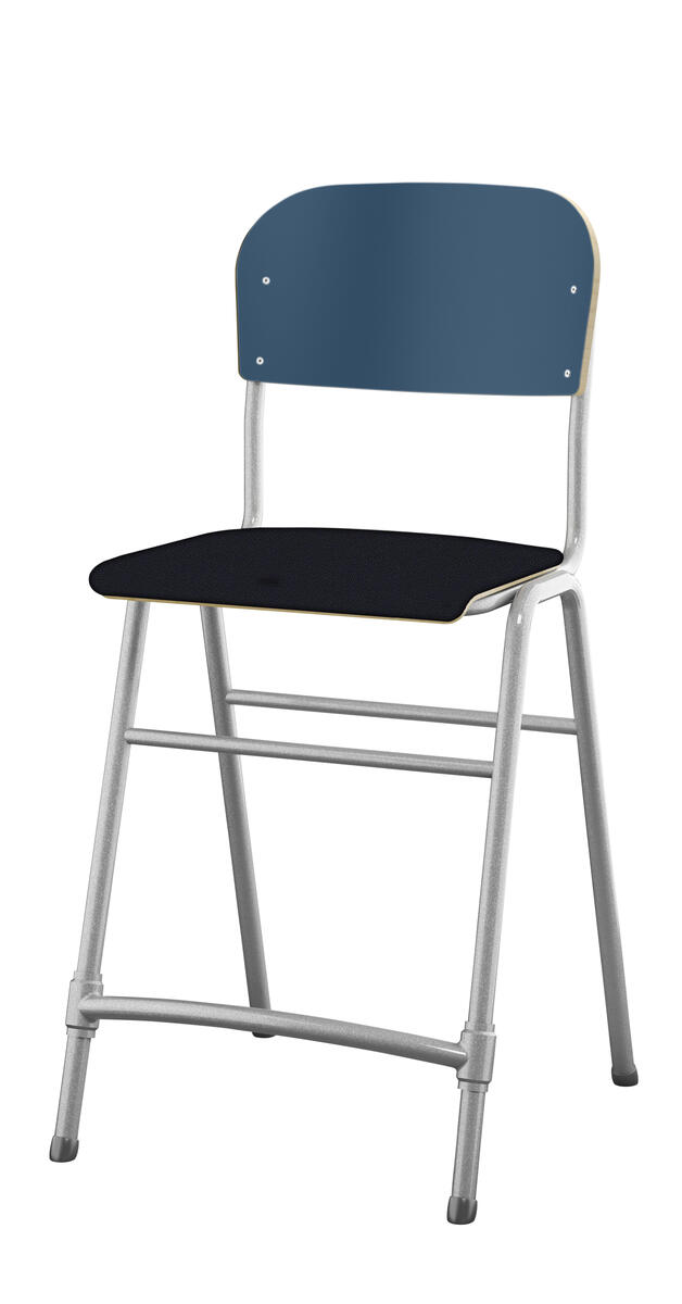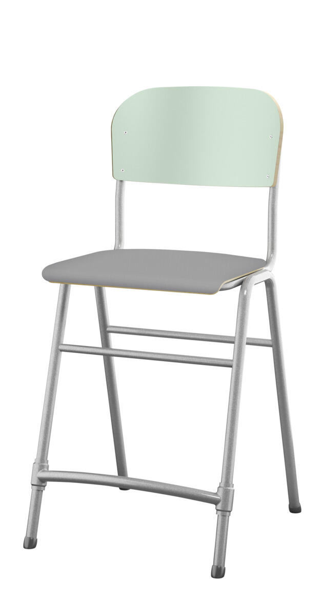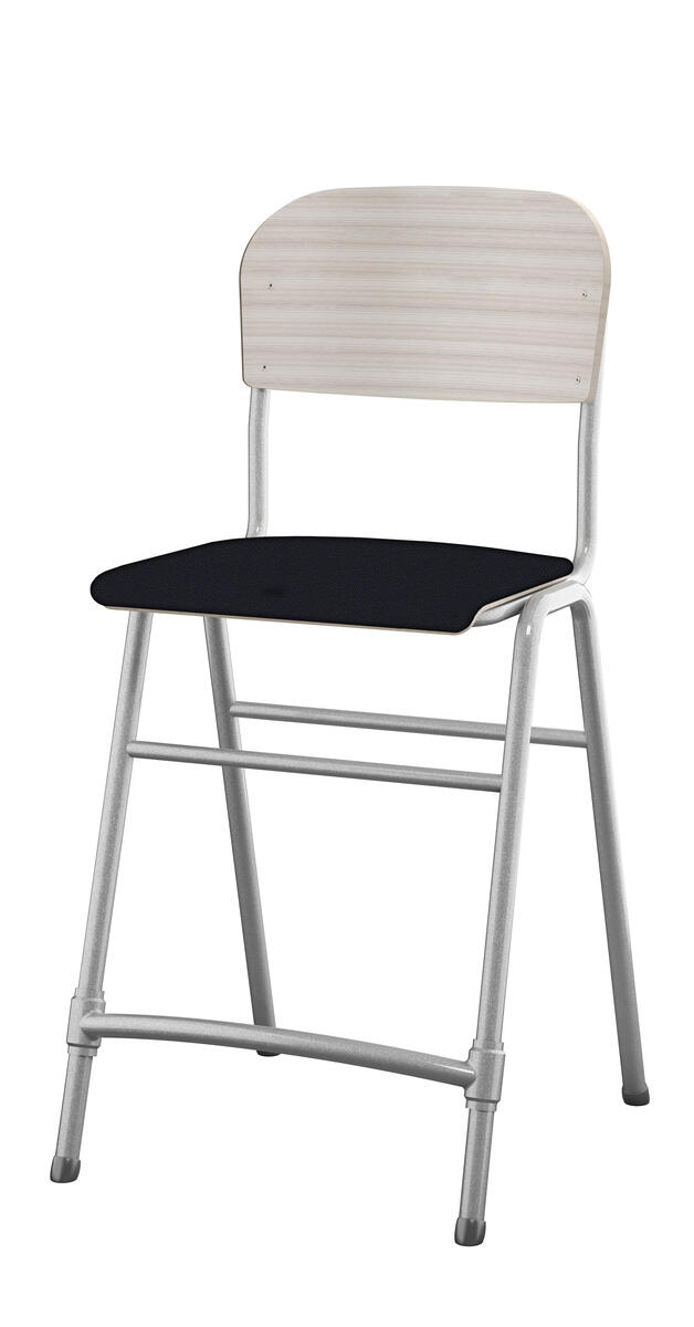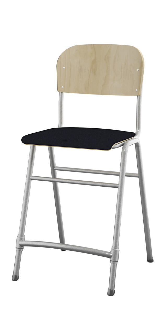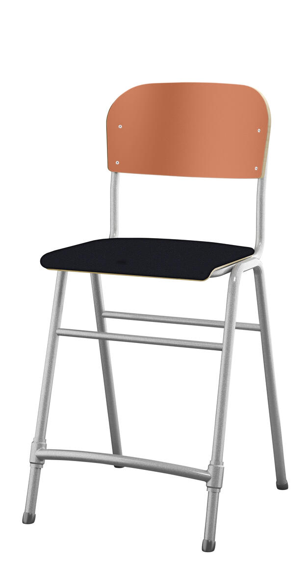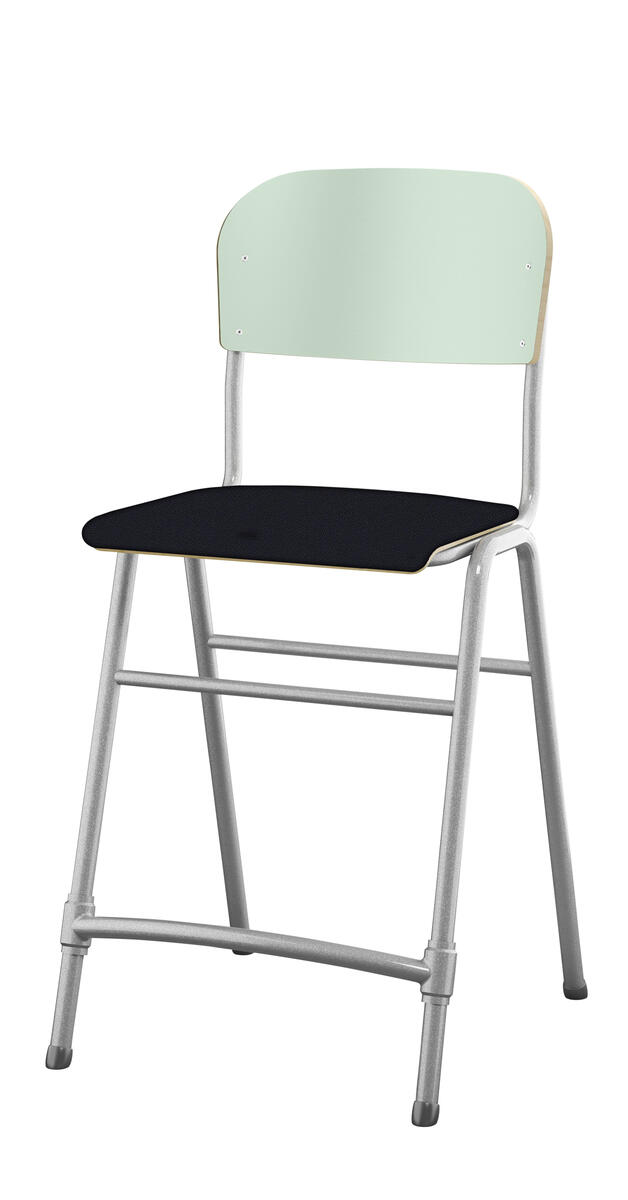 Stapelbar. Ljuddämpande tassar. Reglerbart fotstöd. Sitthöjd: 65 cm. Sitsmått: B42xD39 cm. Vikt 5,3 kg. Sits och rygg i högtryckslaminat. Silverlackerat stativ, RAL 9006.