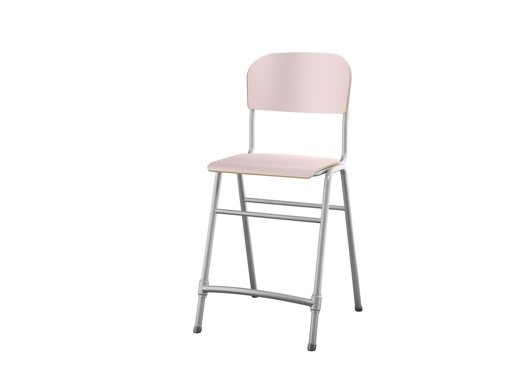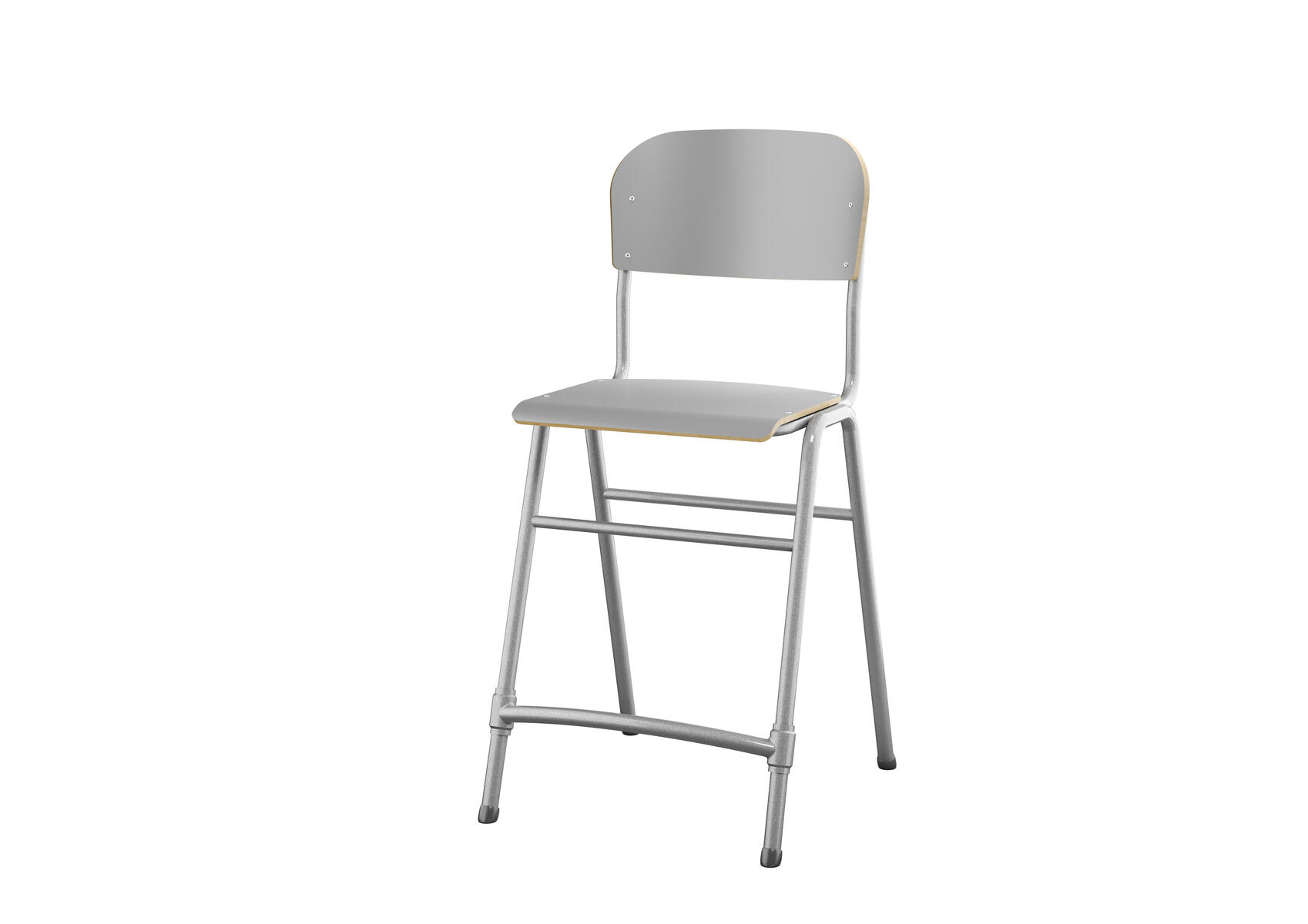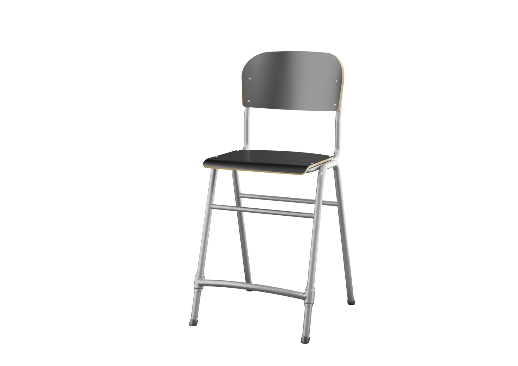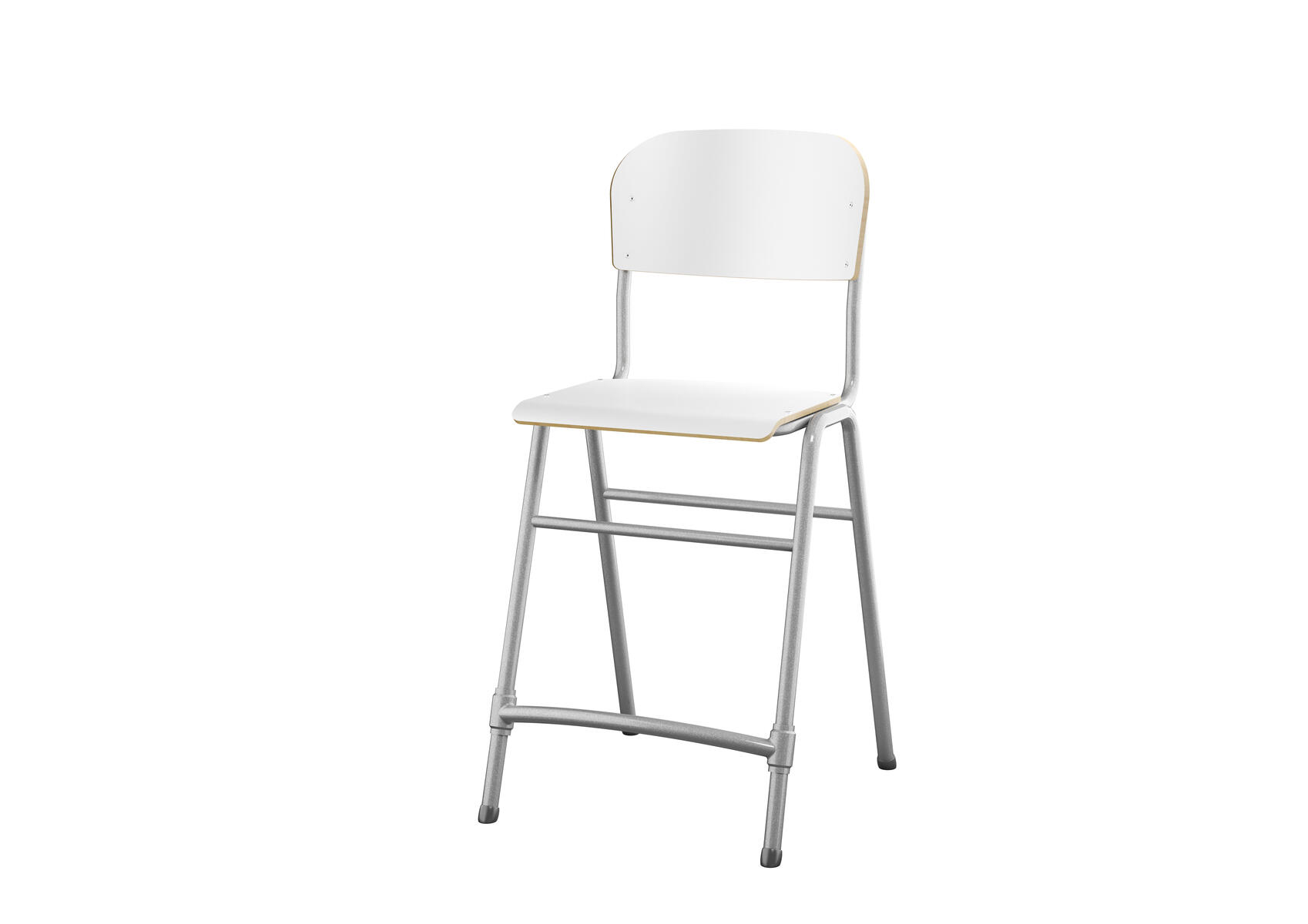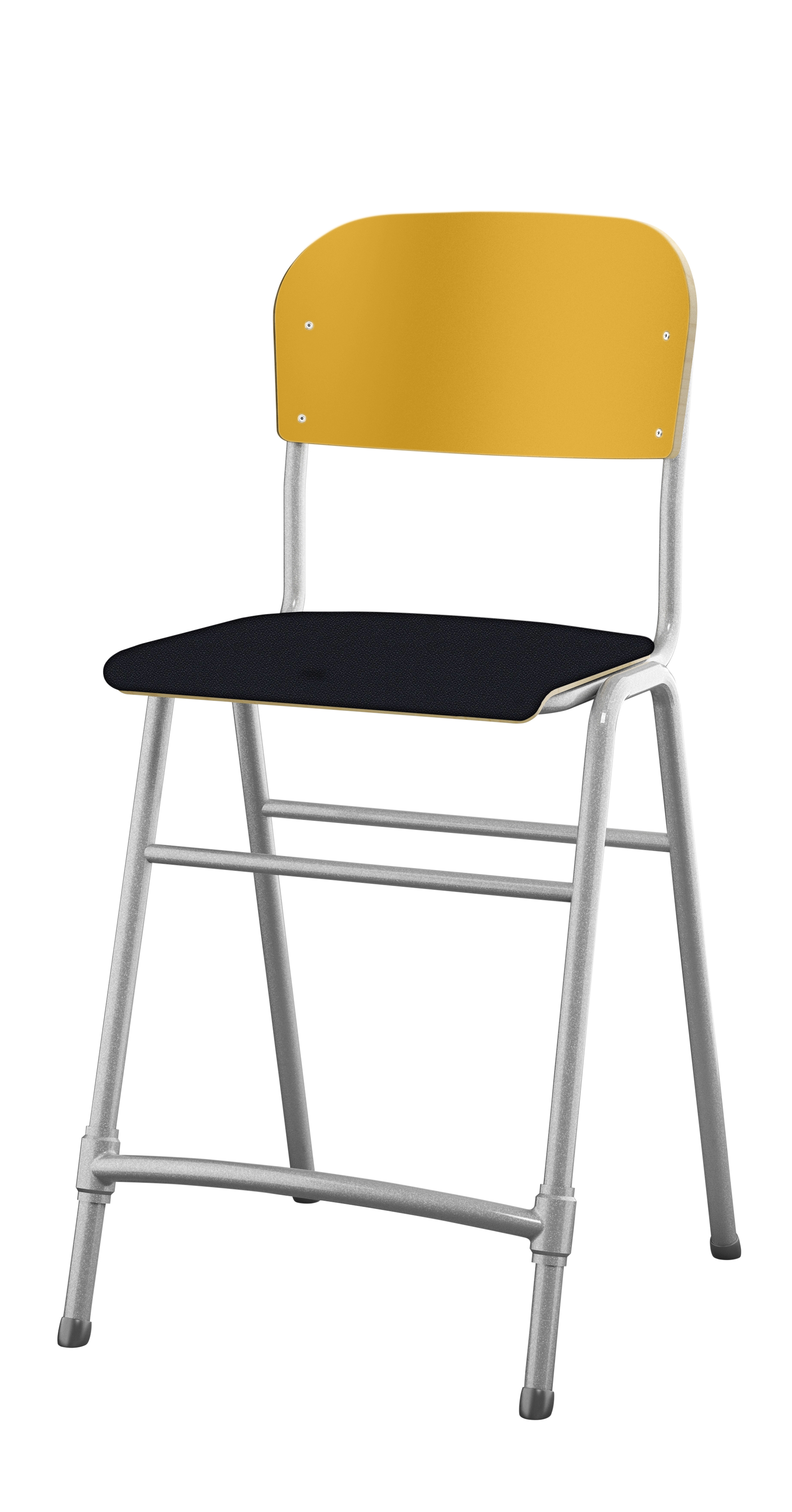 Stapelbar. Ljuddämpande tassar. Reglerbart fotstöd. Sitthöjd: 65 cm. Sitsmått: B42xD39 cm. Vikt 5,3 kg. Sits och rygg i högtryckslaminat. Silverlackerat stativ, RAL 9006.