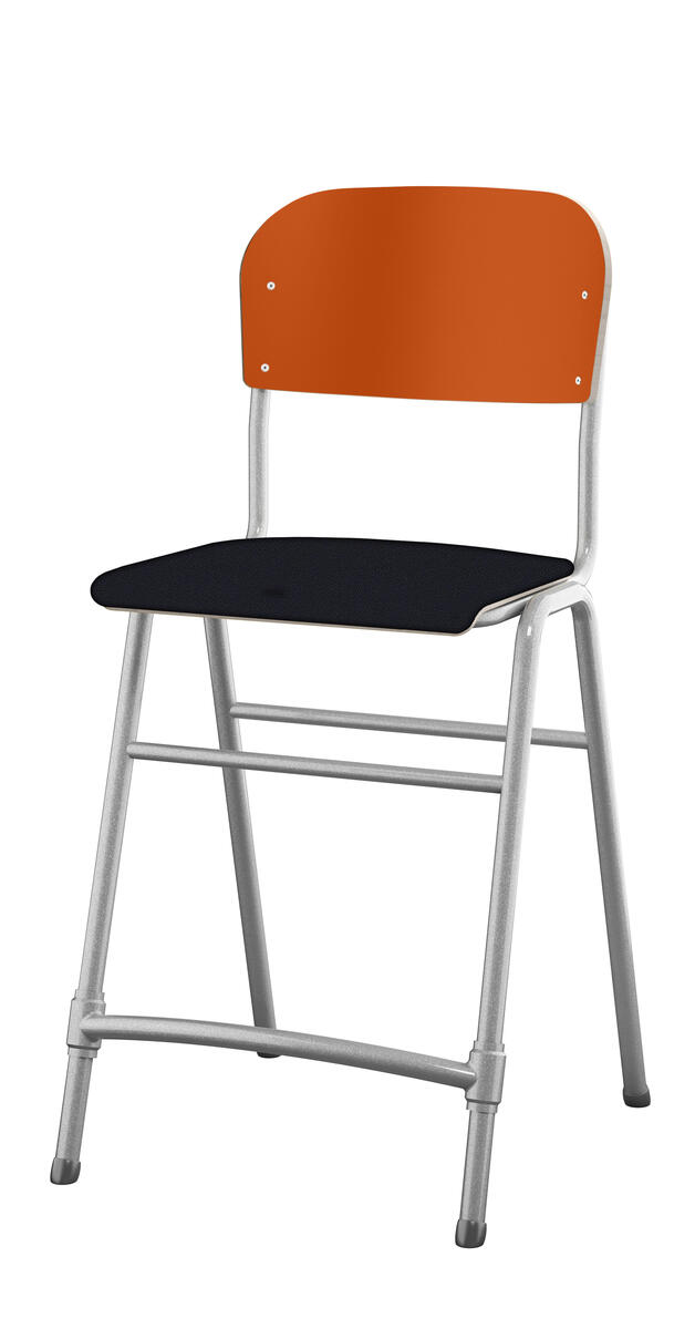 Stapelbar. Ljuddämpande tassar. Reglerbart fotstöd. Sitthöjd: 54 cm. Sitsmått: B36xD35 cm. Vikt 5,3 kg. Sits och rygg i högtryckslaminat. Silverlackerat stativ, RAL 9006.