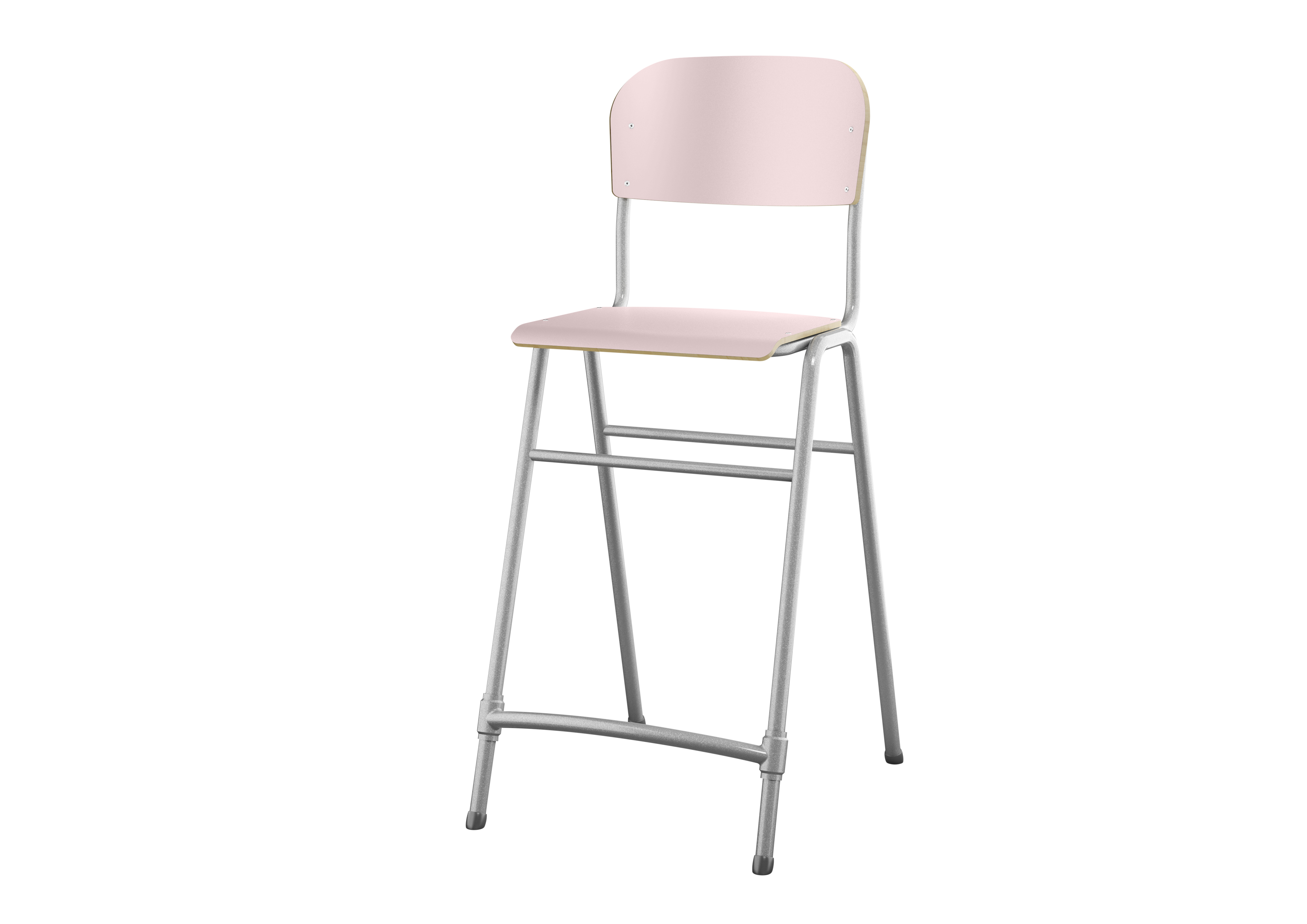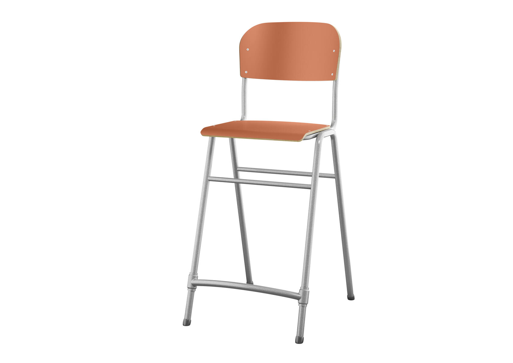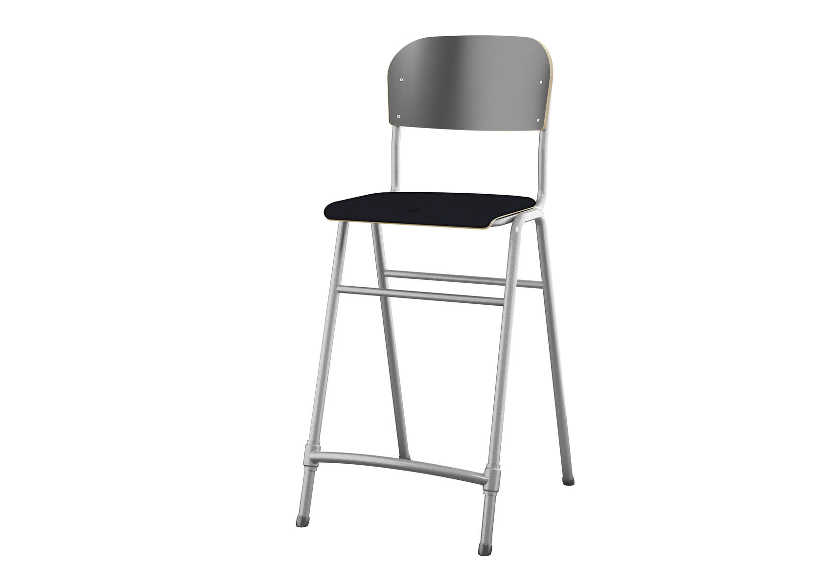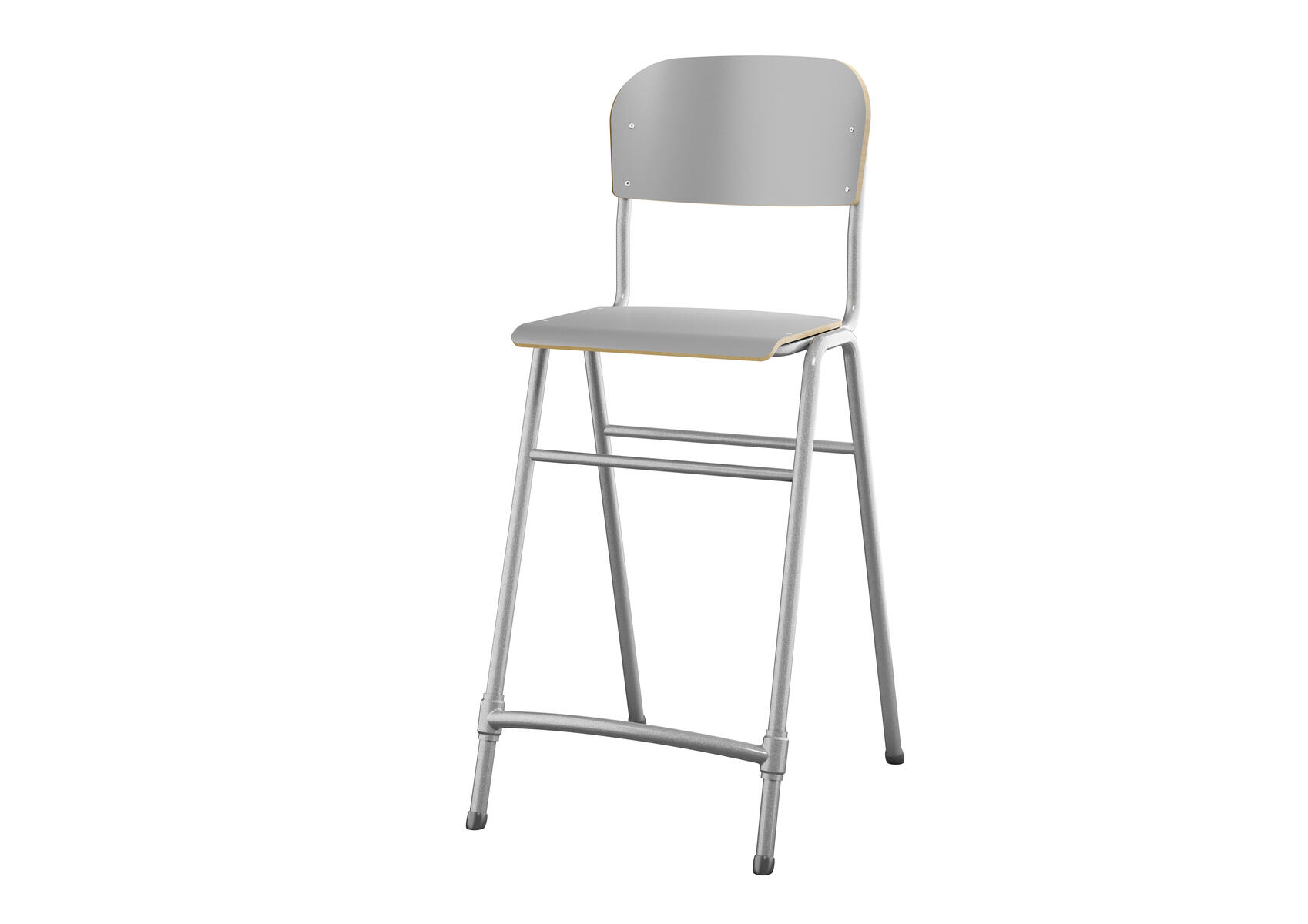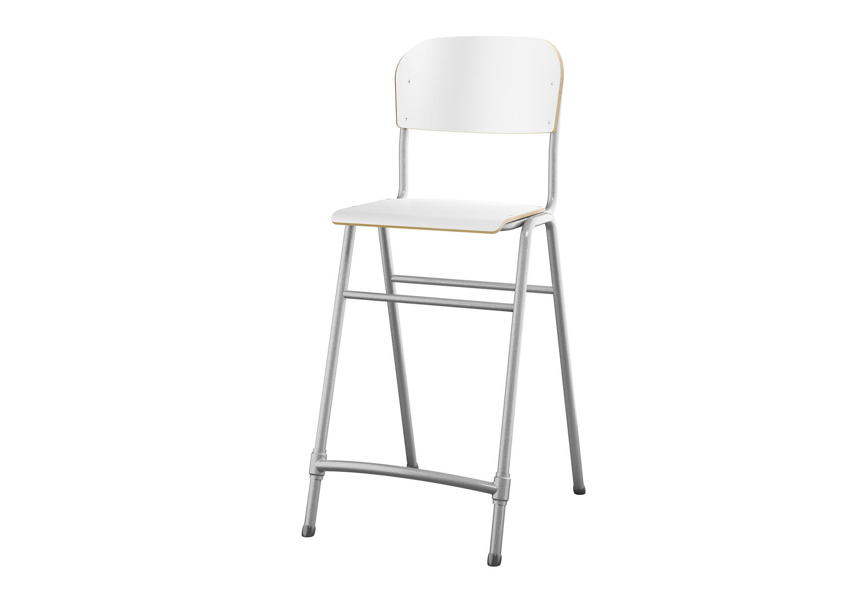 Stapelbar. Ljuddämpande tassar. Reglerbart fotstöd. Sitthöjd: 65 cm. Sitsmått: B36xD35 cm. Vikt 5,3 kg. Sits och rygg i högtryckslaminat. Silverlackerat stativ, RAL 9006.