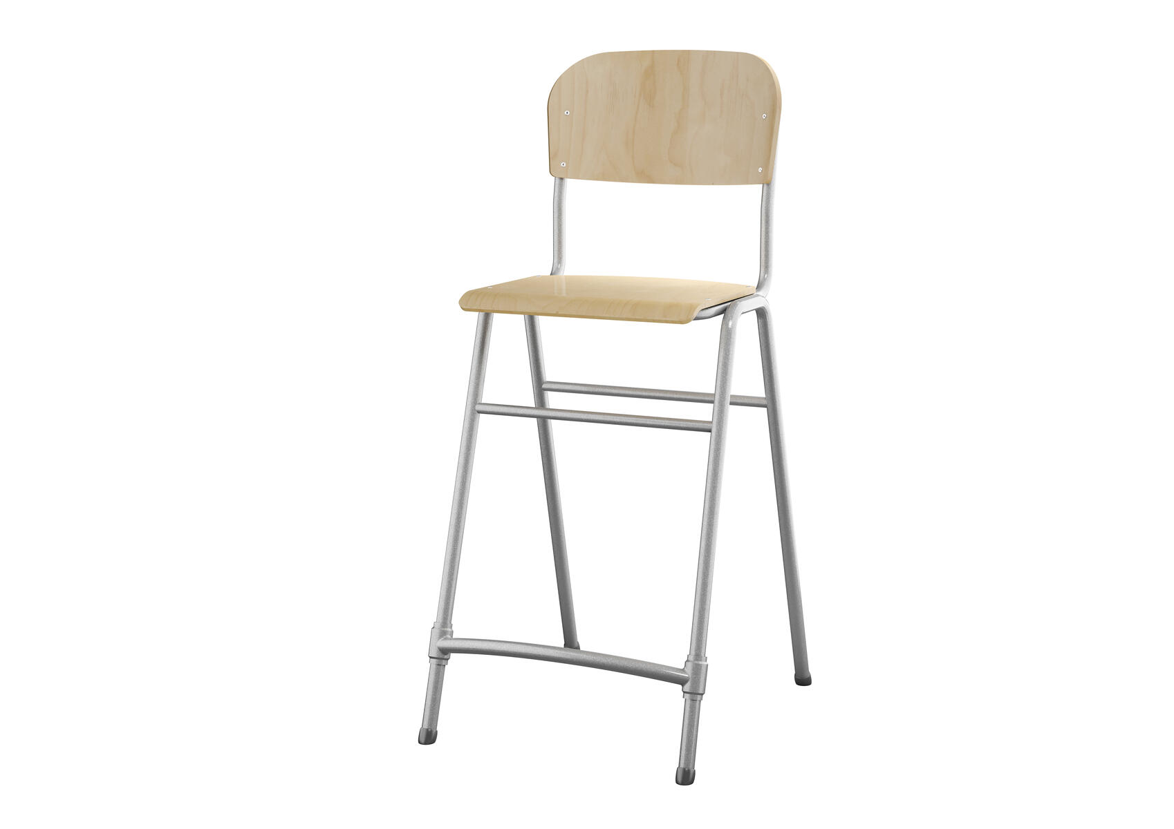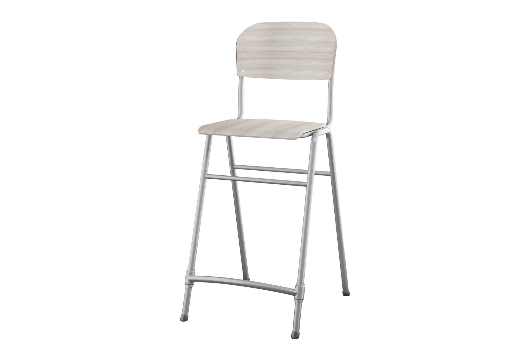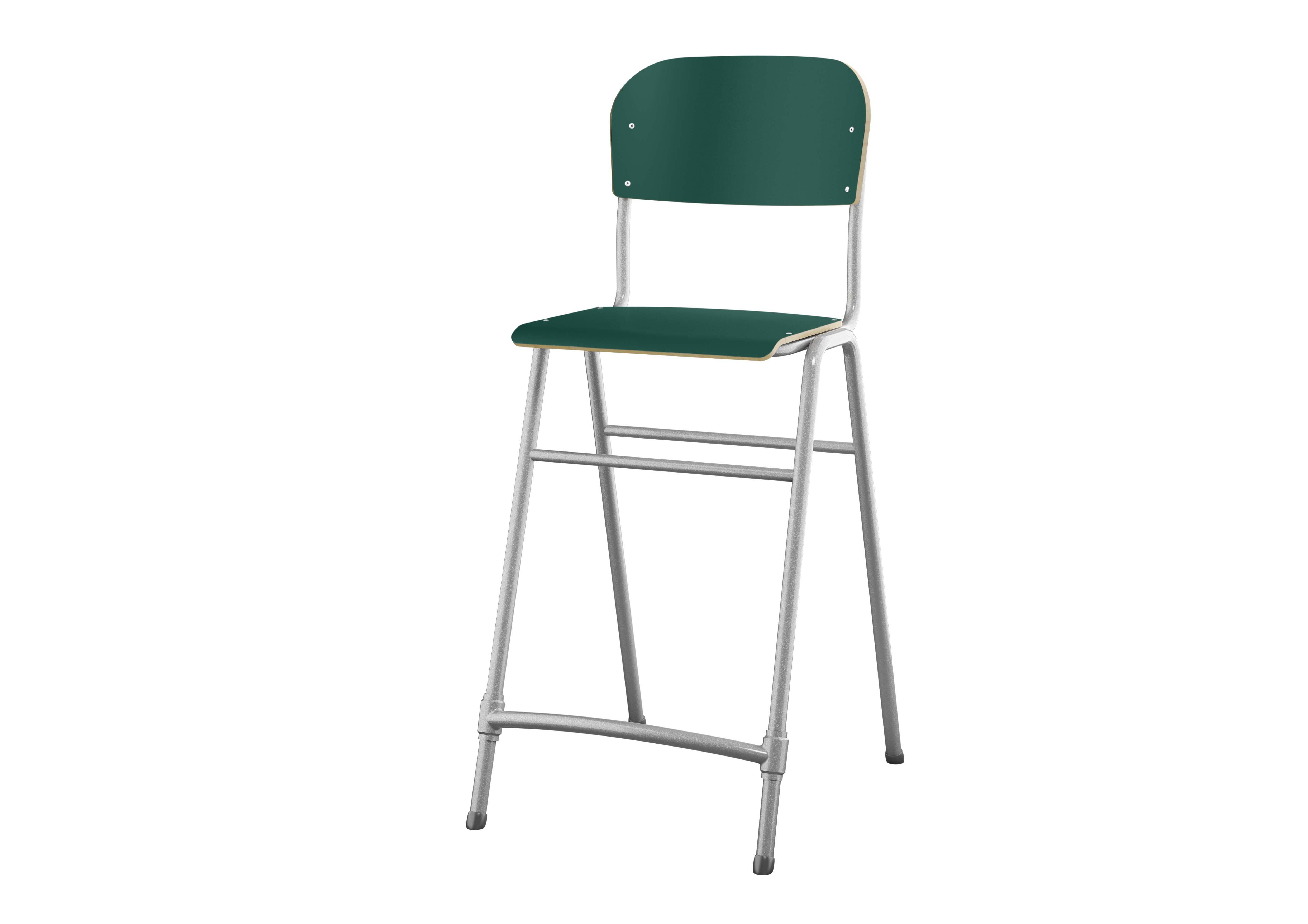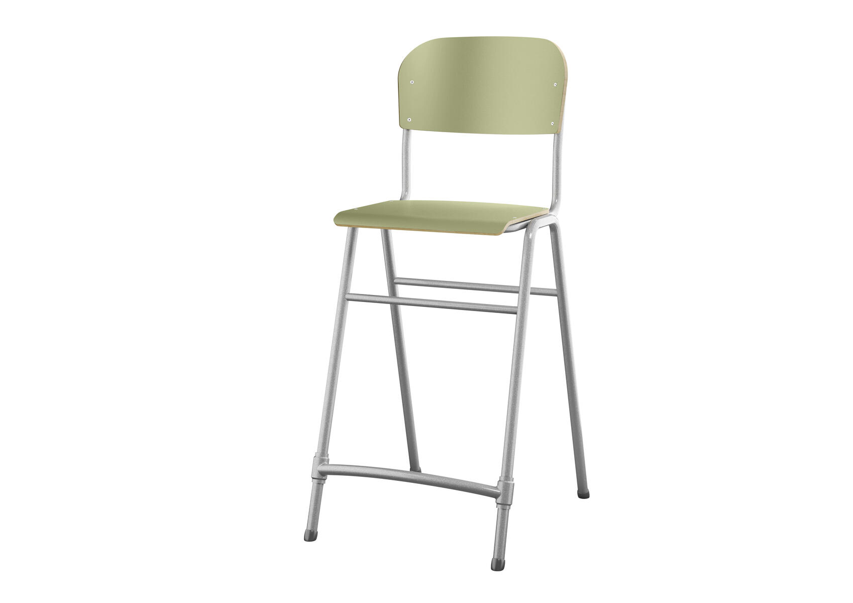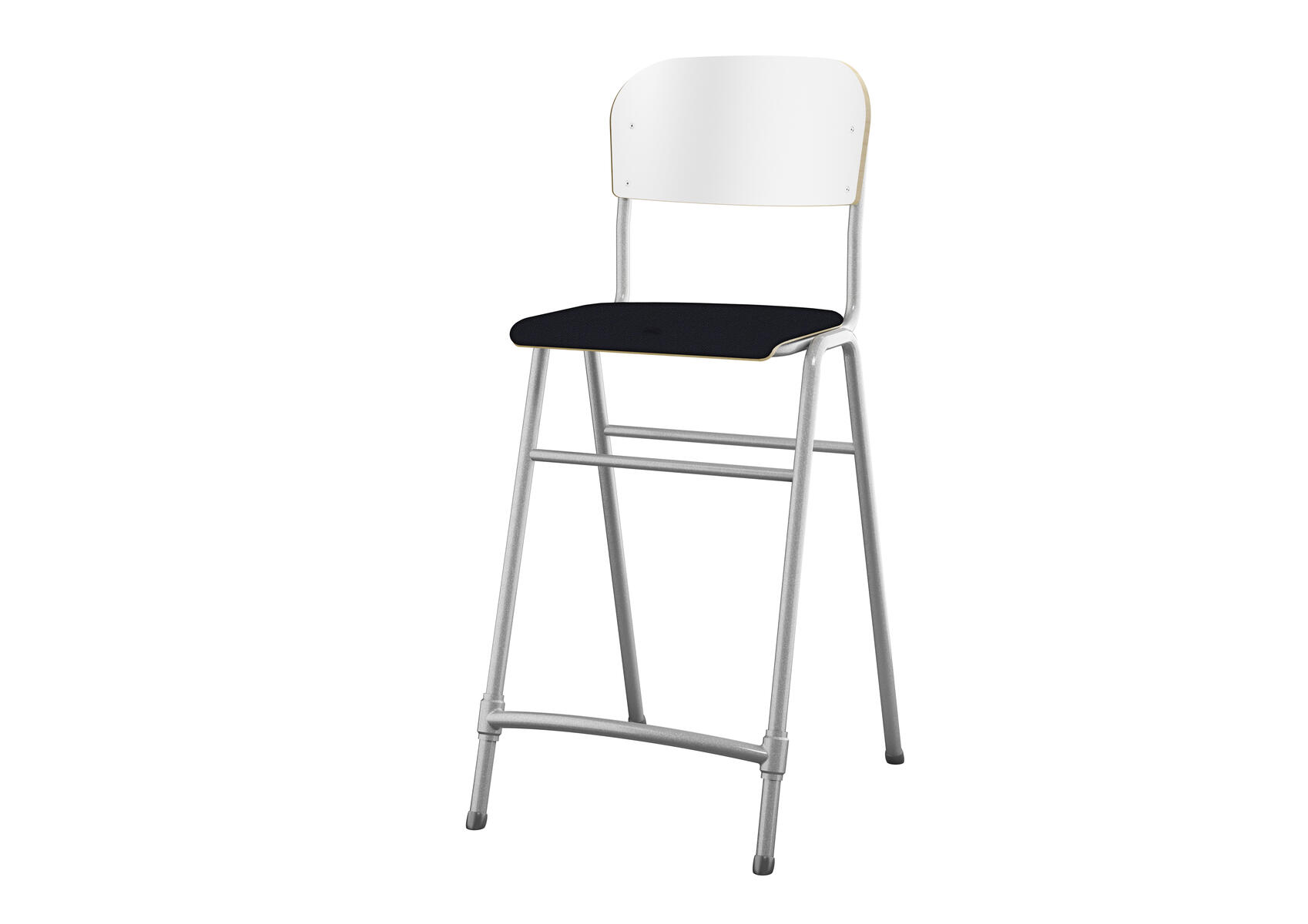 Stapelbar. Ljuddämpande tassar. Reglerbart fotstöd. Sitthöjd: 65 cm. Sitsmått: B36xD35 cm. Vikt 5,3 kg. Sits och rygg i högtryckslaminat. Silverlackerat stativ, RAL 9006.