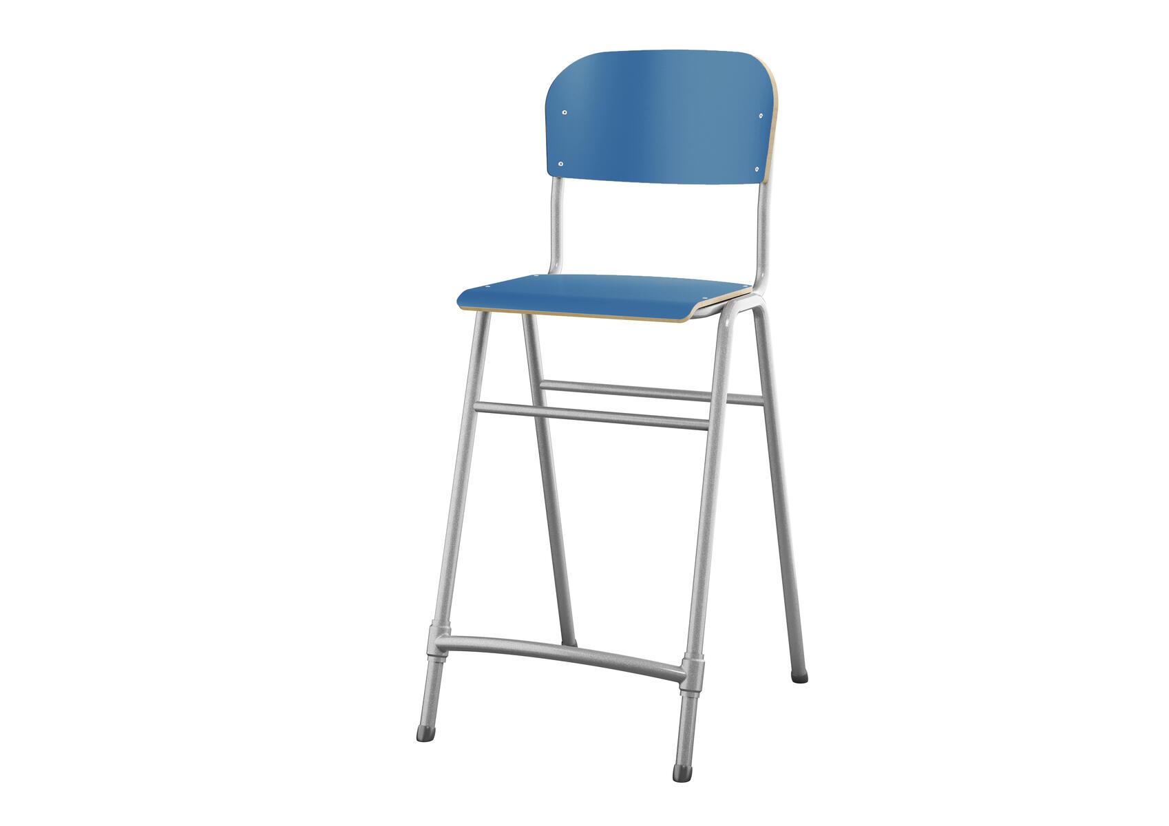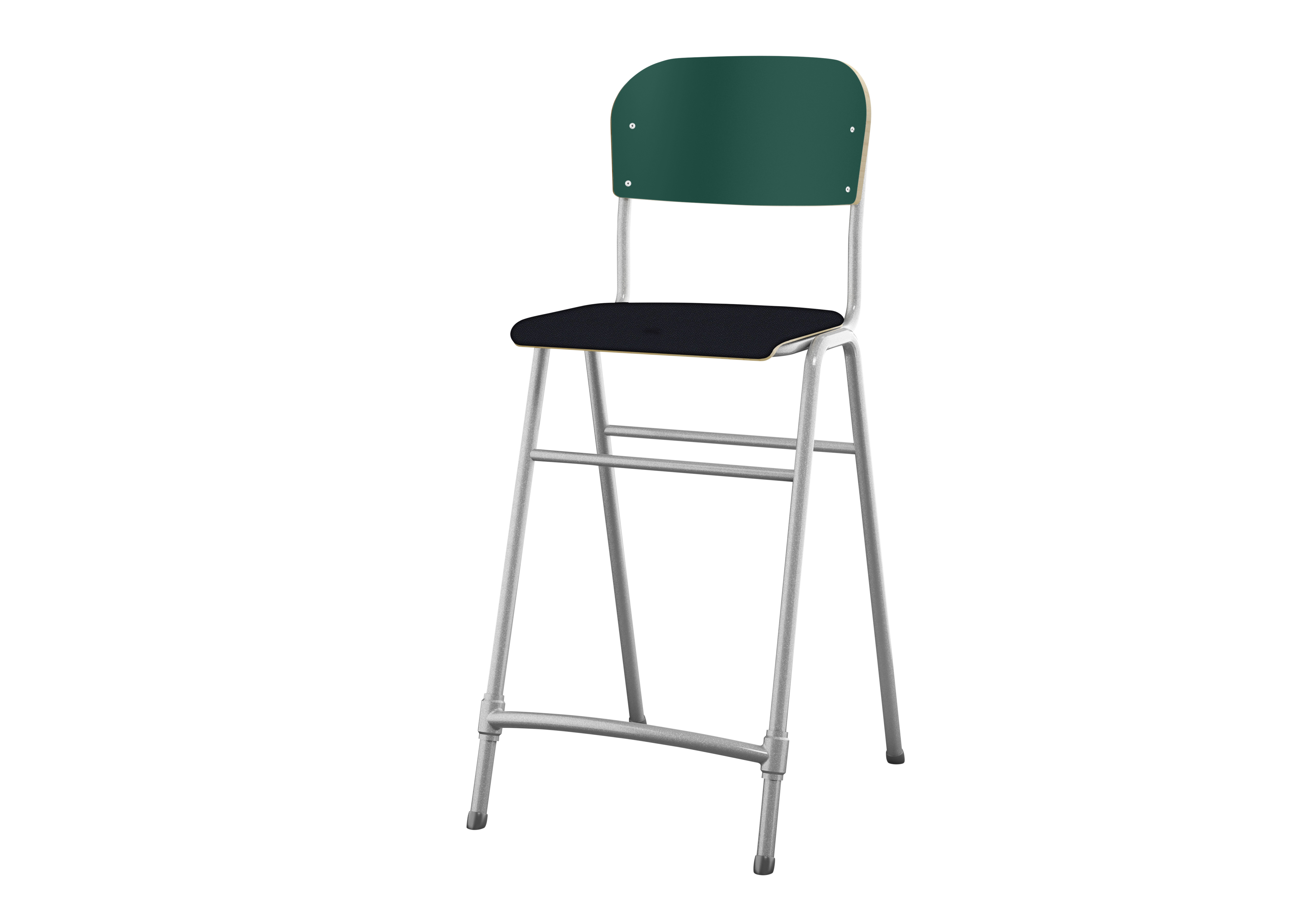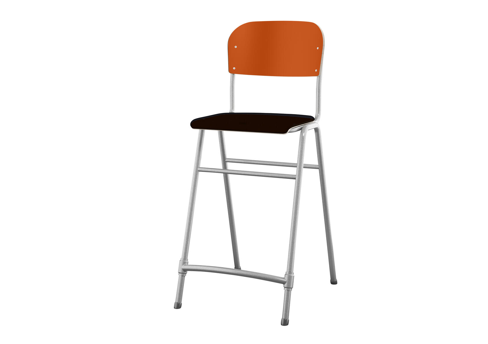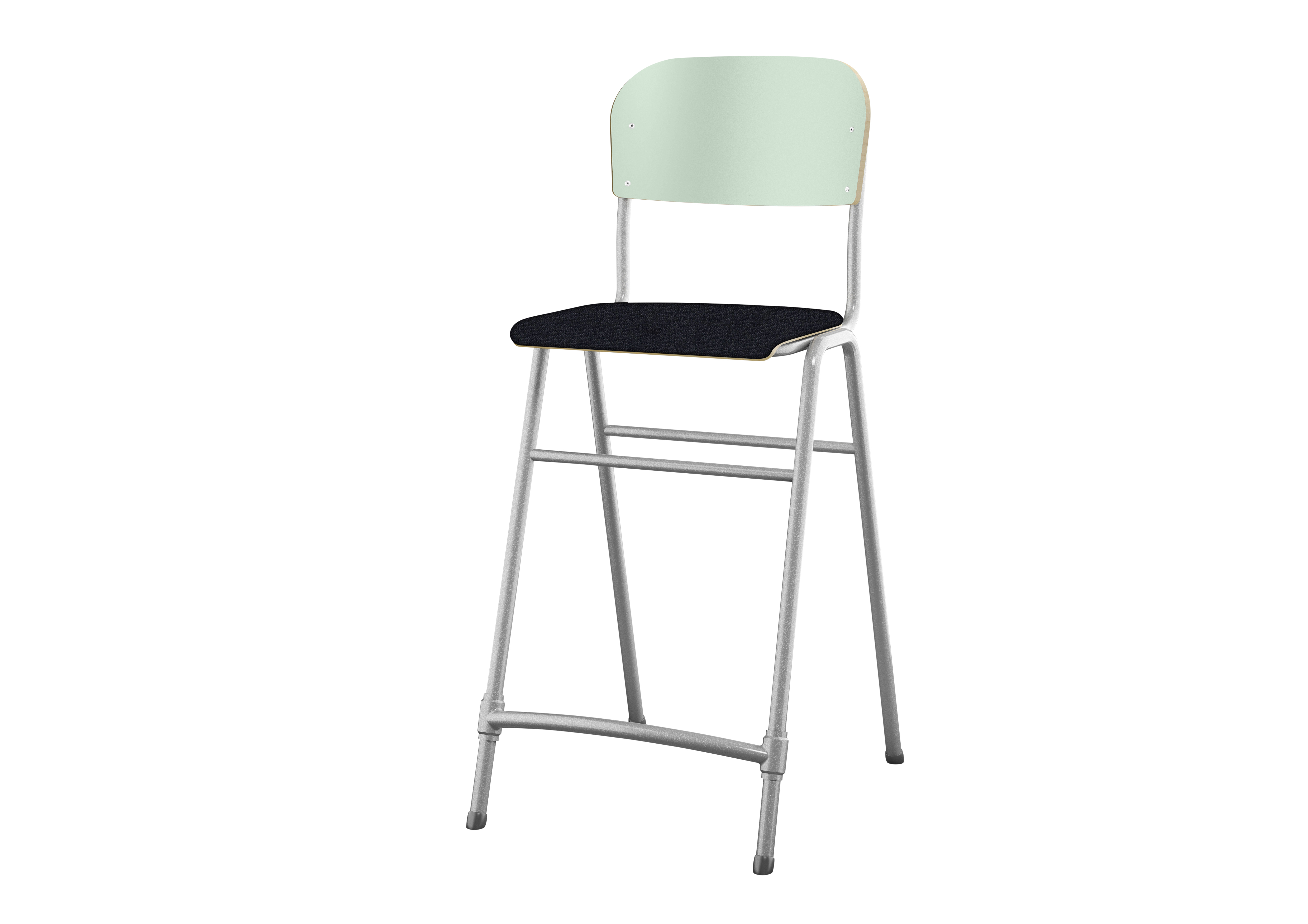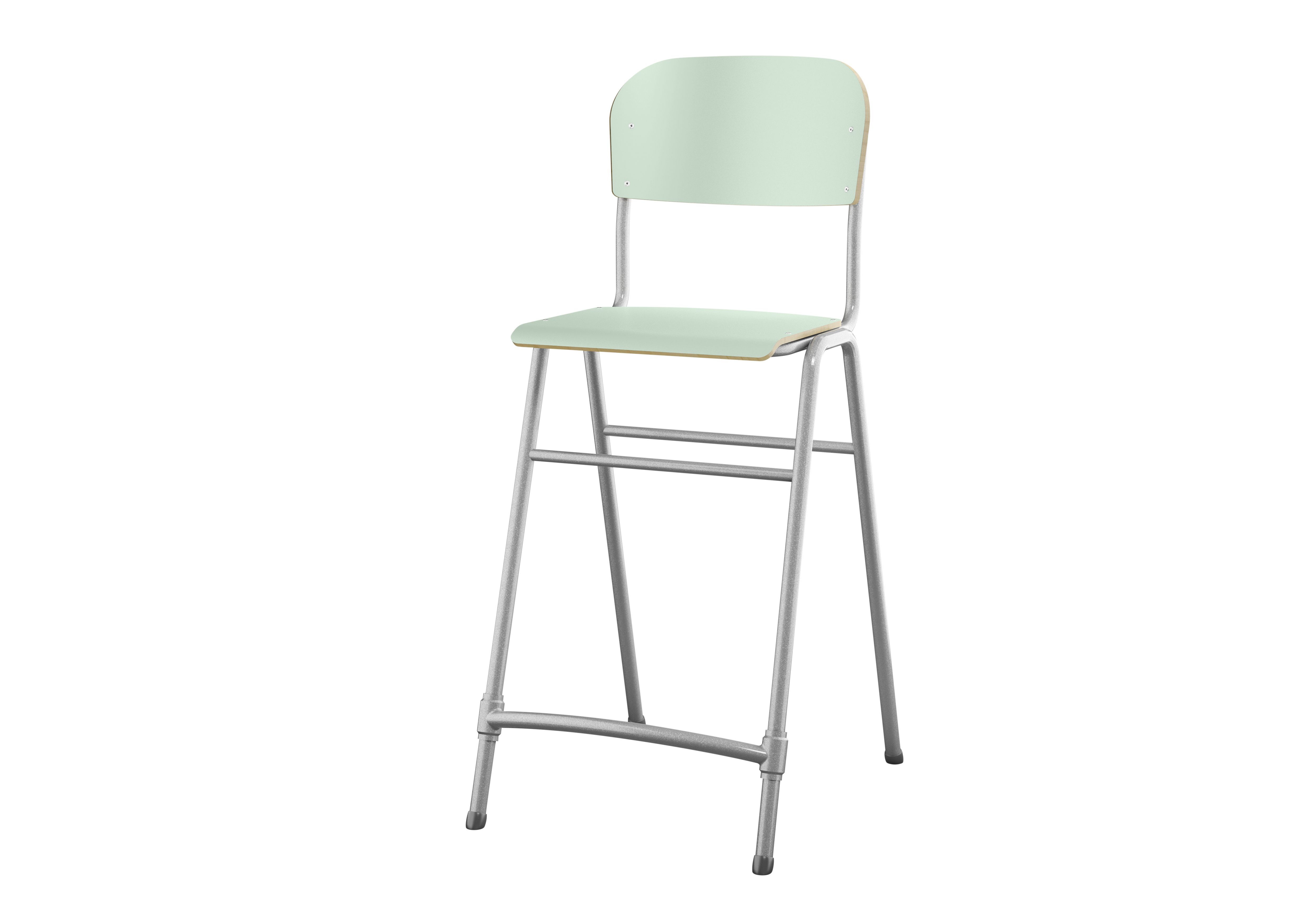 Stapelbar. Ljuddämpande tassar. Reglerbart fotstöd. Sitthöjd: 65 cm. Sitsmått: B36xD35 cm. Vikt 5,3 kg. Sits och rygg i högtryckslaminat. Silverlackerat stativ, RAL 9006.