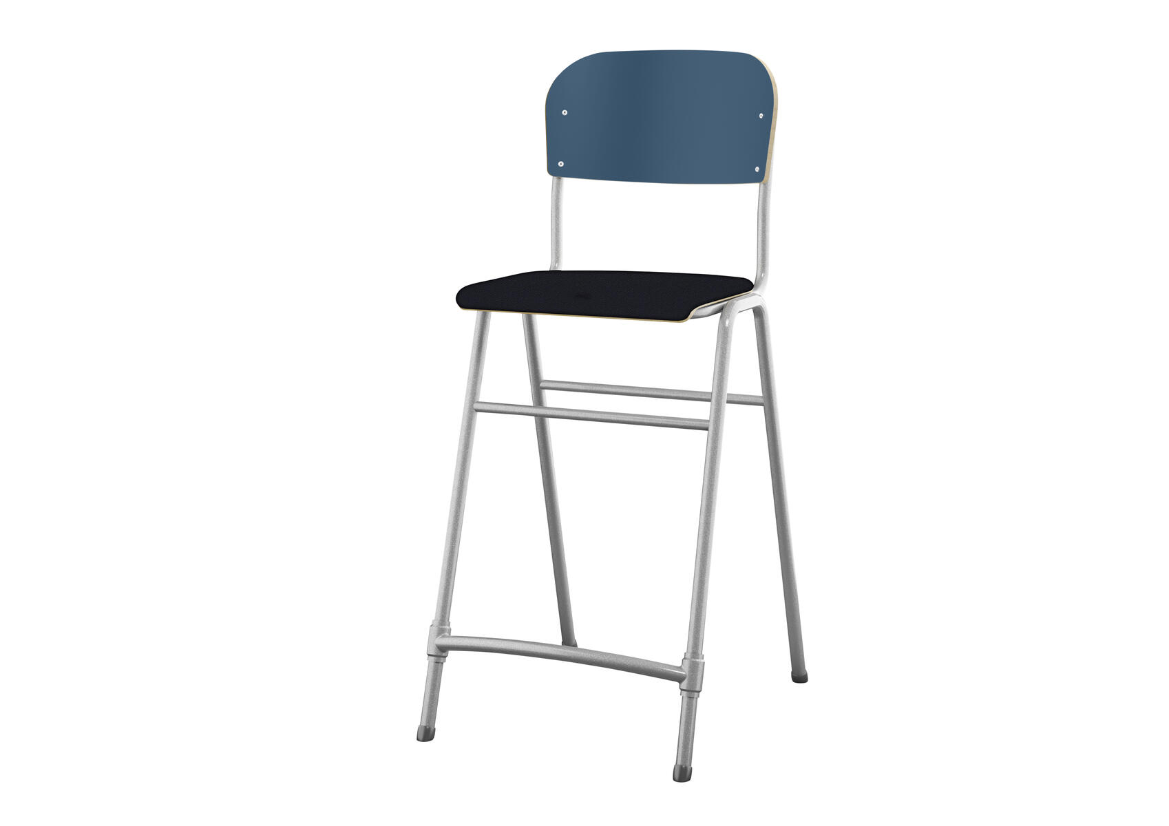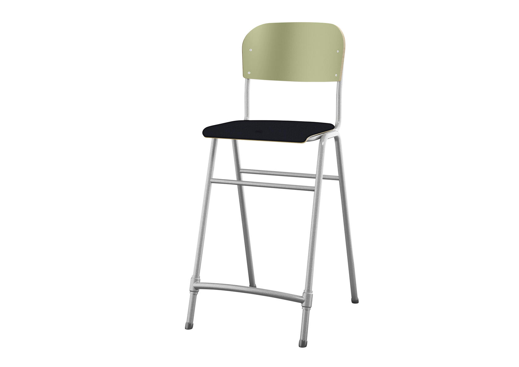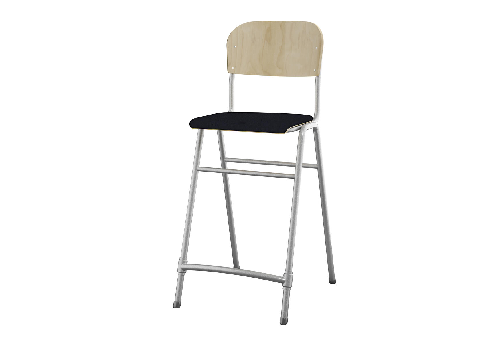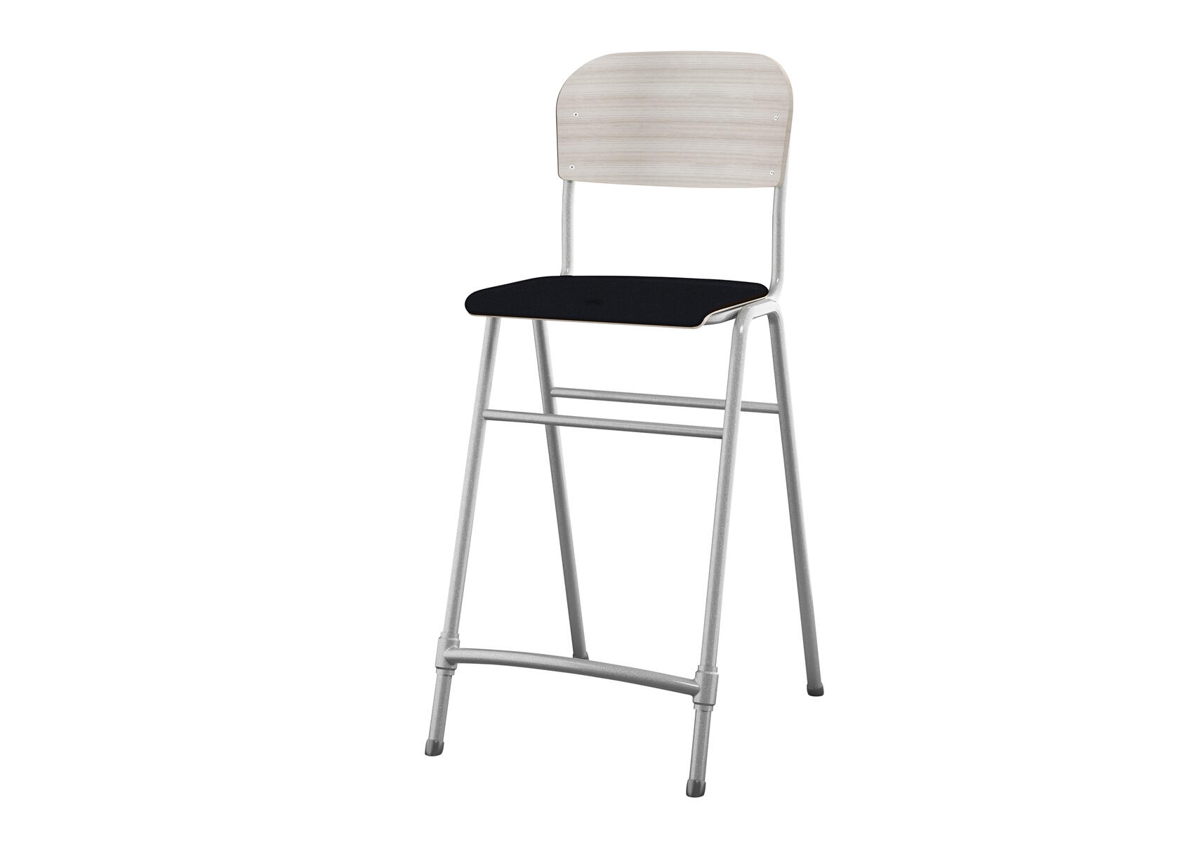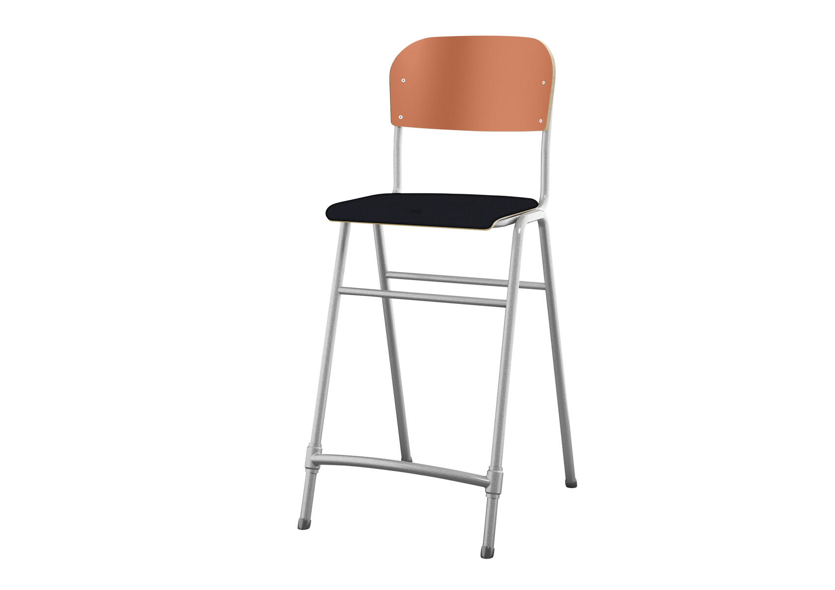 Stapelbar. Ljuddämpande tassar. Reglerbart fotstöd. Sitthöjd: 65 cm. Sitsmått: B36xD35 cm. Vikt 5,3 kg. Sits och rygg i högtryckslaminat. Silverlackerat stativ, RAL 9006.