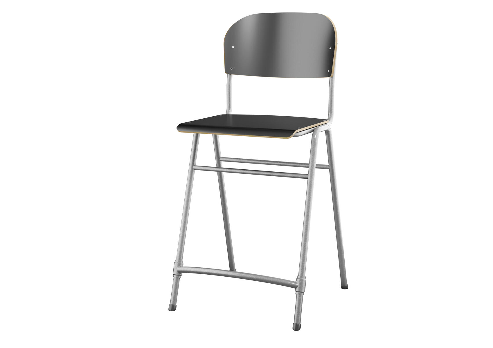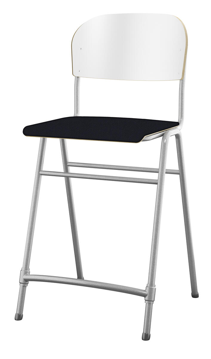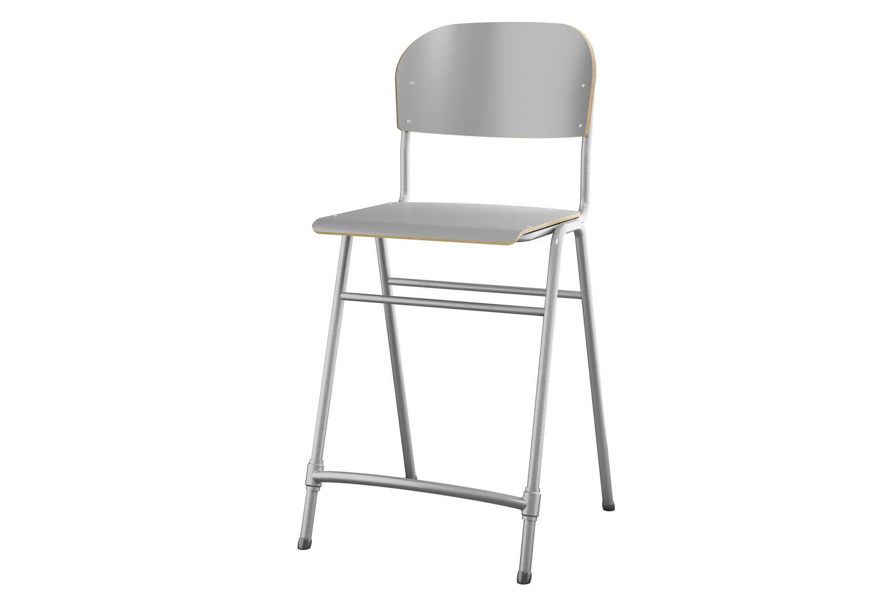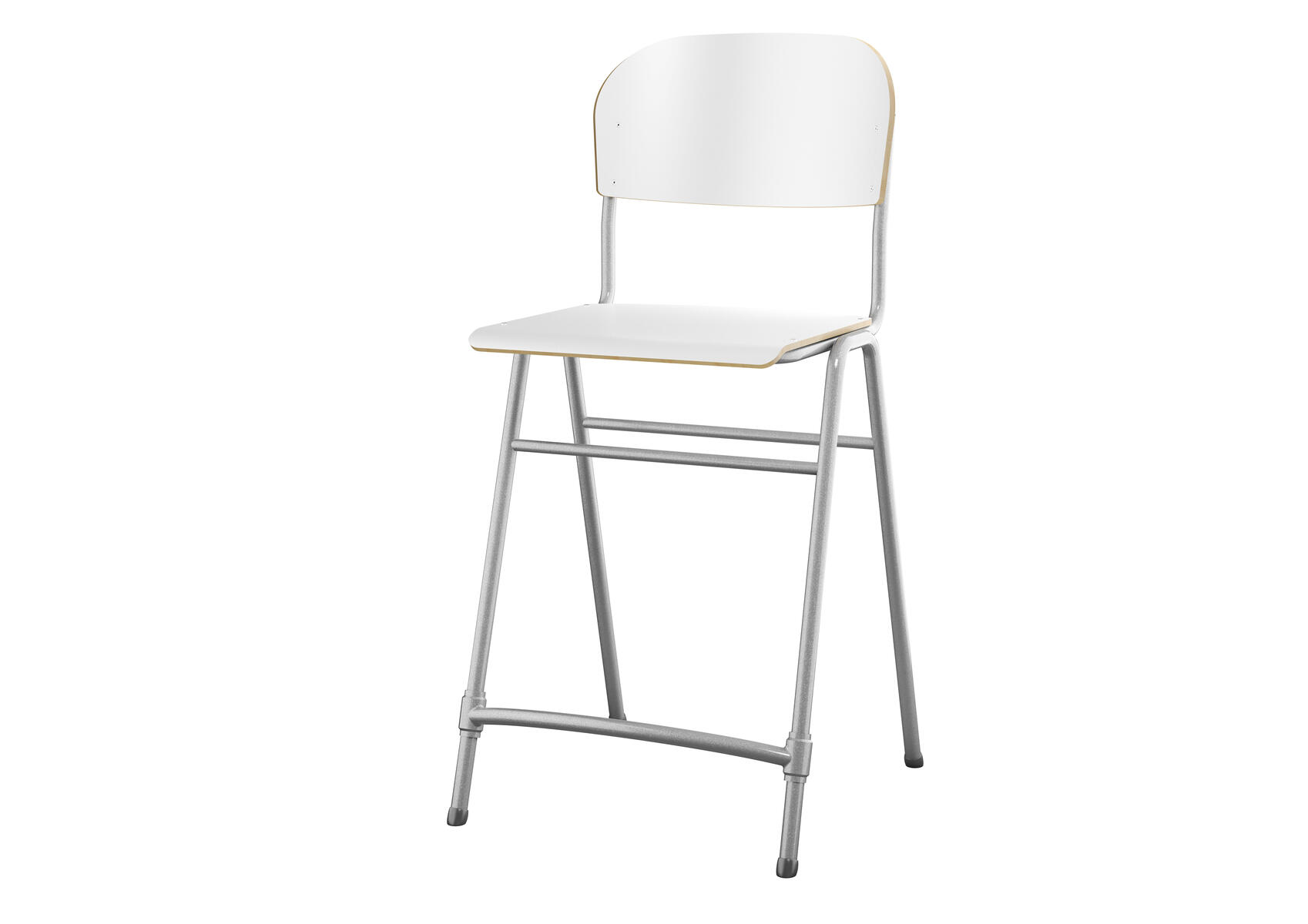 Stapelbar. Ljuddämpande tassar. Reglerbart fotstöd. Sitthöjd: 65 cm. Sitsmått: B36xD35 cm. Vikt 5,3 kg. Sits och rygg i högtryckslaminat. Silverlackerat stativ, RAL 9006. Valbar med sits klädd i tyg Xtreme Padang YS145 (100 % polyester).