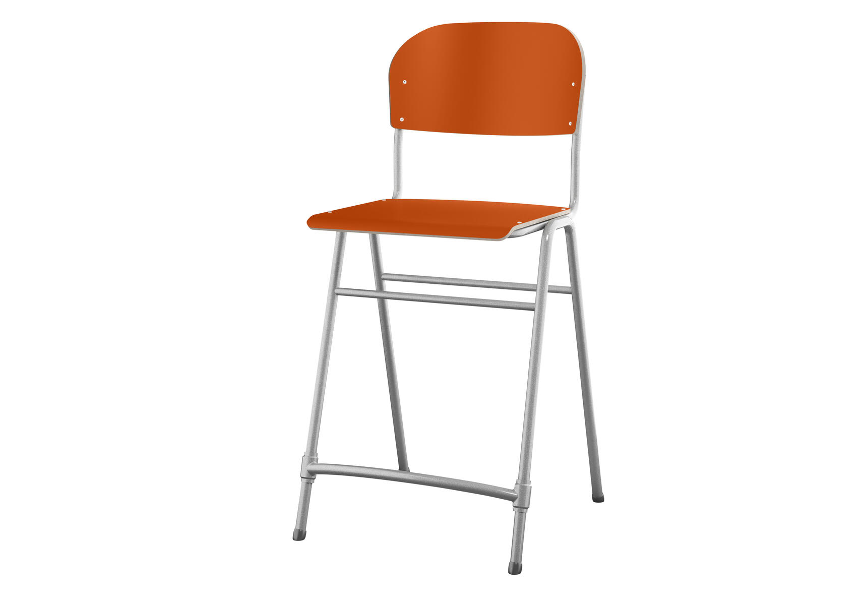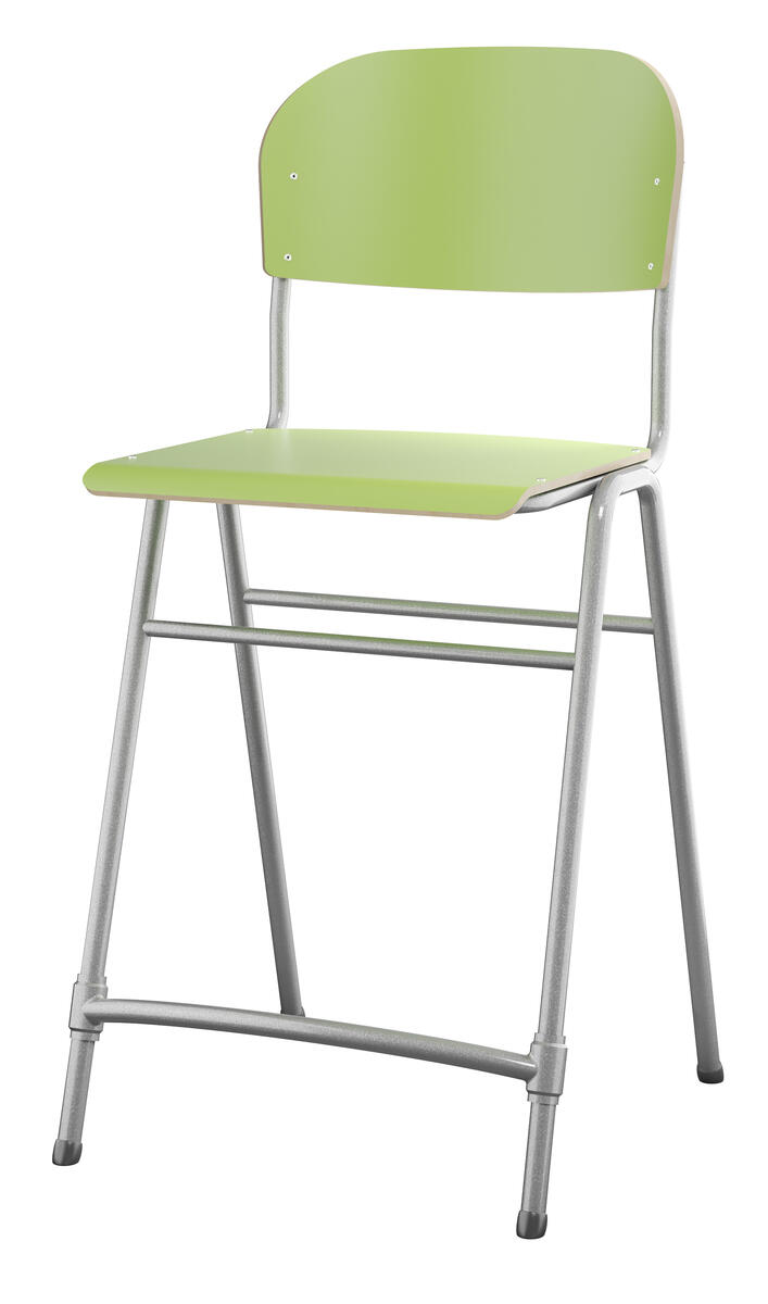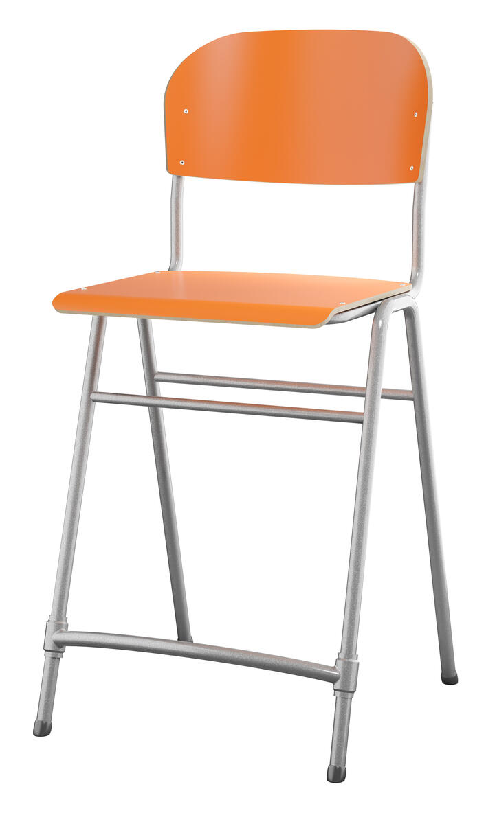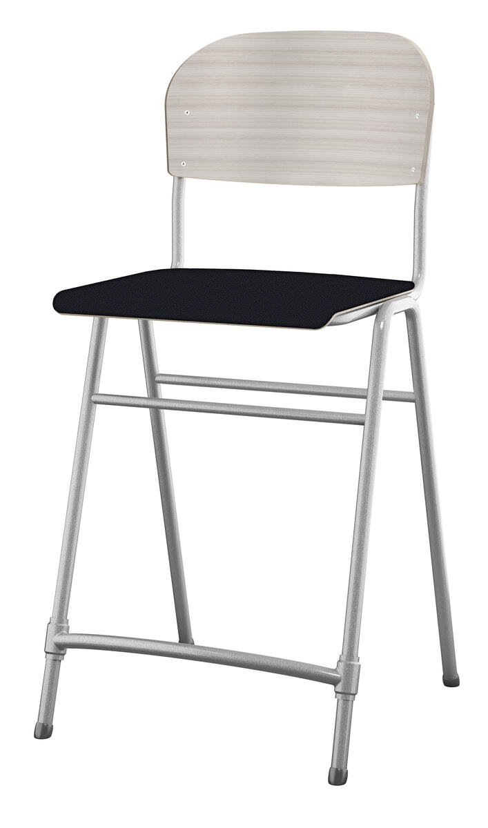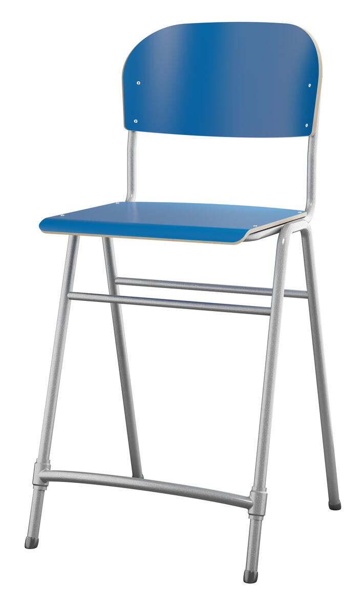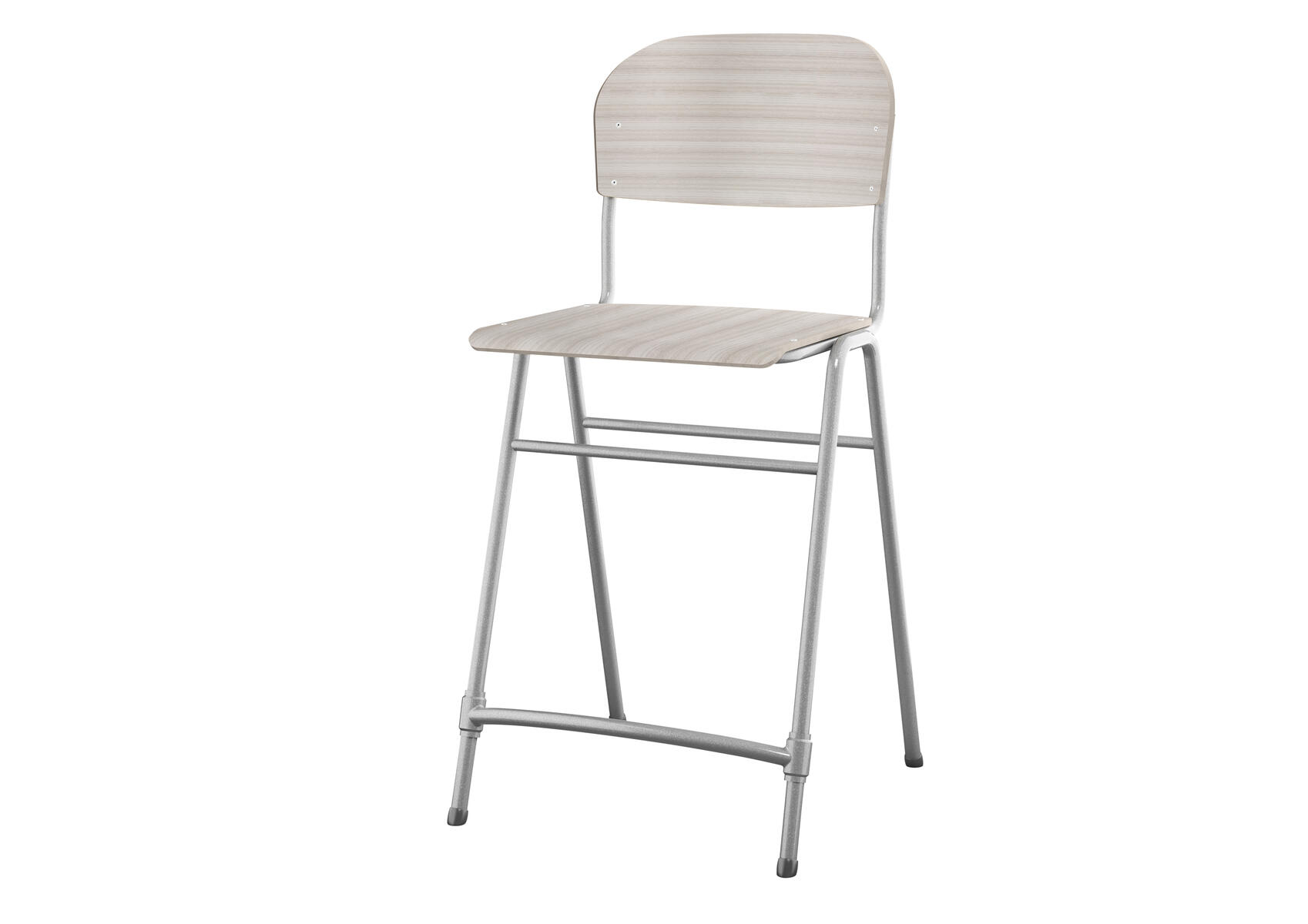 Stapelbar. Ljuddämpande tassar. Reglerbart fotstöd. Sitthöjd: 65 cm. Sitsmått: B36xD35 cm. Vikt 5,3 kg. Sits och rygg i högtryckslaminat. Silverlackerat stativ, RAL 9006. Valbar med sits klädd i tyg Xtreme Padang YS145 (100 % polyester).