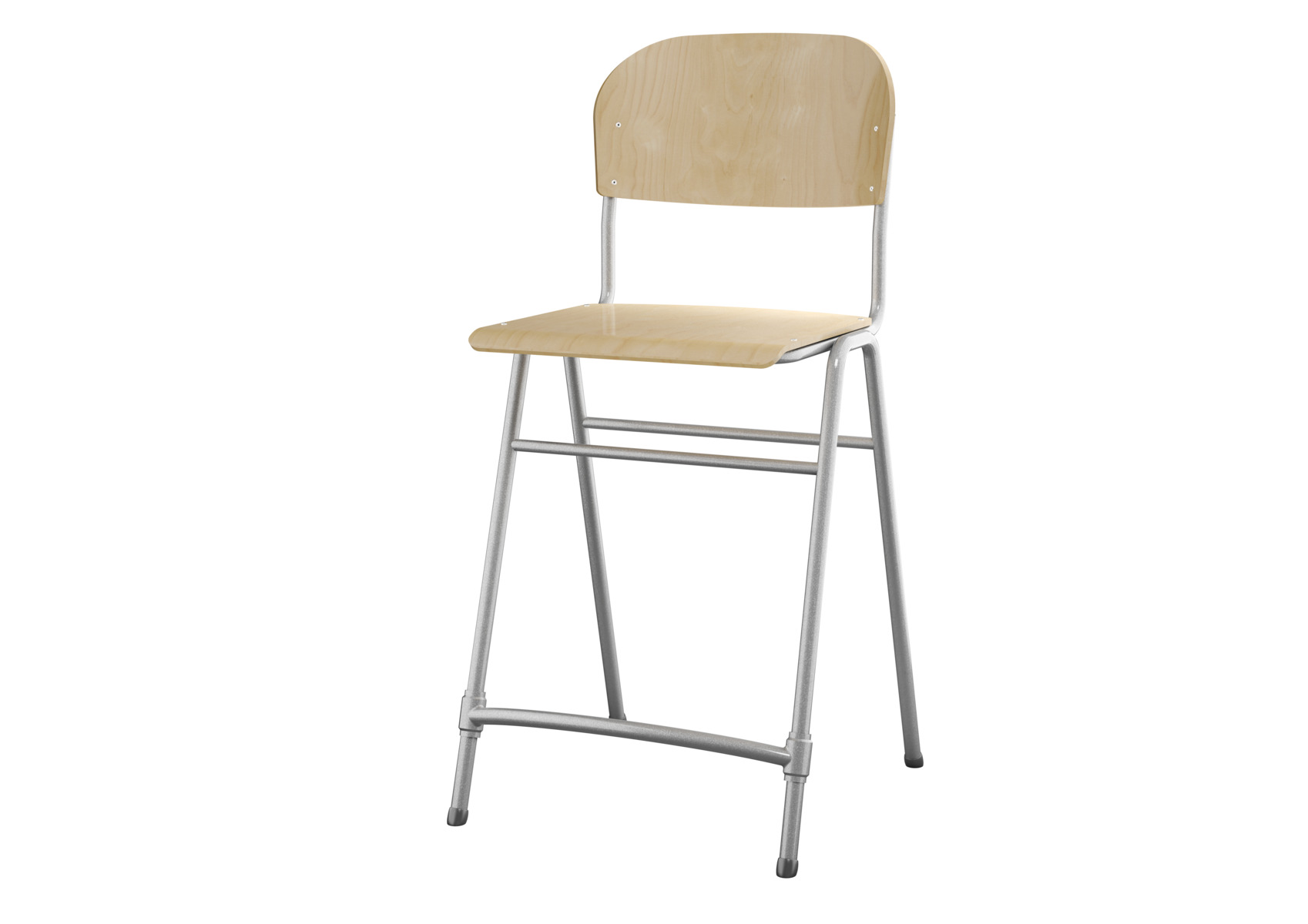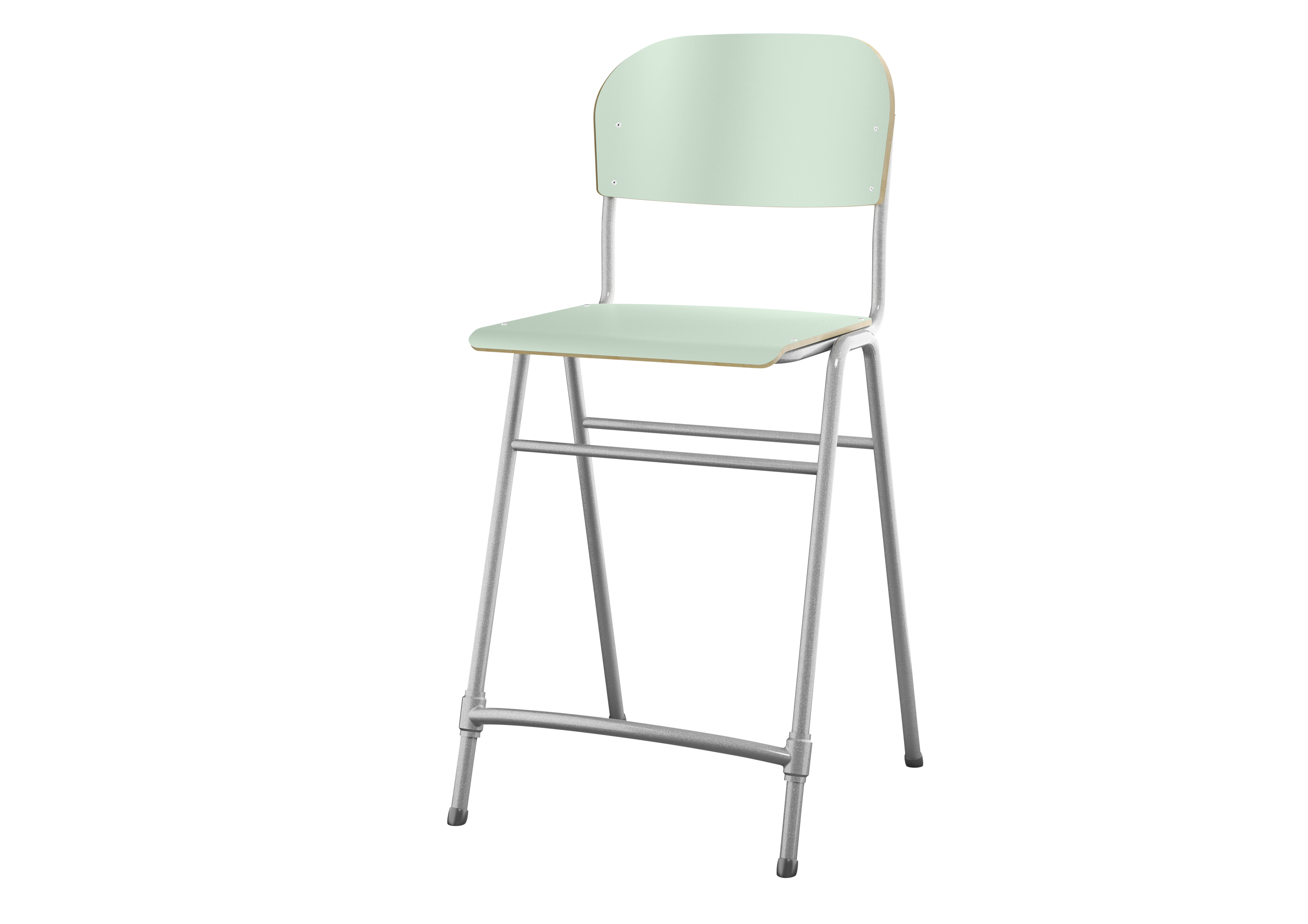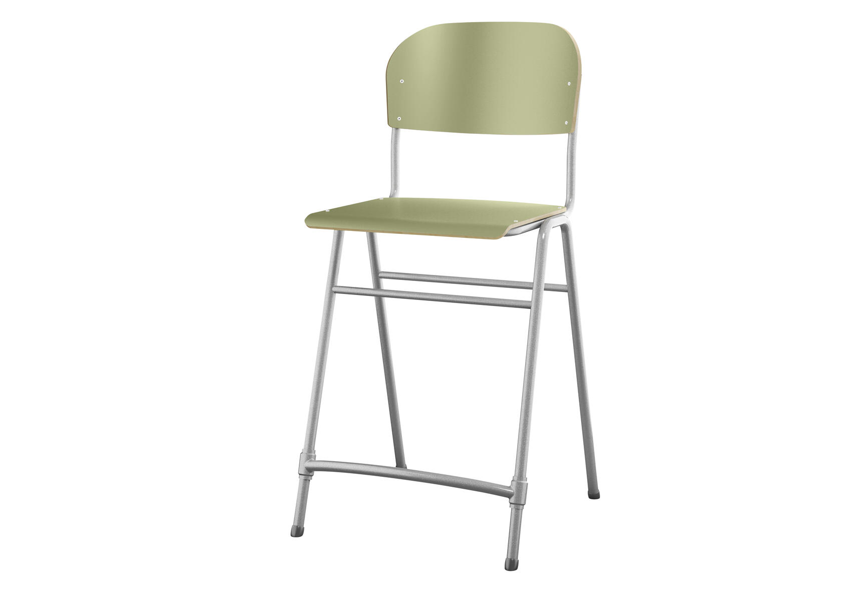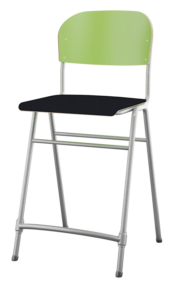Stapelbar. Ljuddämpande tassar. Reglerbart fotstöd. Sitthöjd: 65 cm. Sitsmått: B36xD35 cm. Vikt 5,3 kg. Sits och rygg i högtryckslaminat. Silverlackerat stativ, RAL 9006. Valbar med sits klädd i tyg Xtreme Padang YS145 (100 % polyester).