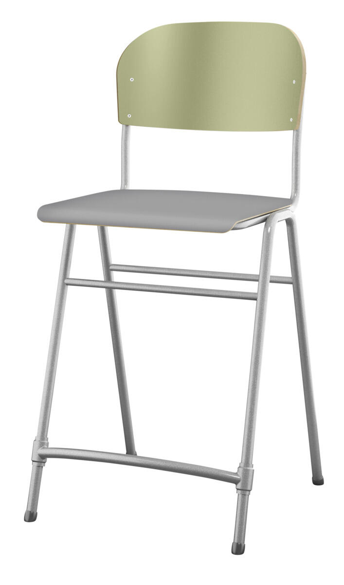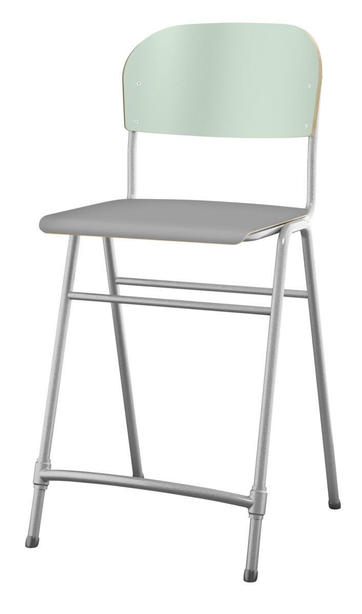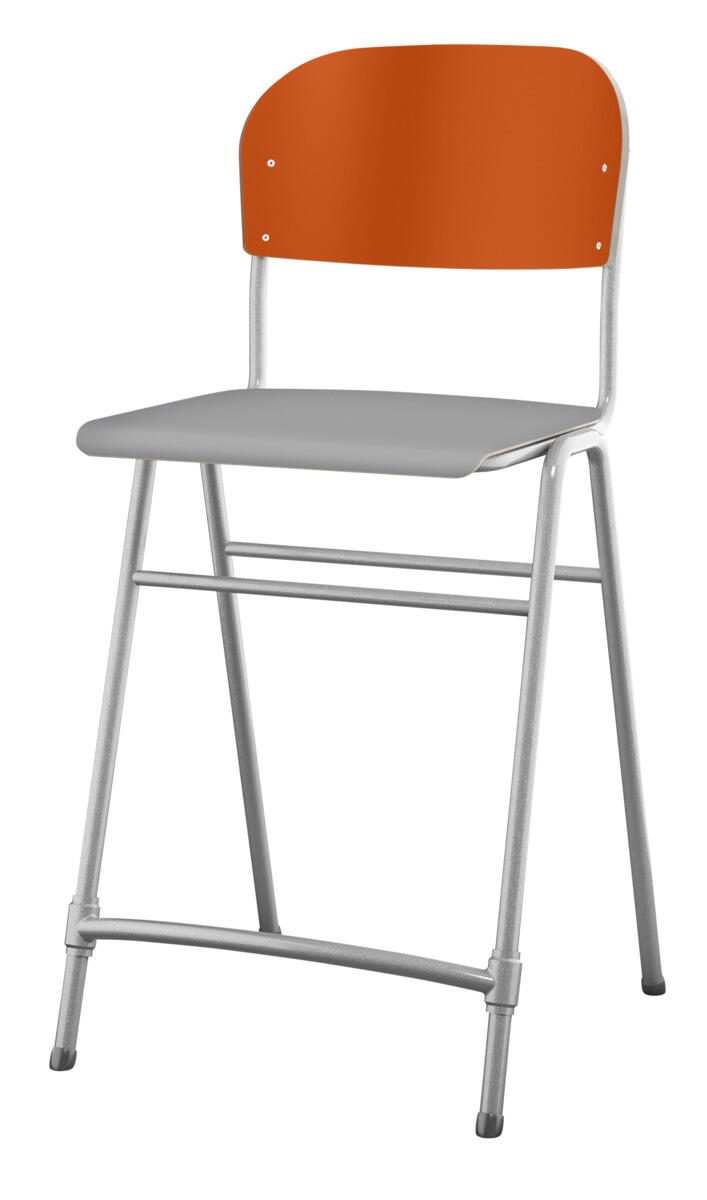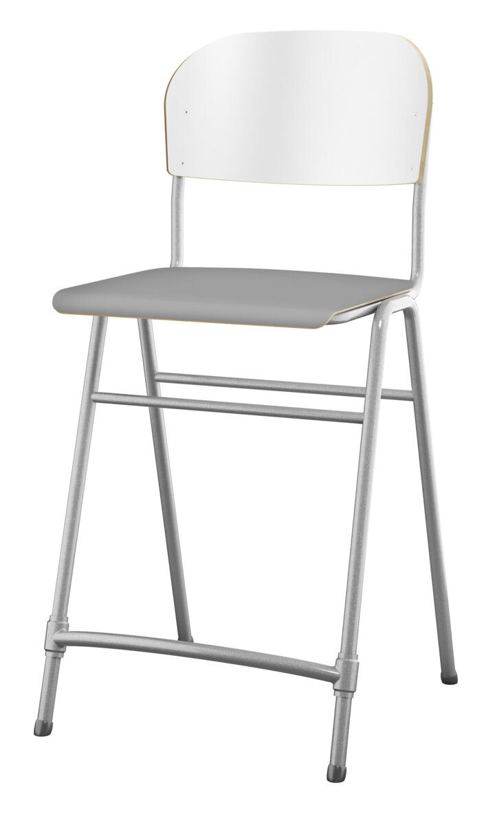 Stapelbar (max 4 st/stapel). Ljuddämpande tassar. Upphängningsbar på bord. Reglerbar fotbräda i 3 fasta lägen. Sitthöjd 50 cm. Sitsmått: B36xD35 cm. Totaldjupet på stativet är 54 cm. Vikt 4,6 kg. Sits och rygg i högtryckslaminat. Silverlackerat stativ, RAL 9006.