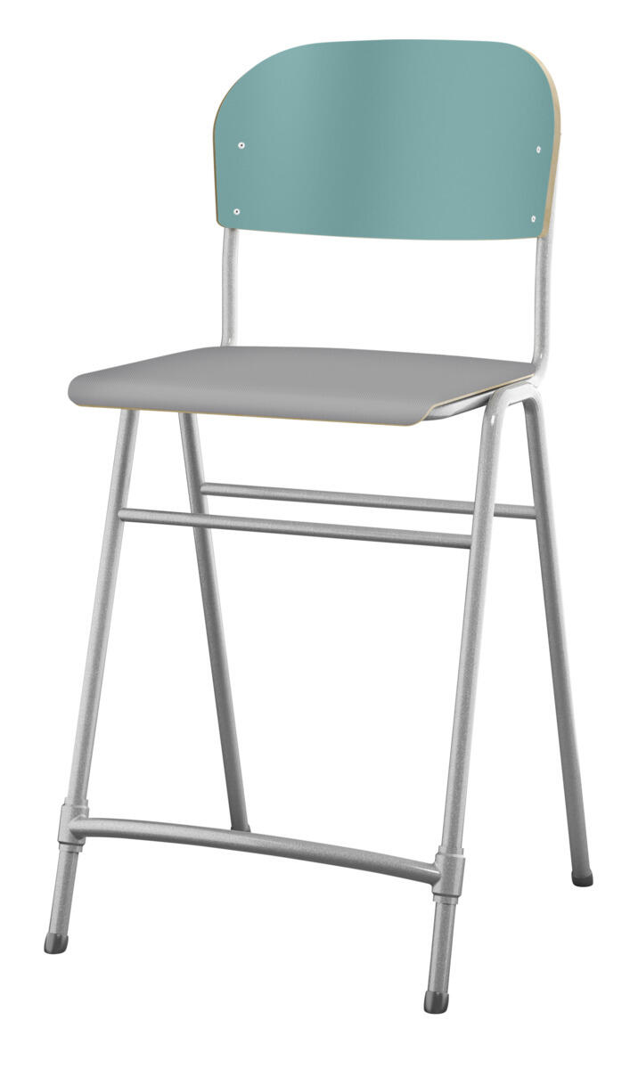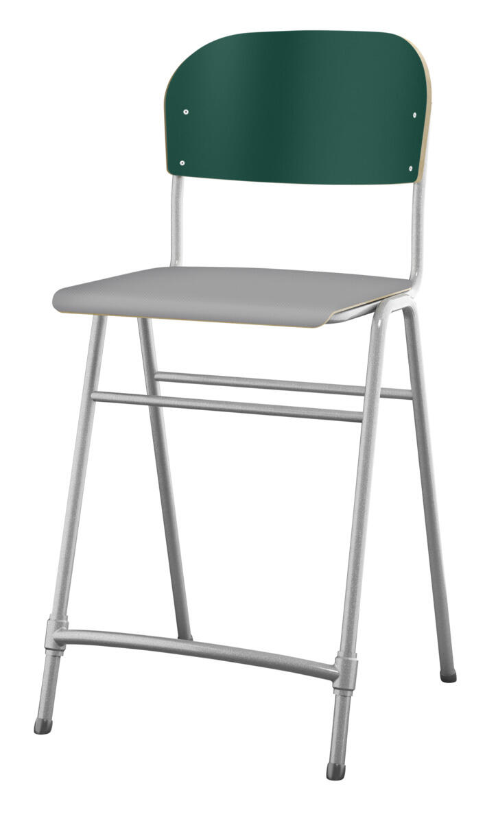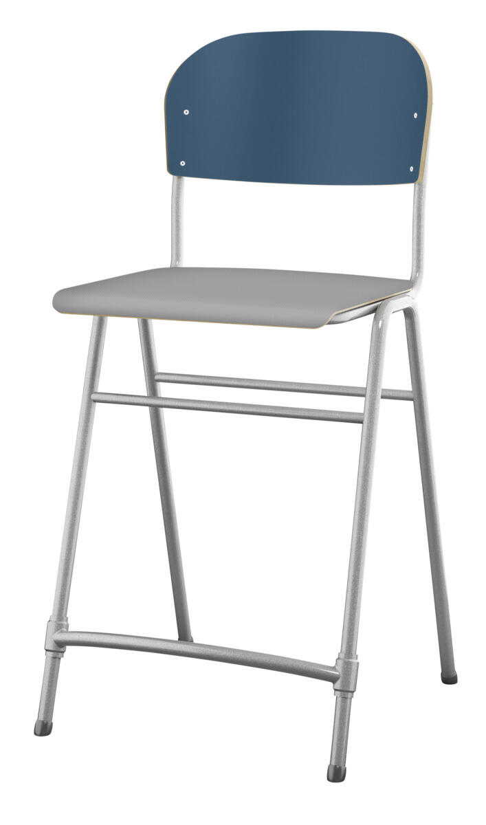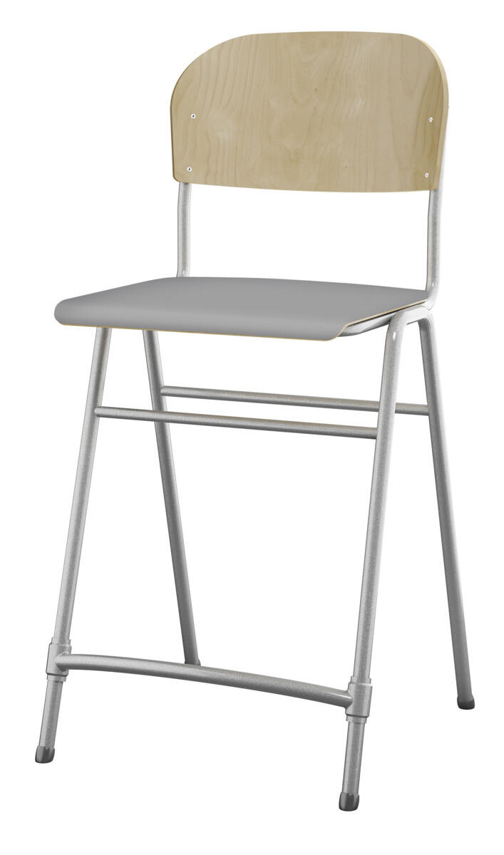 Stapelbar (max 4 st/stapel). Ljuddämpande tassar. Upphängningsbar på bord. Reglerbar fotbräda i 3 fasta lägen. Sitthöjd 50 cm. Sitsmått: B36xD35 cm. Totaldjupet på stativet är 54 cm. Vikt 4,6 kg. Sits och rygg i högtryckslaminat. Silverlackerat stativ, RAL 9006.
