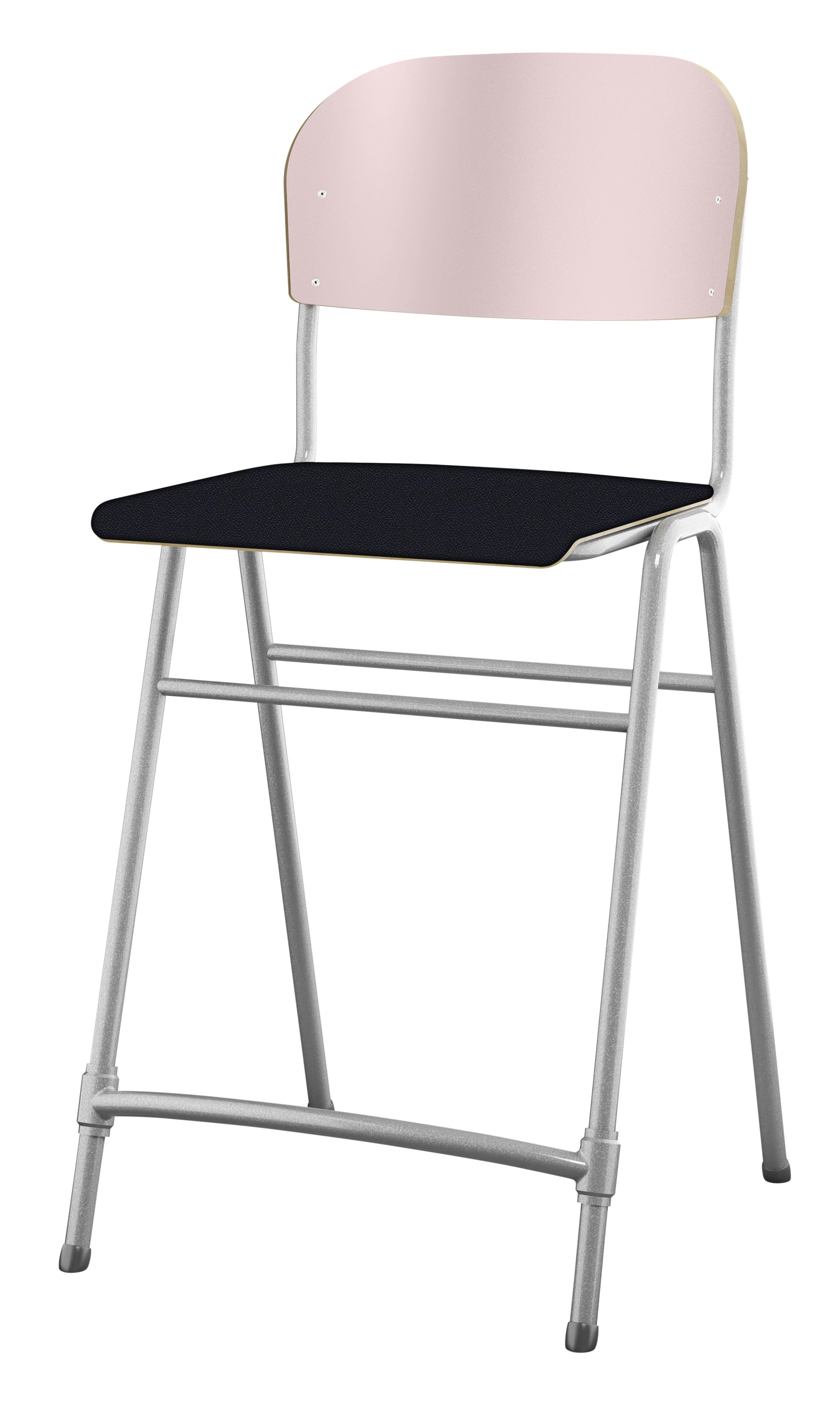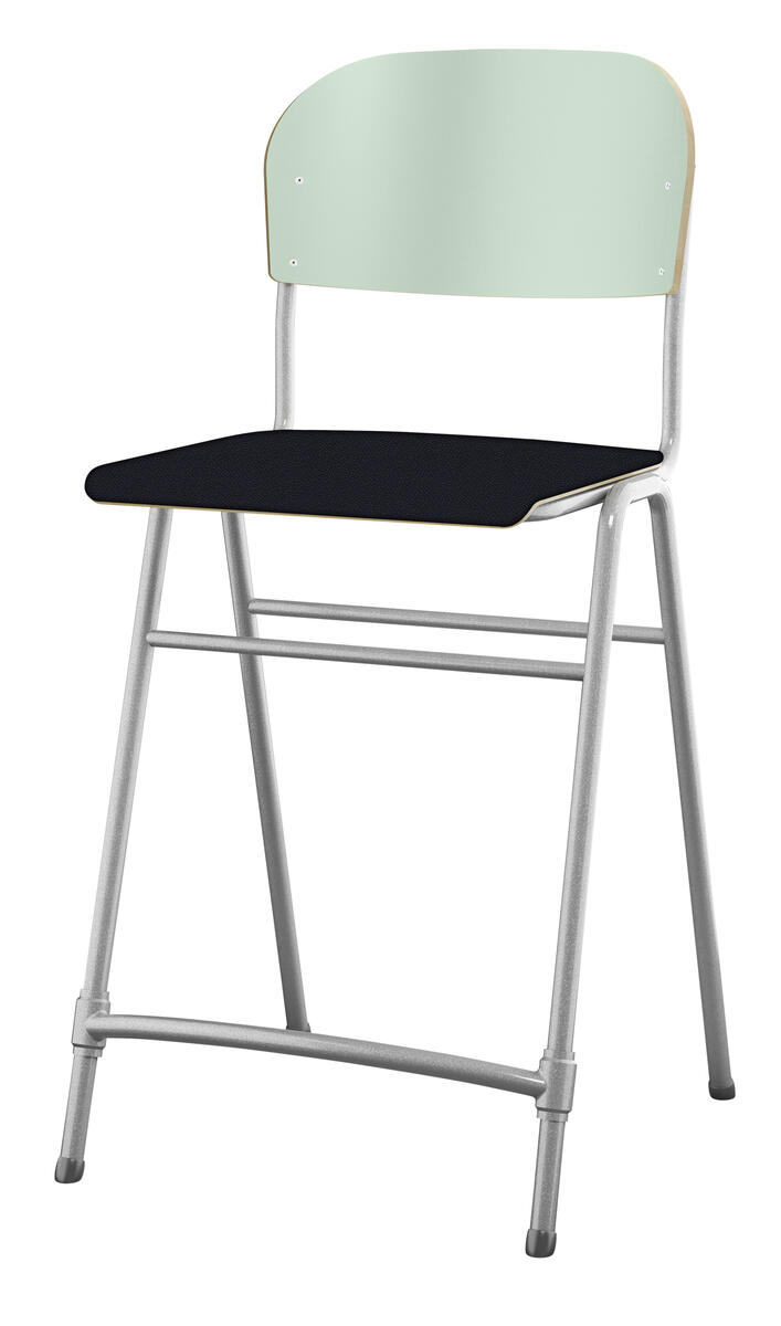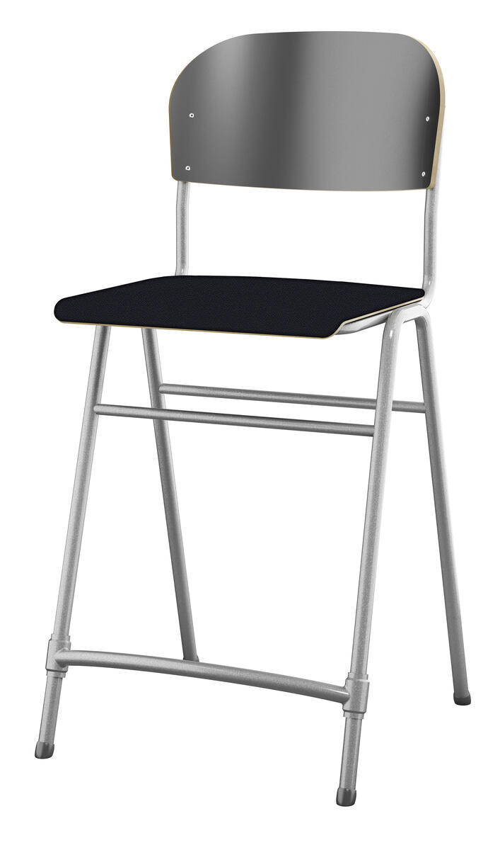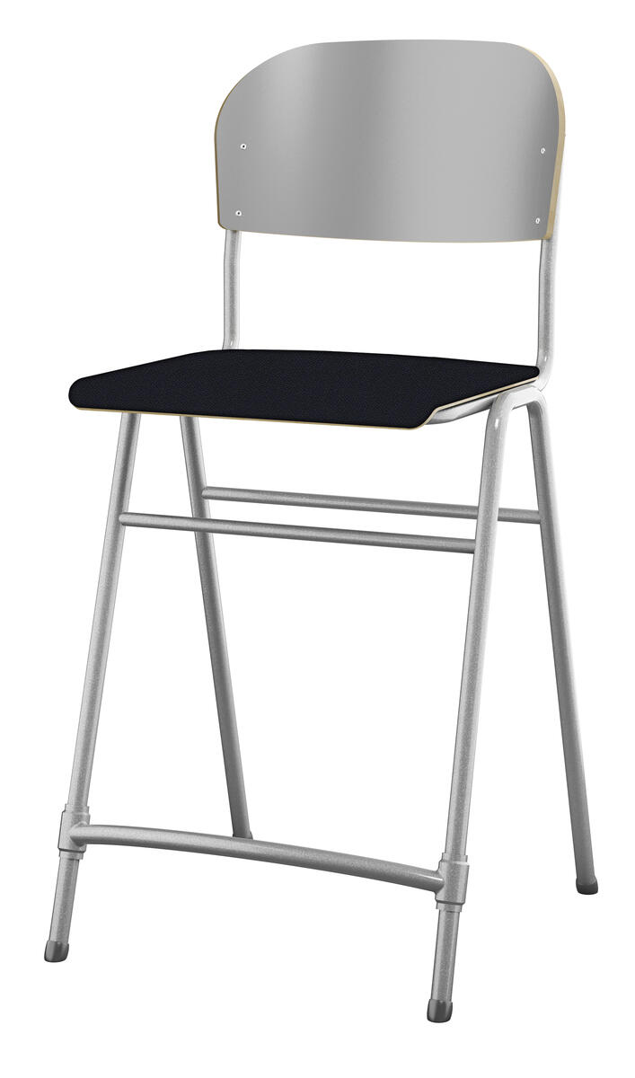 Stapelbar (max 4 st/stapel). Ljuddämpande tassar. Upphängningsbar på bord. Reglerbar fotbräda i 3 fasta lägen. Sitthöjd: 63 cm. Sitsmått: B42xD39 cm. Totaldjupet på stativet är 54 cm. Vikt 7,4 kg. Sits och rygg i högtryckslaminat. Silverlackerat stativ RAL 9006. Valbar med sits klädd i tyg Xtreme Padang YS145 (100 % polyester).