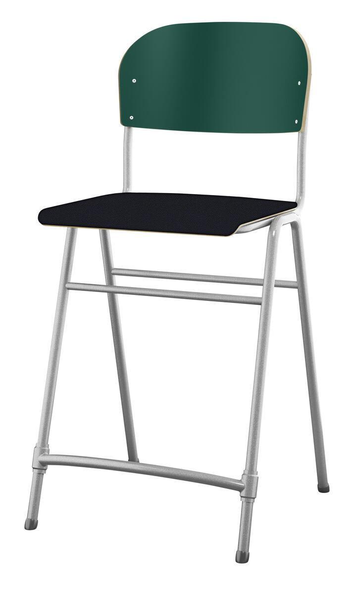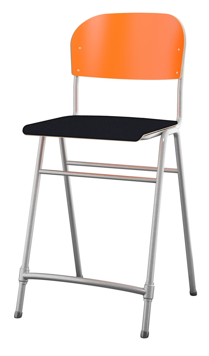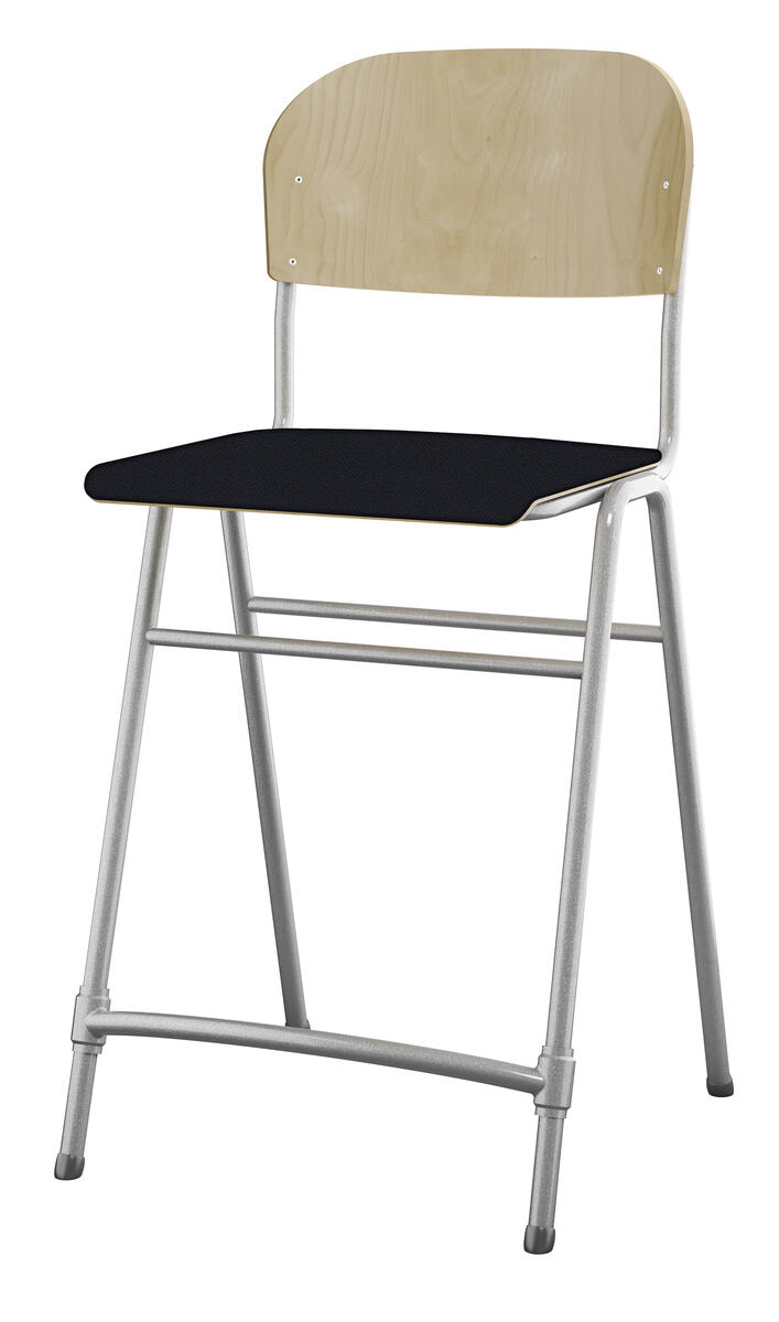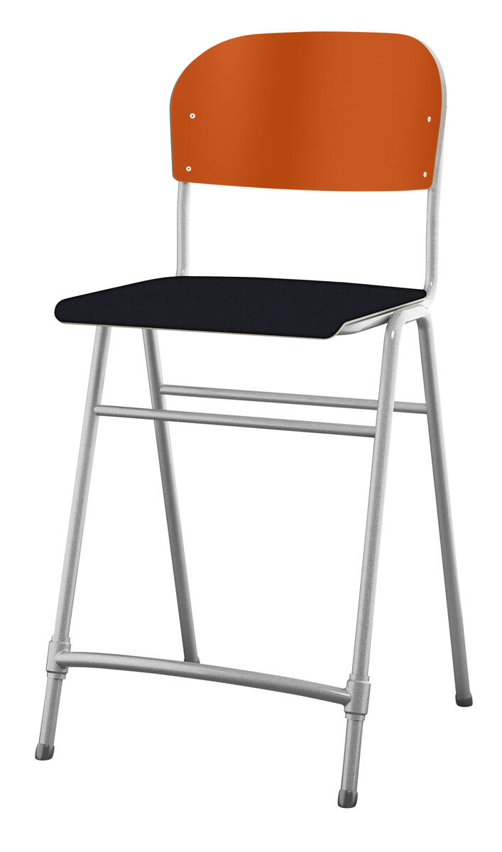 Stapelbar (max 4 st/stapel). Ljuddämpande tassar. Upphängningsbar på bord. Reglerbar fotbräda i 3 fasta lägen. Sitthöjd: 63 cm. Sitsmått: B42xD39 cm. Totaldjupet på stativet är 54 cm. Vikt 7,4 kg. Sits och rygg i högtryckslaminat. Silverlackerat stativ RAL 9006. Valbar med sits klädd i tyg Xtreme Padang YS145 (100 % polyester).