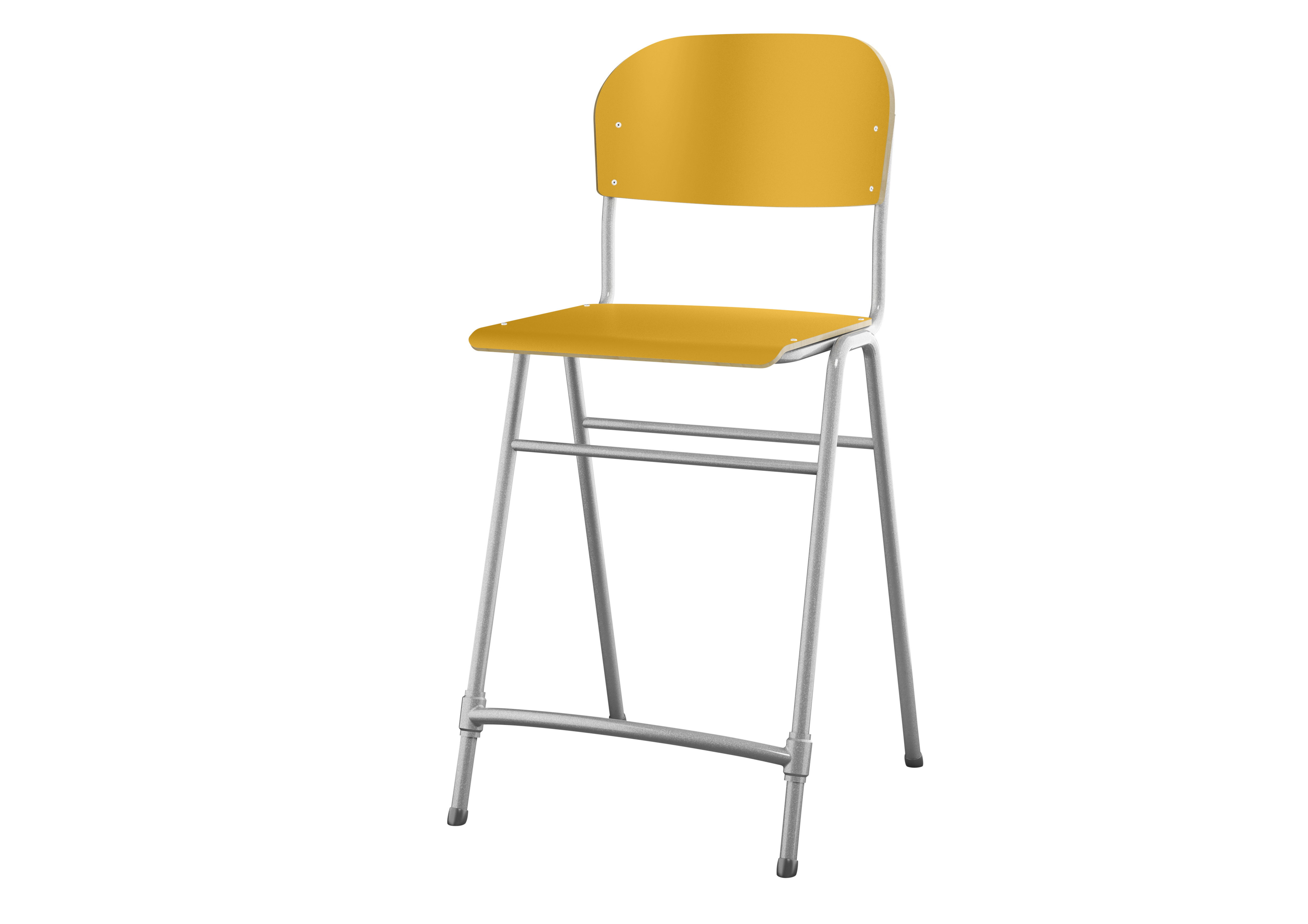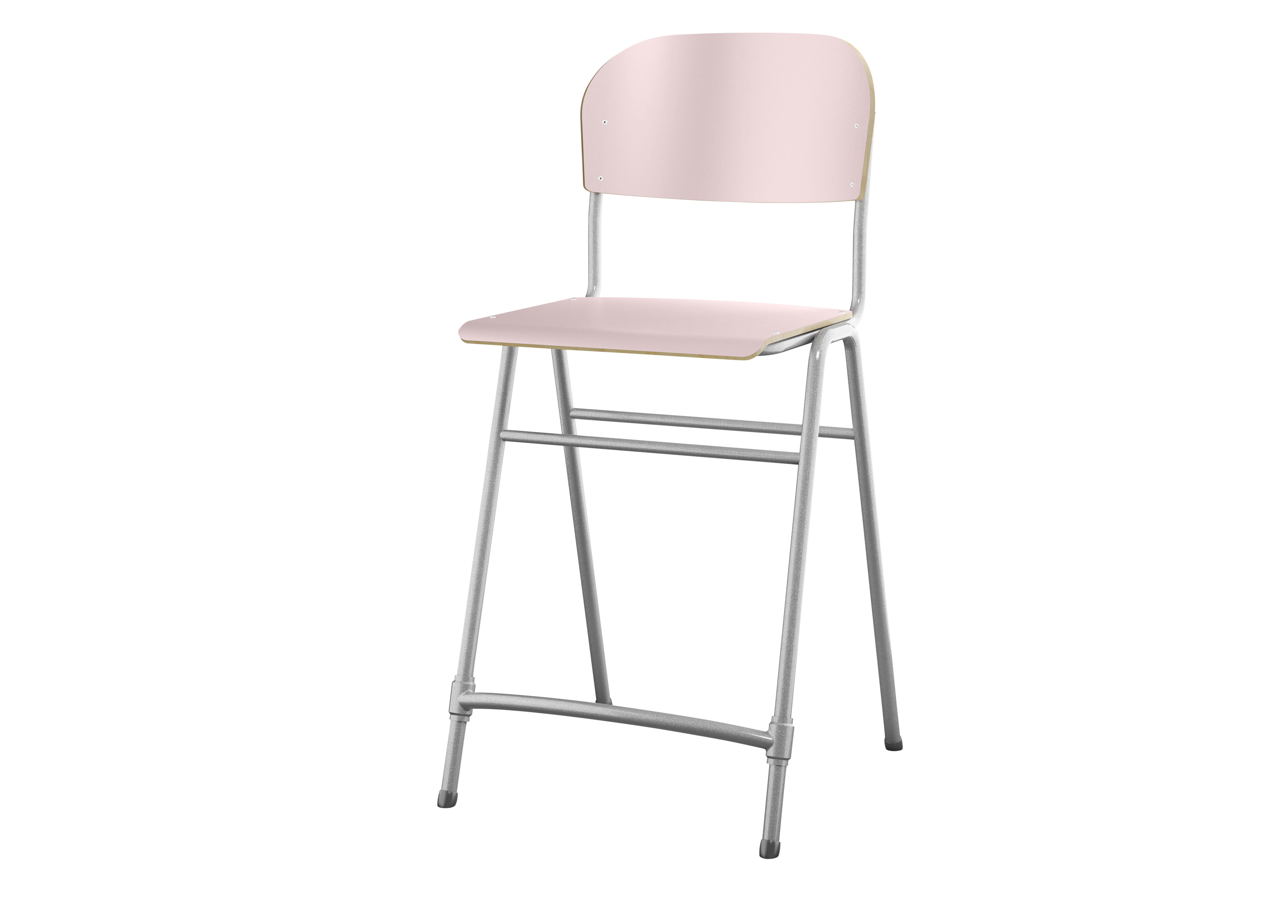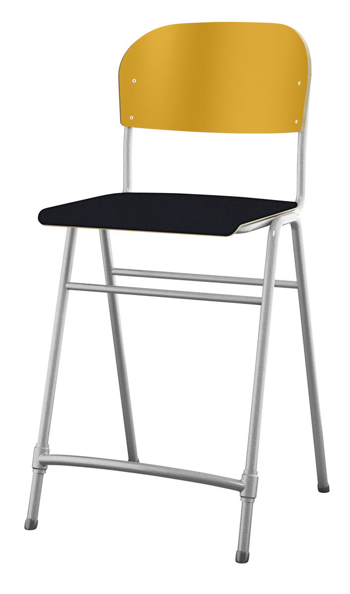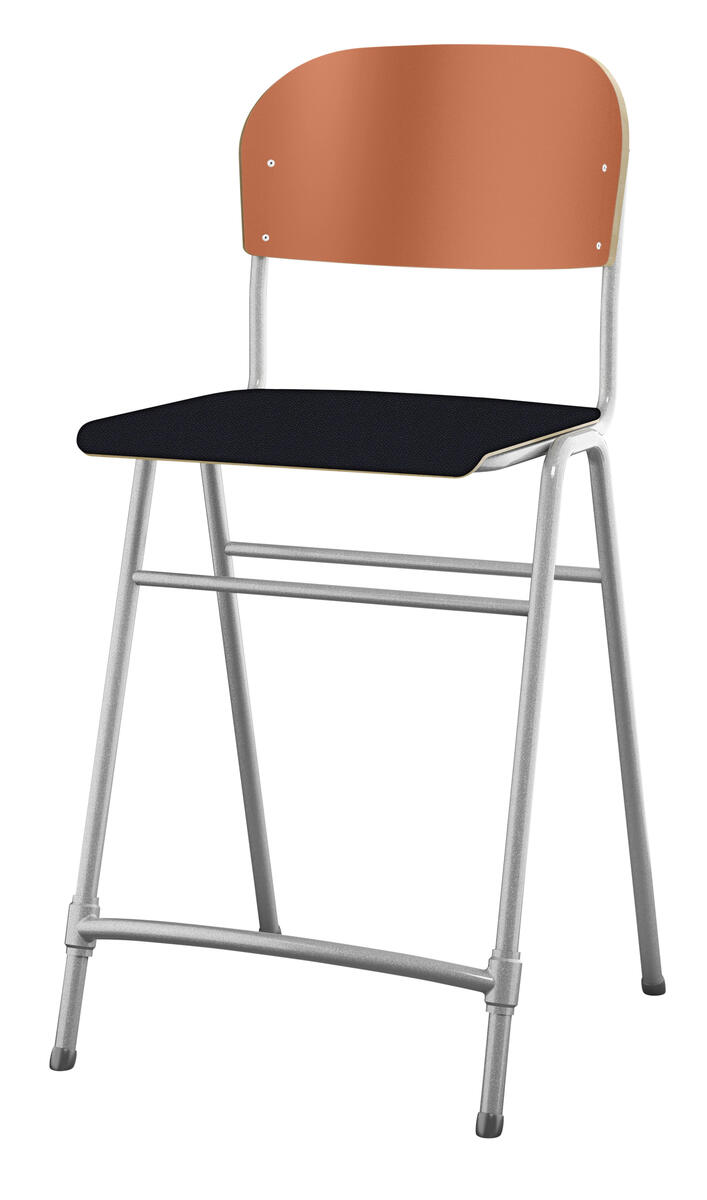 Stapelbar. Ljuddämpande tassar. Reglerbart fotstöd. Sitthöjd: 65 cm. Sitsmått: B42xD39 cm. Vikt 5,3 kg. Sits och rygg i högtryckslaminat. Silverlackerat stativ, RAL 9006. Valbar med sits klädd i tyg Xtreme Padang YS145 (100 % polyester).