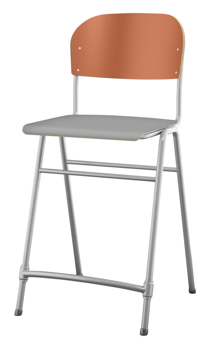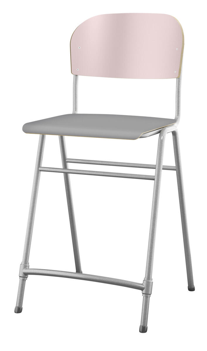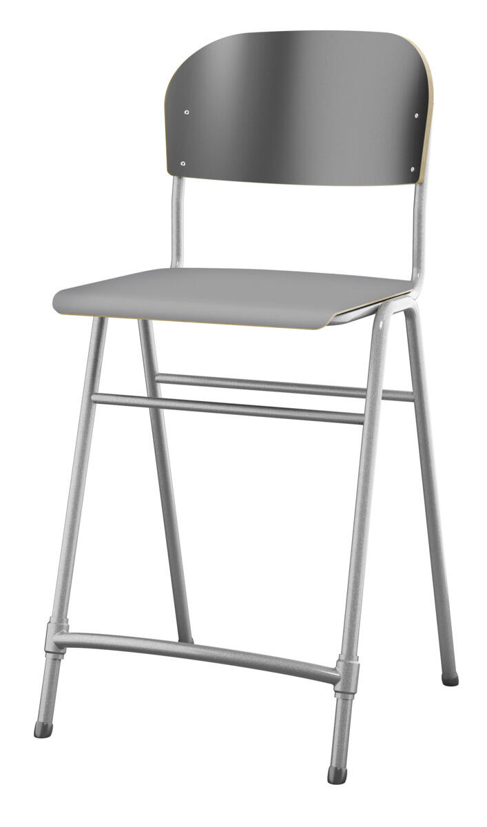 Stapelbar. Ljuddämpande tassar. Reglerbart fotstöd. Sitthöjd: 65 cm. Sitsmått: B42xD39 cm. Vikt 5,3 kg. Sits och rygg i högtryckslaminat. Silverlackerat stativ, RAL 9006.