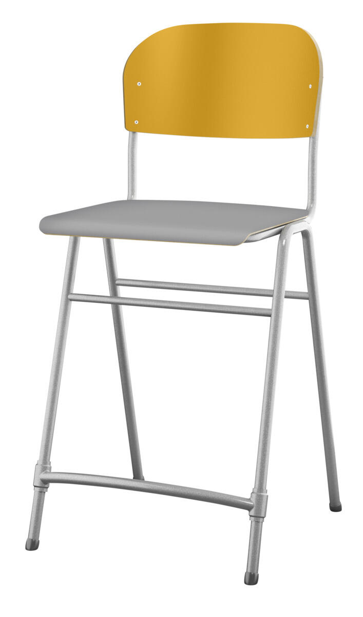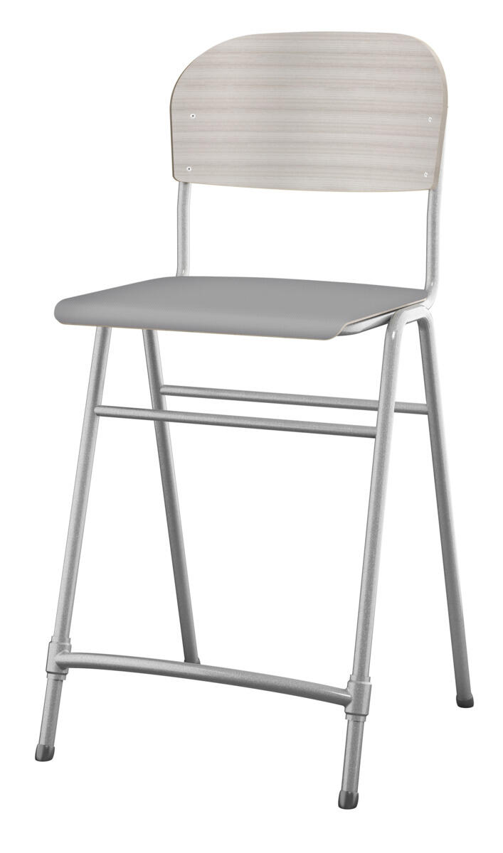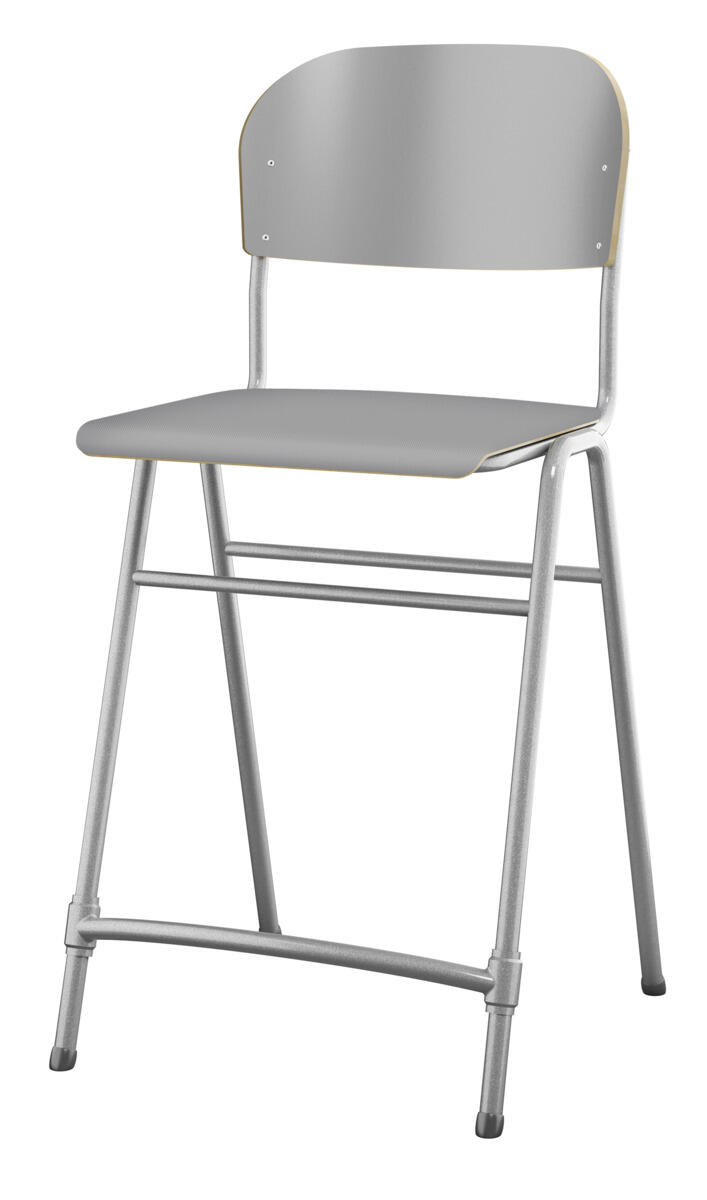 Stapelbar. Ljuddämpande tassar. Reglerbart fotstöd. Sitthöjd: 65 cm. Sitsmått: B36xD35 cm. Vikt 5,3 kg. Sits och rygg i högtryckslaminat. Silverlackerat stativ, RAL 9006.