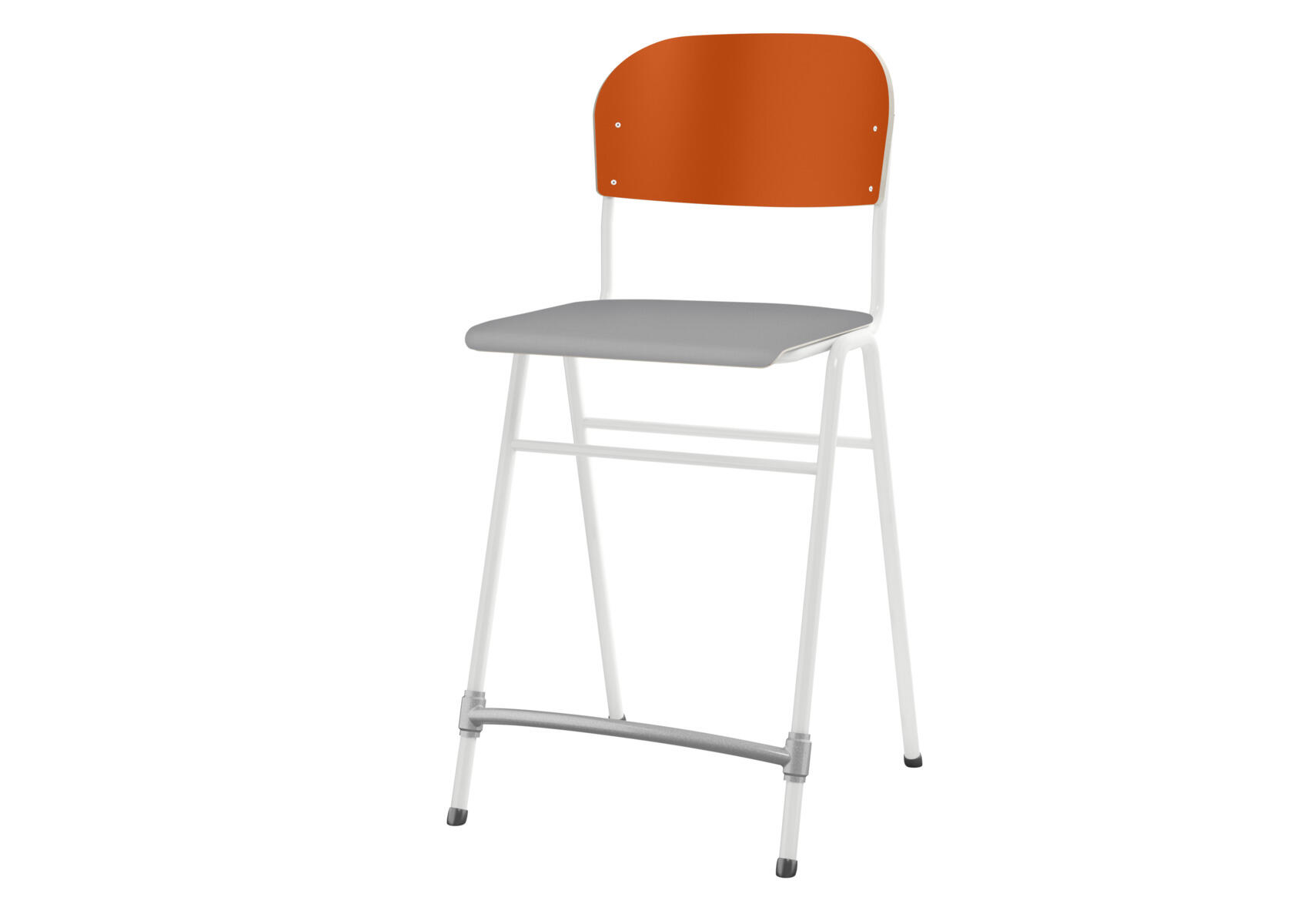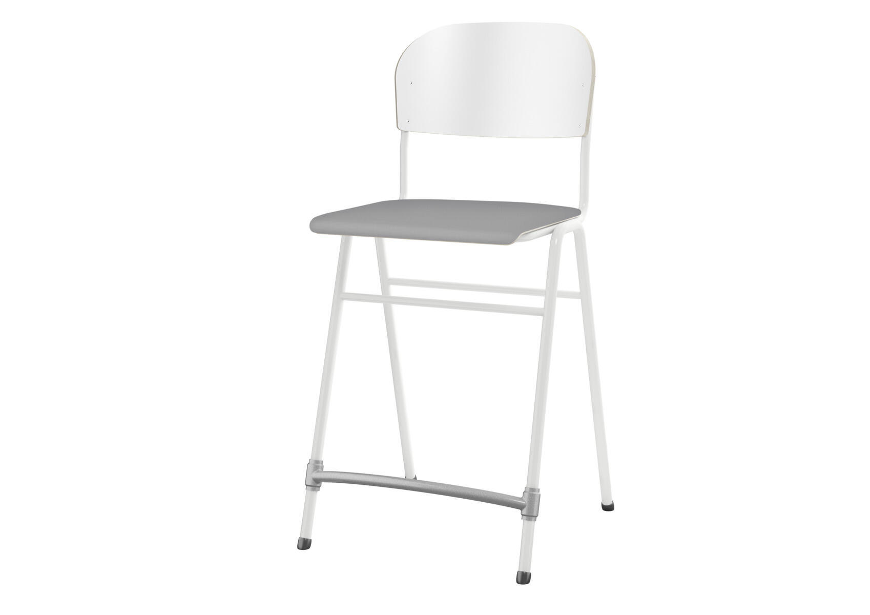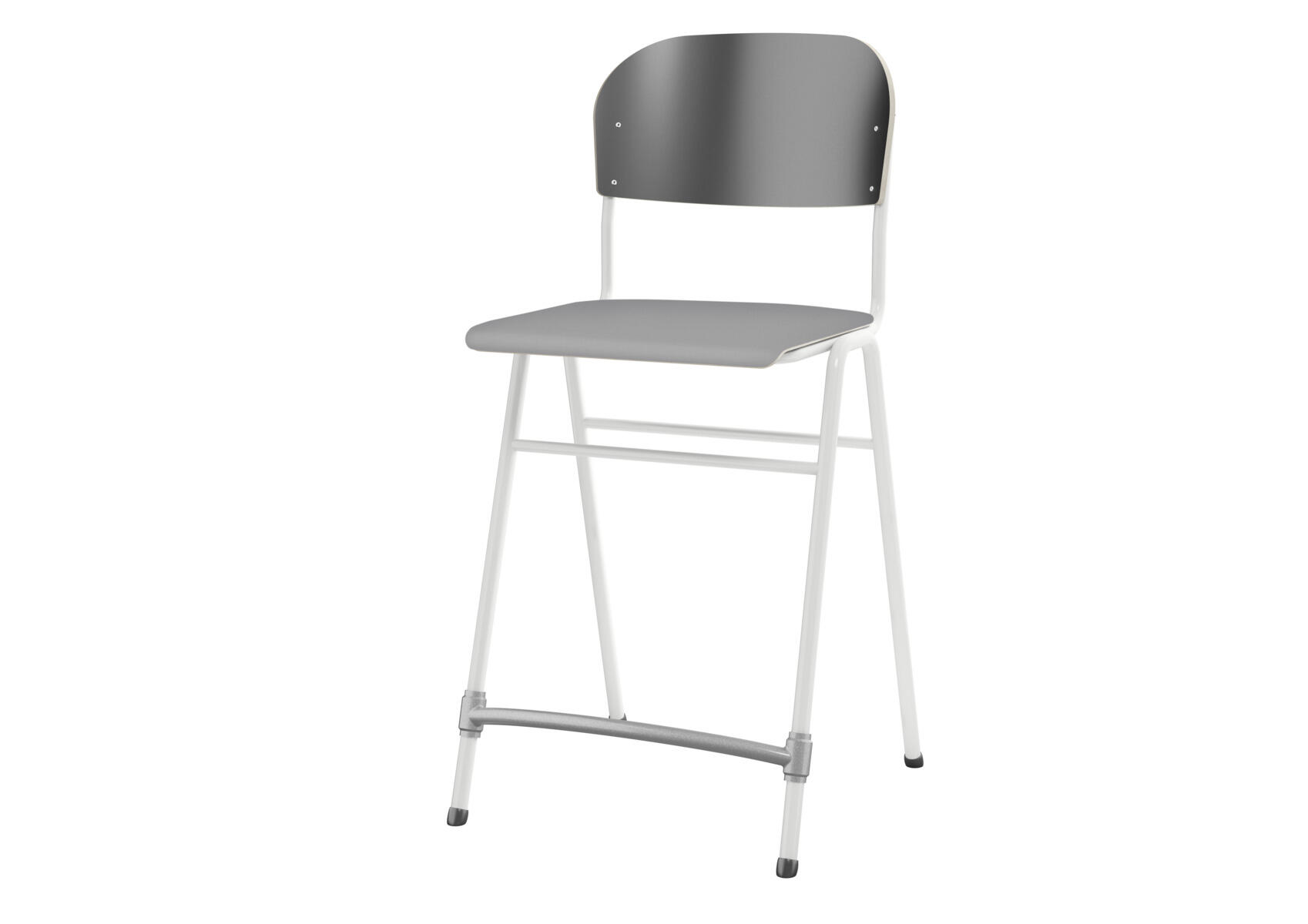 Stapelbar. Ljuddämpande tassar. Reglerbart fotstöd. Sitthöjd: 65 cm. Sitsmått: B42xD39 cm. Vikt 5,3 kg. Sits och rygg i högtryckslaminat. Vitlackerat stativ RAL 9003.