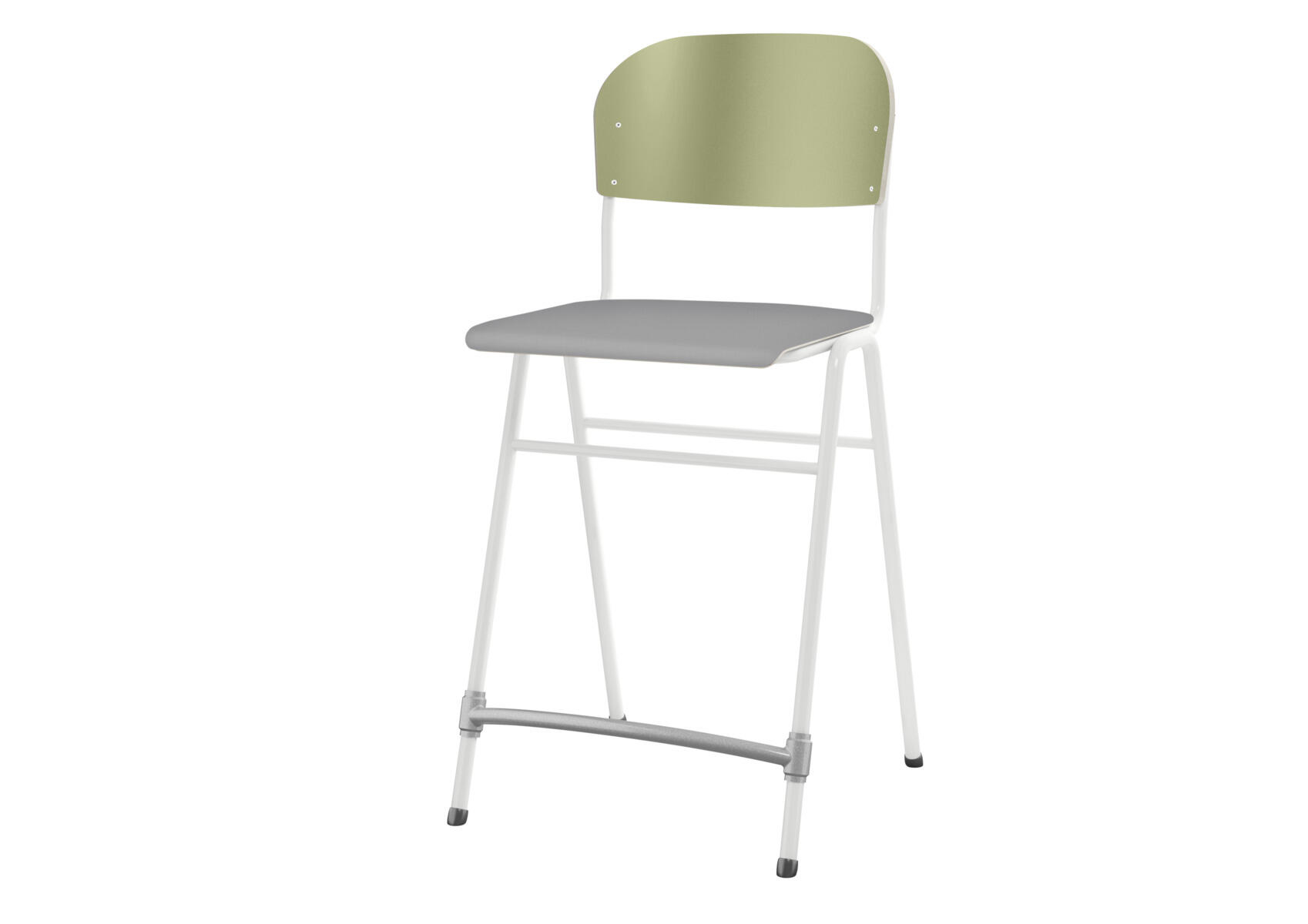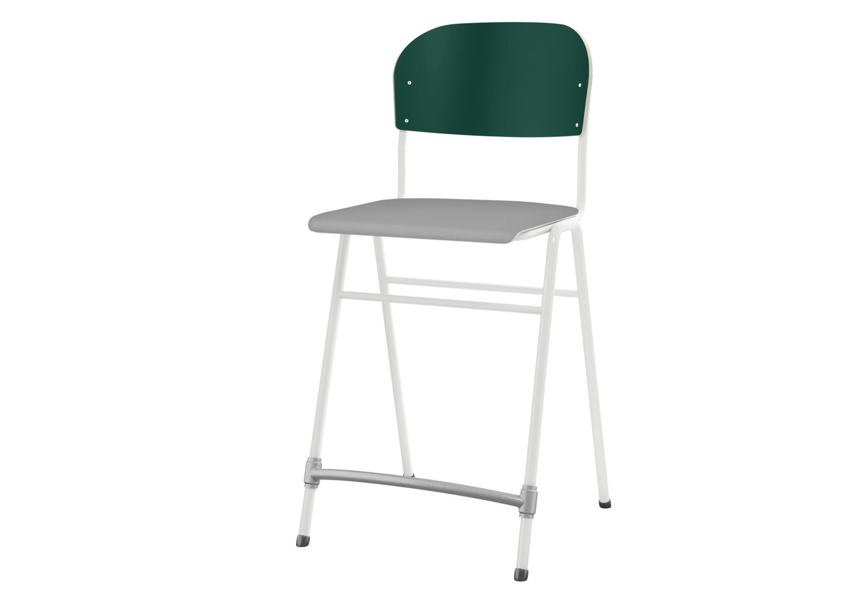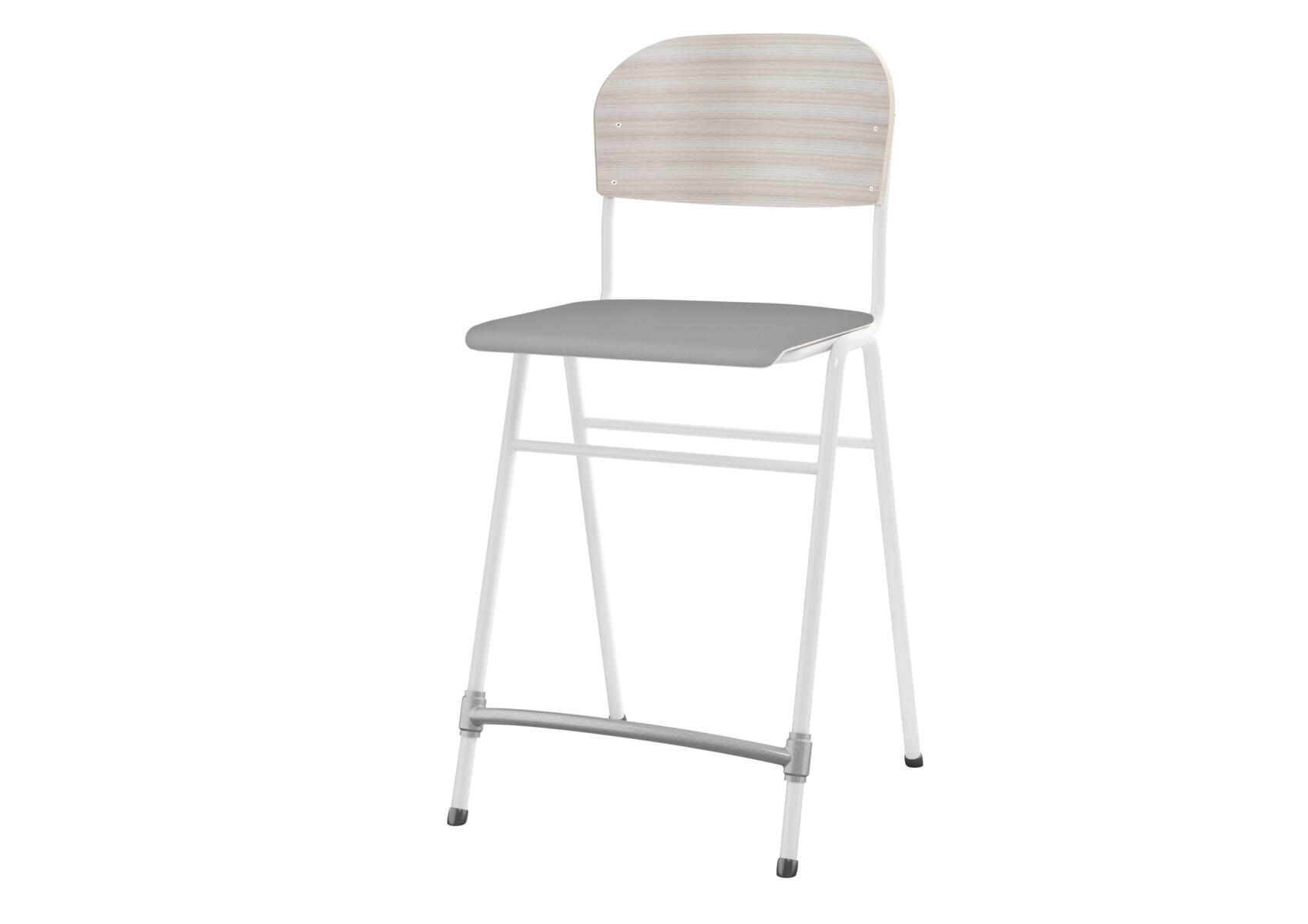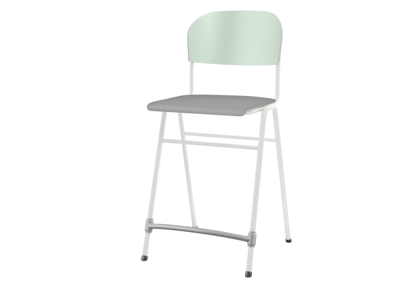 Stapelbar. Ljuddämpande tassar. Reglerbart fotstöd. Sitthöjd: 65 cm. Sitsmått: B42xD39 cm. Vikt 5,3 kg. Sits och rygg i högtryckslaminat. Vitlackerat stativ RAL 9003.