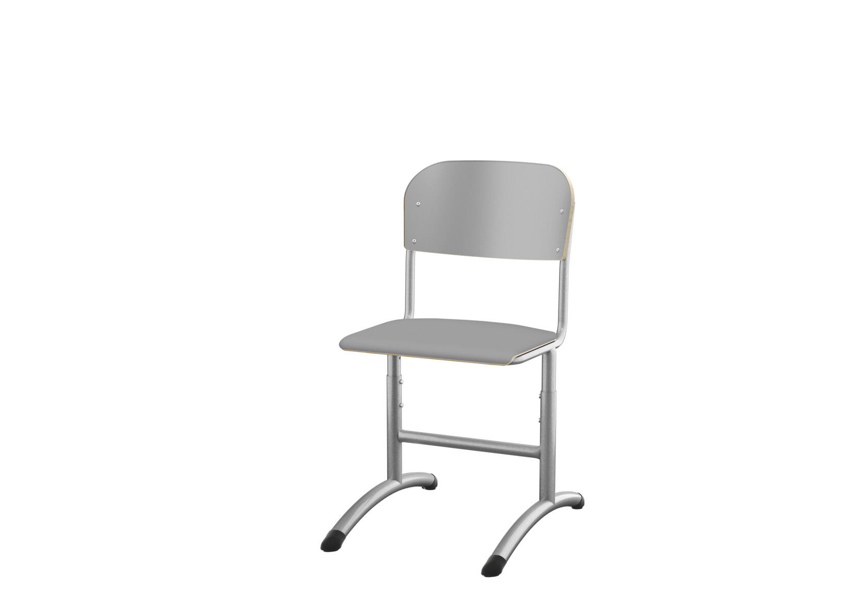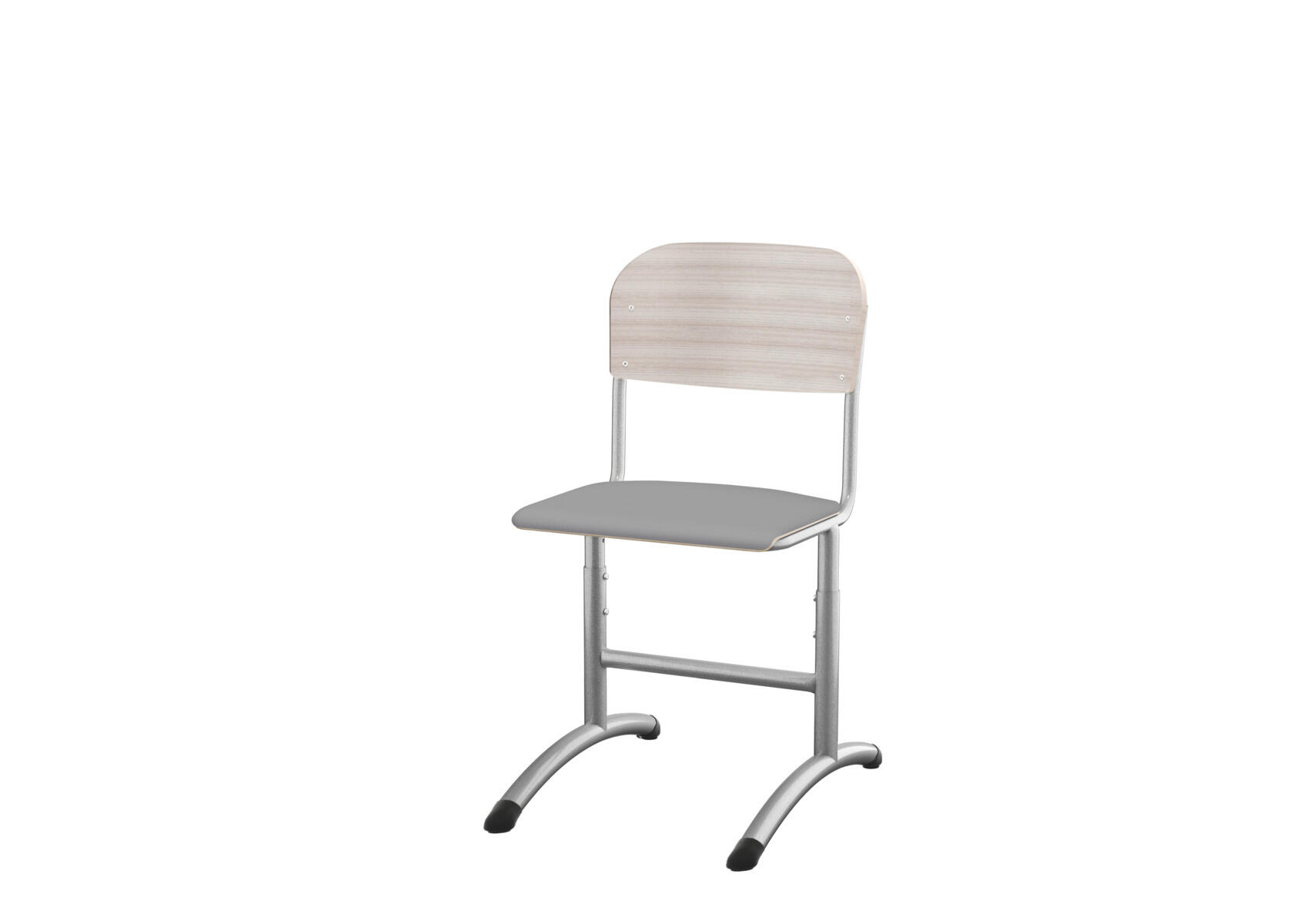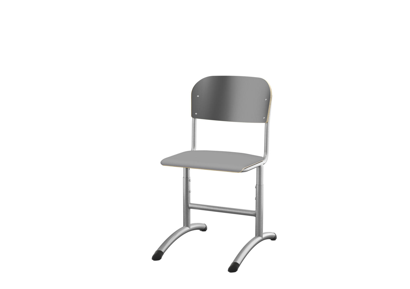 Stapelbar. Ljuddämpande tassar. Reglerbart fotstöd. Sitthöjd: 54 cm. Sitsmått: B42xD39 cm. Vikt 5,3 kg. Sits och rygg i högtryckslaminat. Silverlackerat stativ, RAL 9006.