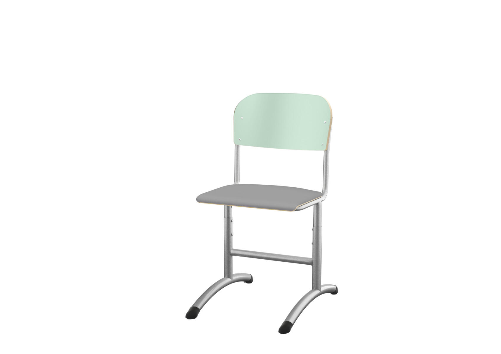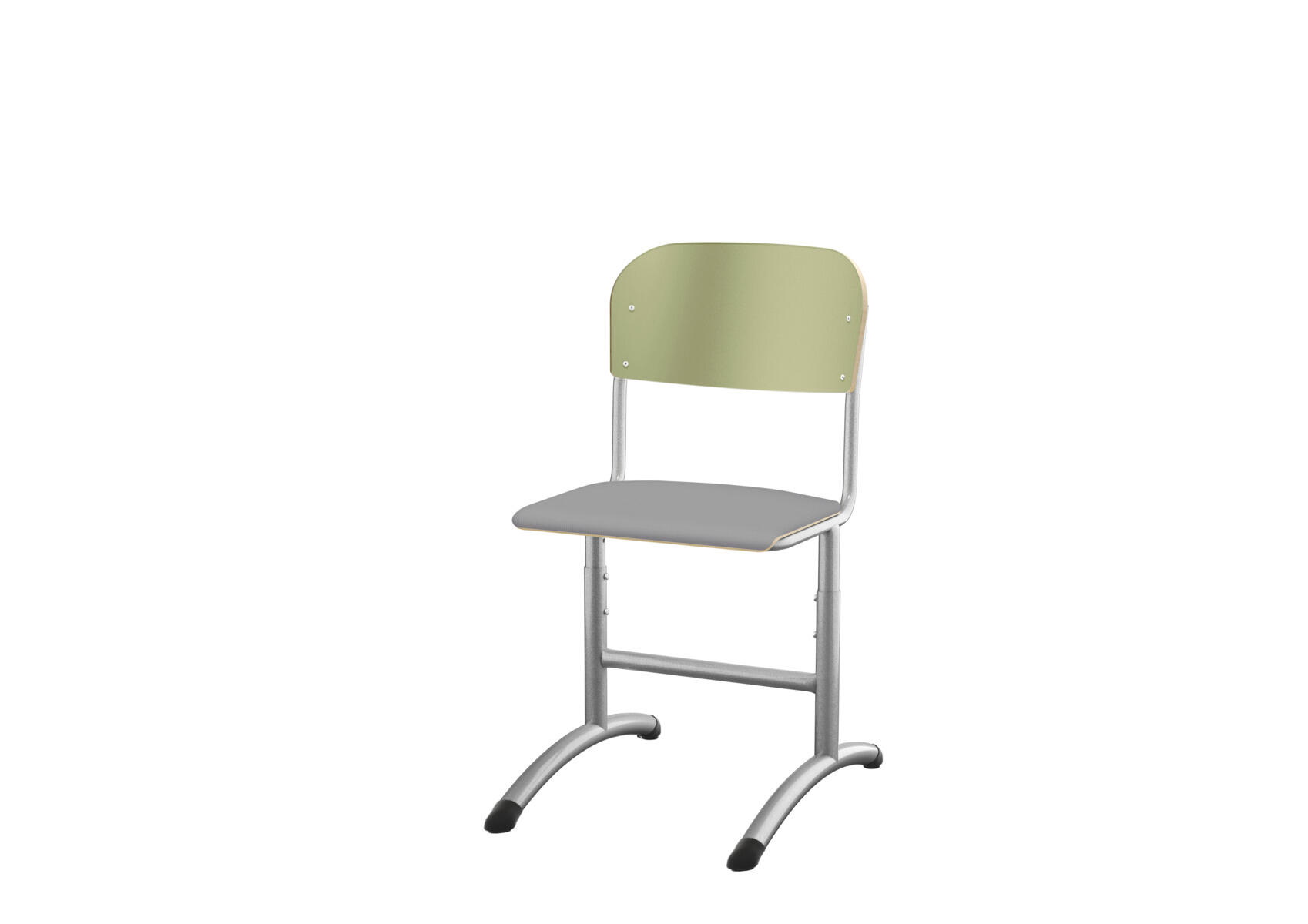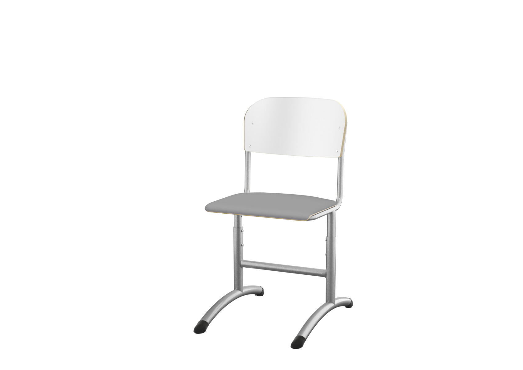 Stapelbar. Ljuddämpande tassar. Reglerbart fotstöd. Sitthöjd: 54 cm. Sitsmått: B42xD39 cm. Vikt 5,3 kg. Sits och rygg i högtryckslaminat. Silverlackerat stativ, RAL 9006.