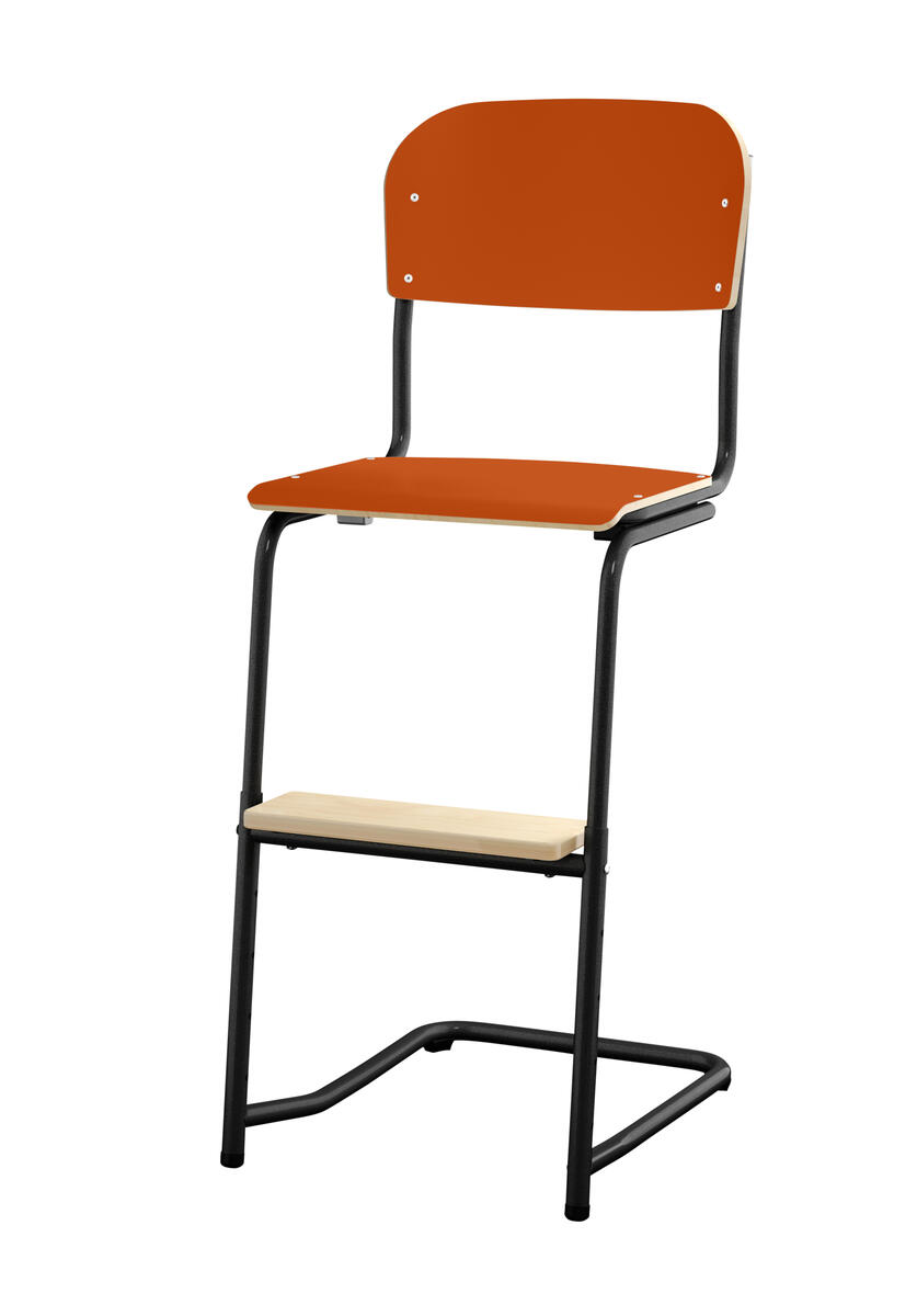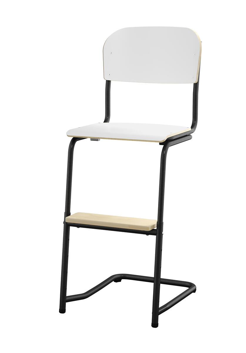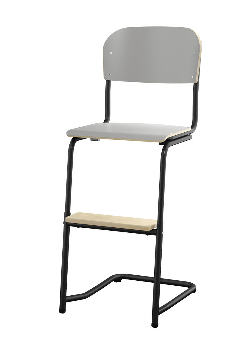 Stapelbar (max 4 st/stapel). Ljuddämpande tassar. Upphängningsbar på bord. Reglerbar fotbräda i 3 fasta lägen. Sitthöjd 50 cm. Sitsmått: B36xD35 cm. Totaldjupet på stativet är 54 cm. Vikt 4,6 kg. Sits och rygg i högtryckslaminat. Silverlackerat stativ, RAL 9006.
