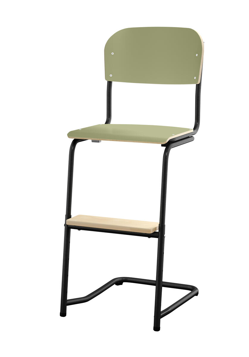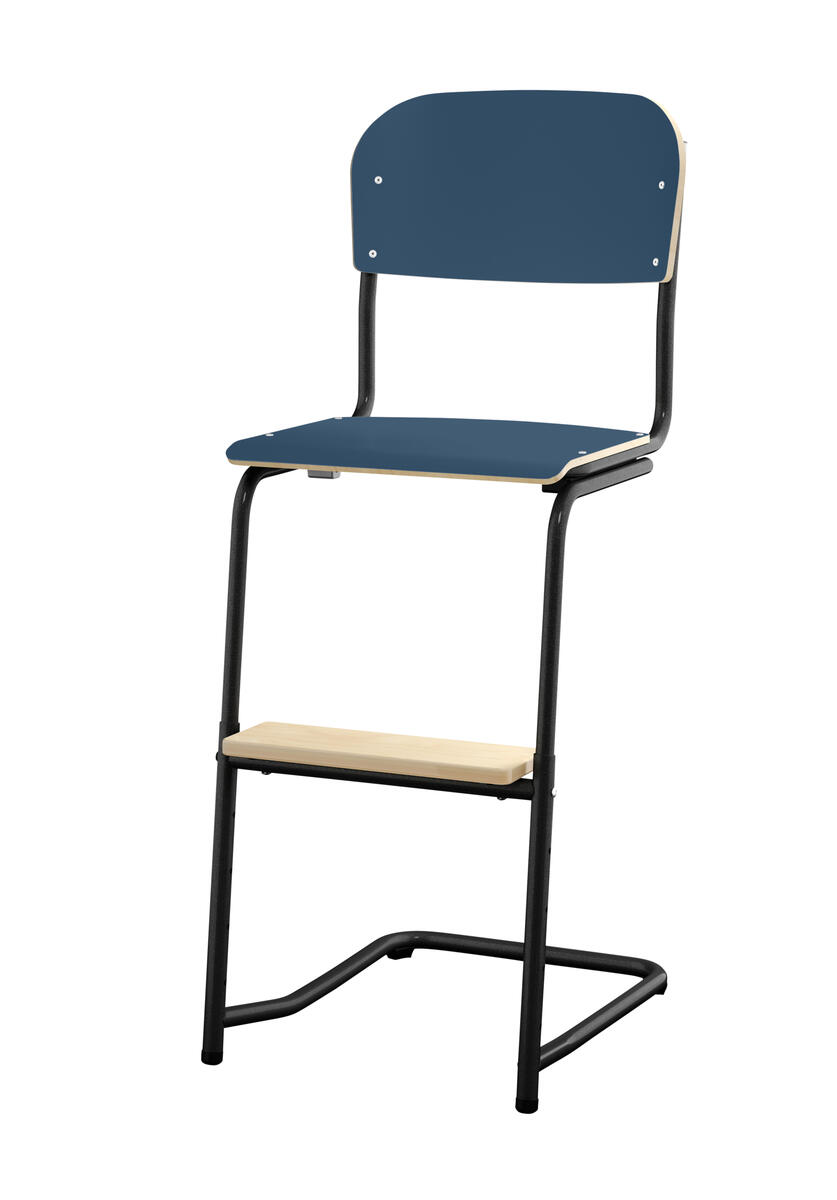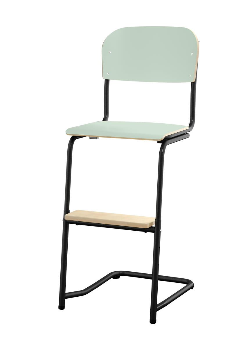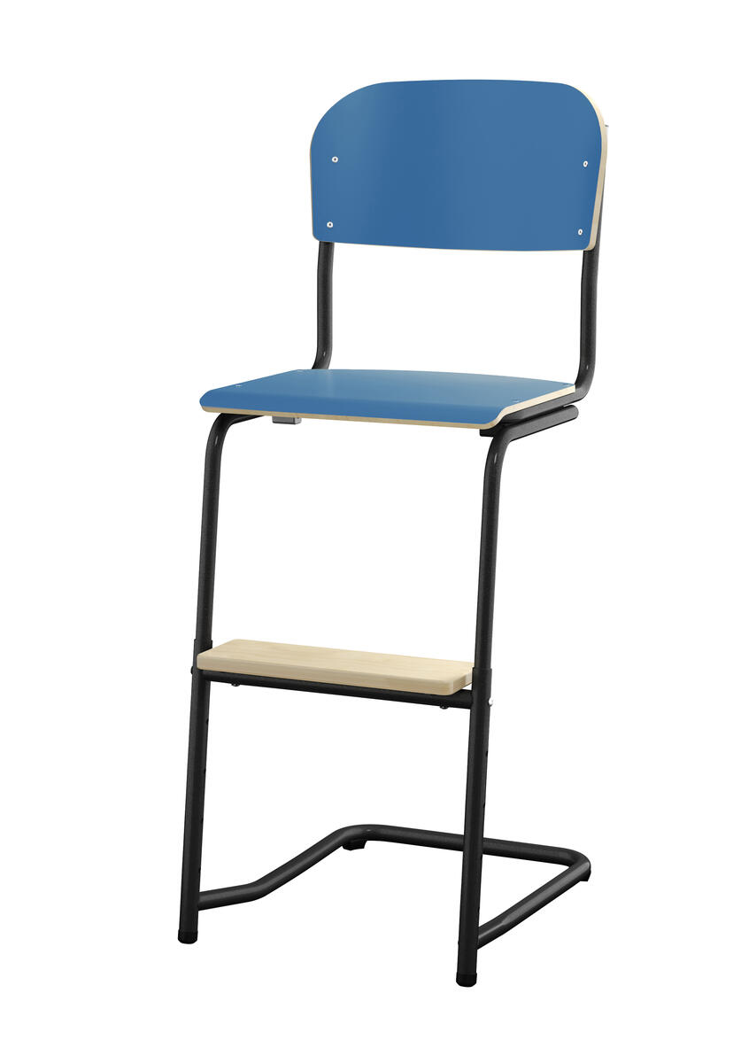 Stapelbar (max 4 st/stapel). Ljuddämpande tassar. Upphängningsbar på bord. Reglerbar fotbräda i 3 fasta lägen. Sitthöjd 50 cm. Sitsmått: B36xD35 cm. Totaldjupet på stativet är 54 cm. Vikt 4,6 kg. Sits och rygg i högtryckslaminat. Silverlackerat stativ, RAL 9006.