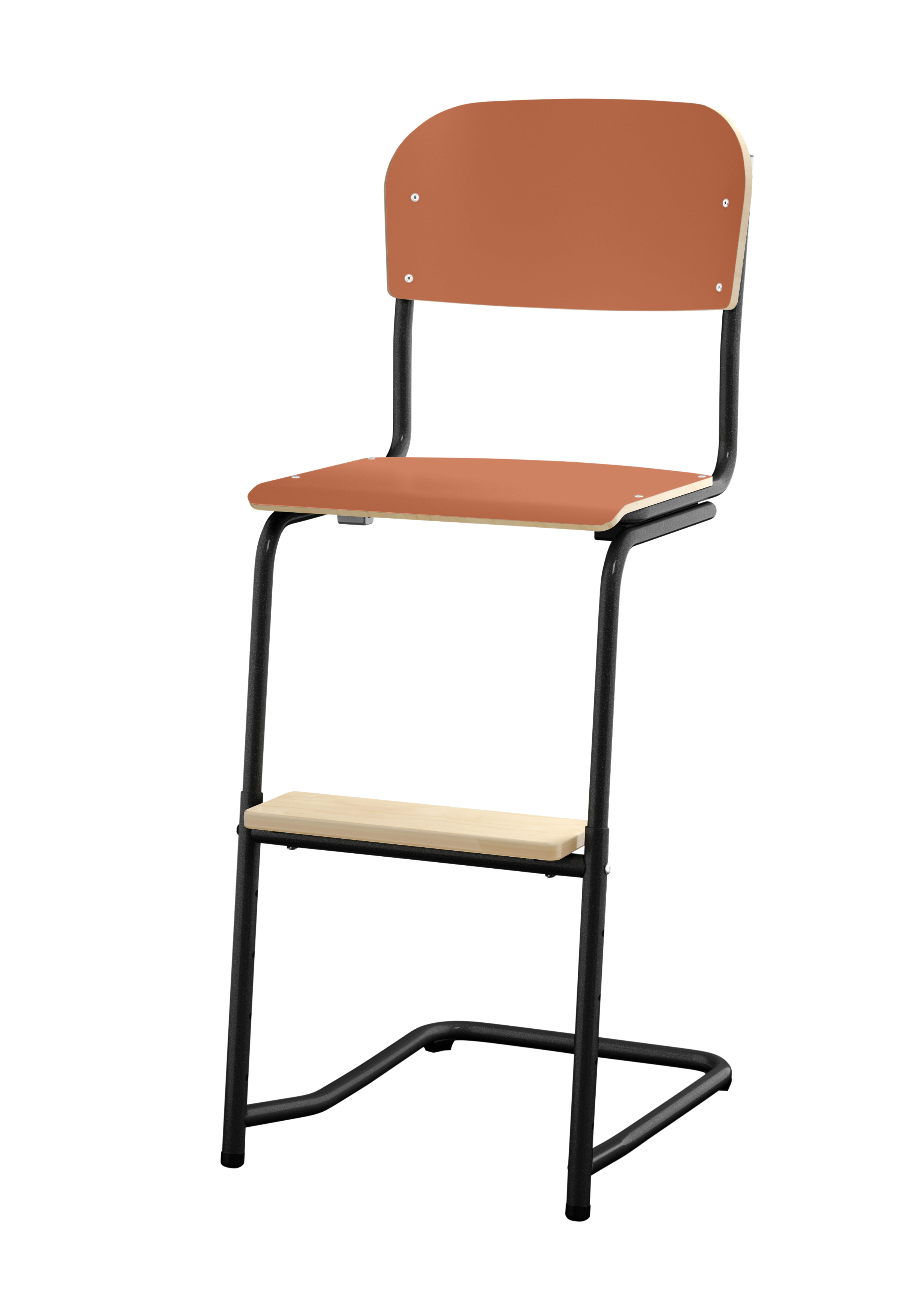 Stapelbar (max 4 st/stapel). Ljuddämpande tassar. Upphängningsbar på bord. Reglerbar fotbräda i 3 fasta lägen. Sitthöjd: 63 cm. Sitsmått: B42xD39 cm. Totaldjupet på stativet är 54 cm. Vikt 7,4 kg. Sits och rygg i högtryckslaminat. Silverlackerat stativ RAL 9006.