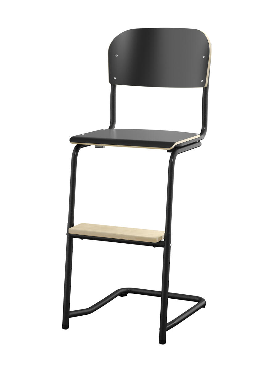 Stapelbar (max 4 st/stapel). Ljuddämpande tassar. Upphängningsbar på bord. Reglerbar fotbräda i 3 fasta lägen. Sitthöjd: ställbar till 57, 60 eller 63 cm. Sitsmått: B36xD35 cm. Totaldjupet på stativet är 54 cm. Vikt 6,4 kg. Sits och rygg i högtryckslaminat. Svartlackerat stativ, RAL 9005.