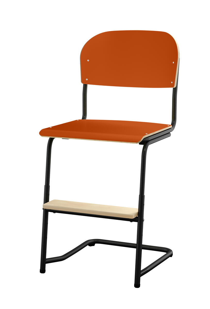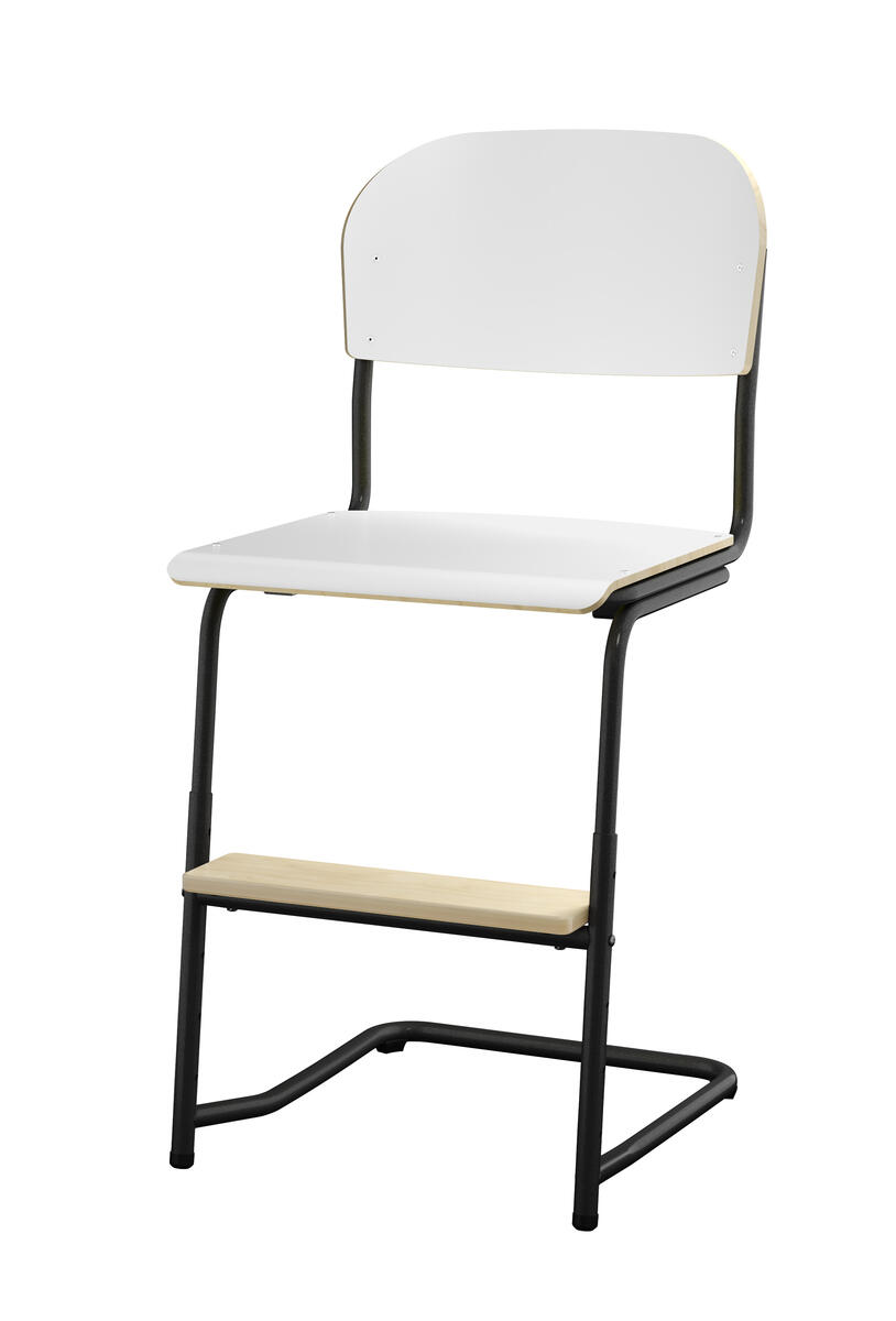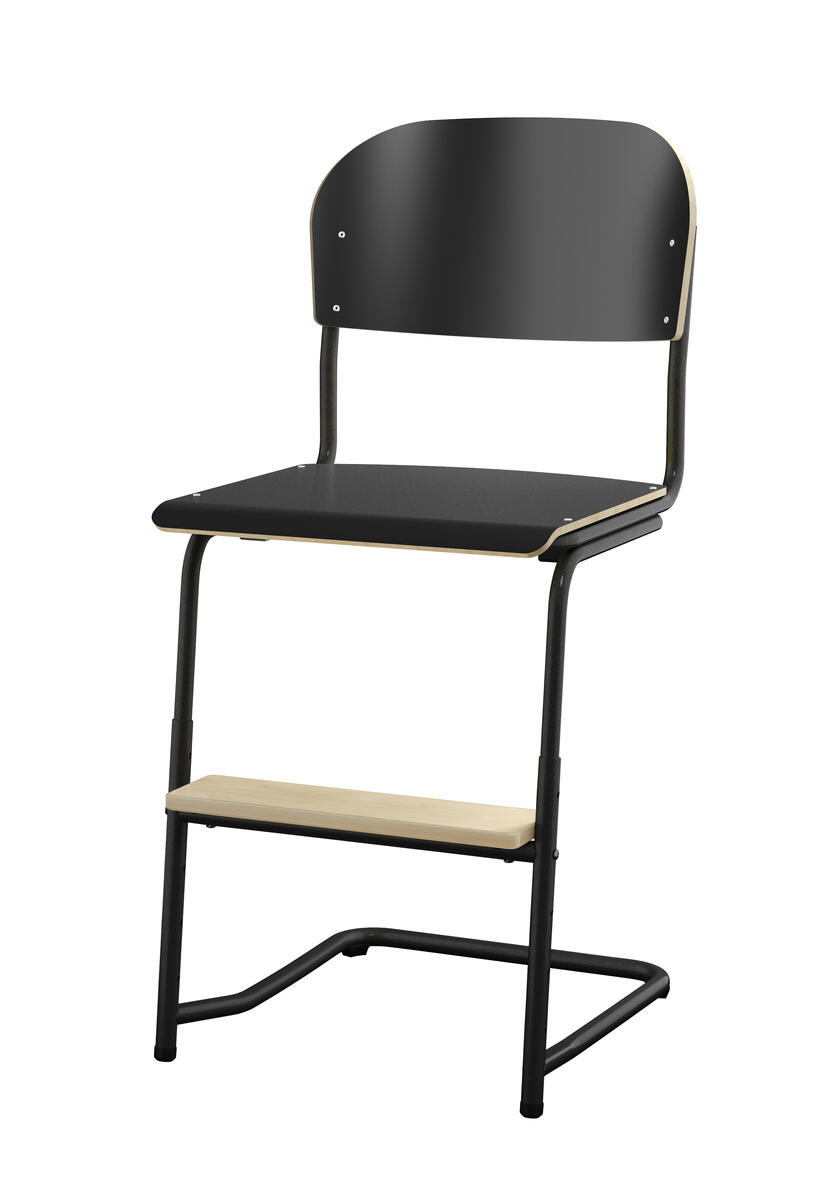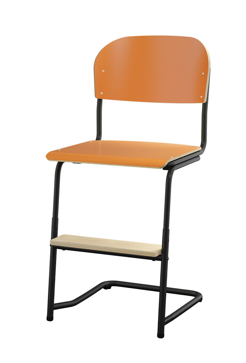 Stapelbar (max 4 st/stapel). Ljuddämpande tassar. Upphängningsbar på bord. Reglerbar fotbräda i 3 fasta lägen. Sitthöjd 50 cm. Sitsmått: B36xD35 cm. Totaldjupet på stativet är 54 cm. Vikt 4,6 kg. Sits och rygg i högtryckslaminat. Silverlackerat stativ, RAL 9006.