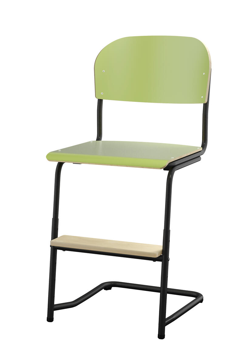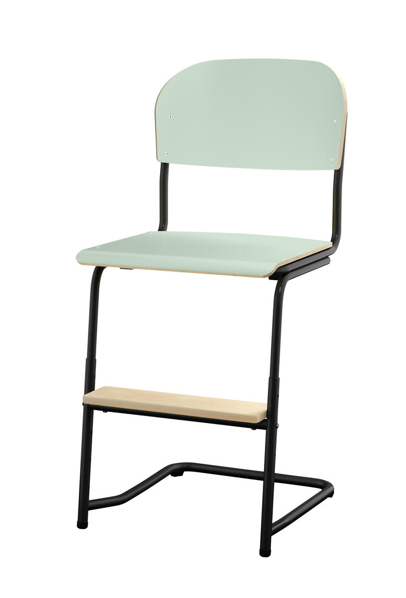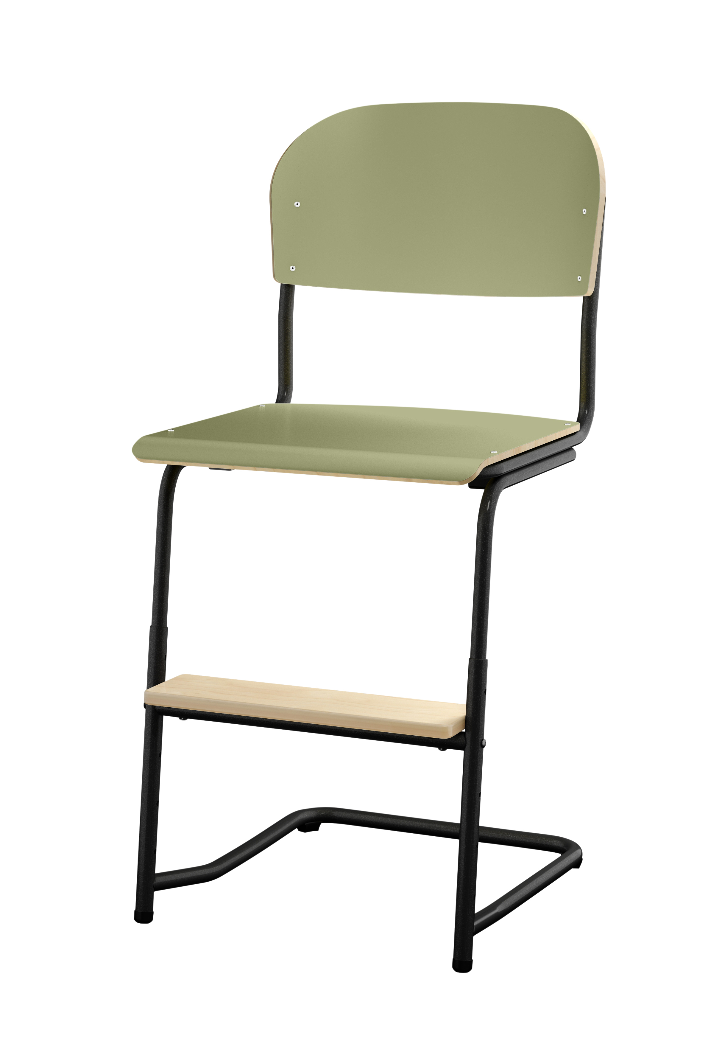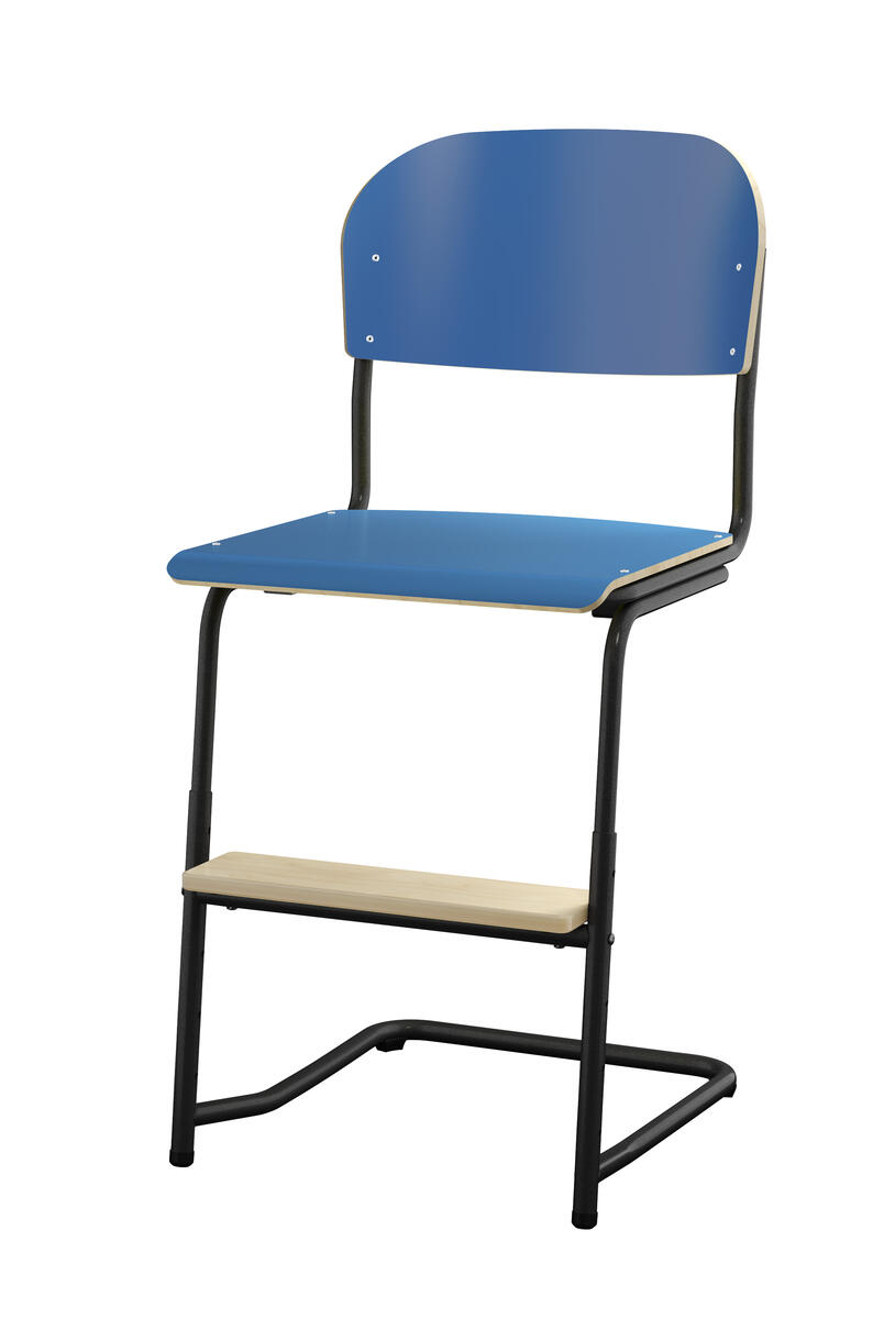Stapelbar (max 4 st/stapel). Ljuddämpande tassar. Upphängningsbar på bord. Reglerbar fotbräda i 3 fasta lägen. Sitthöjd 50 cm. Sitsmått: B36xD35 cm. Totaldjupet på stativet är 54 cm. Vikt 4,6 kg. Sits och rygg i högtryckslaminat. Silverlackerat stativ, RAL 9006.