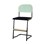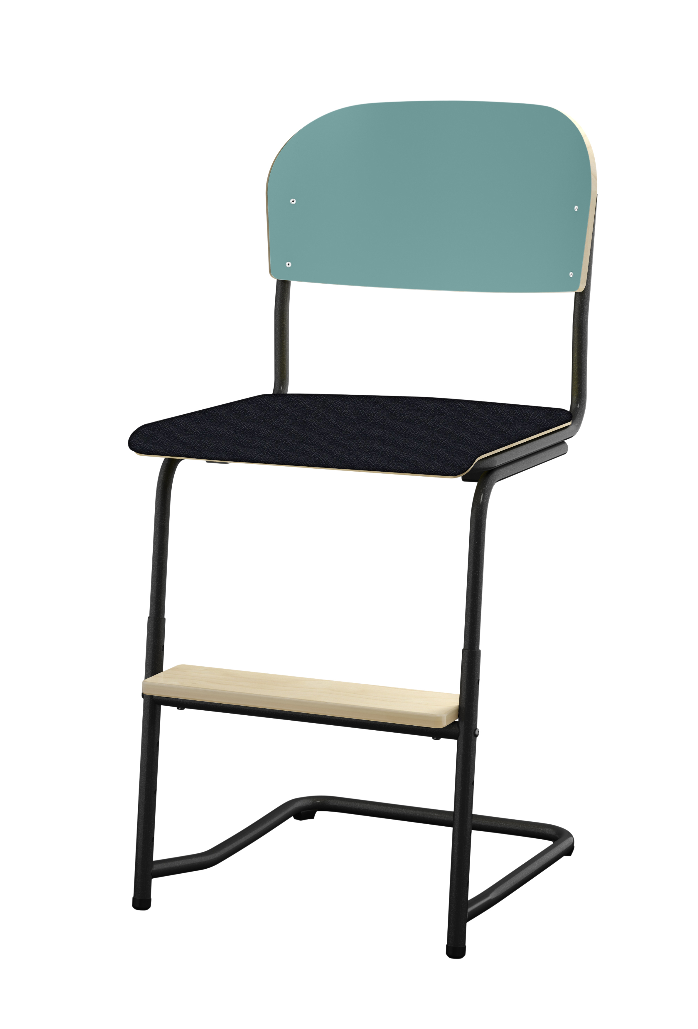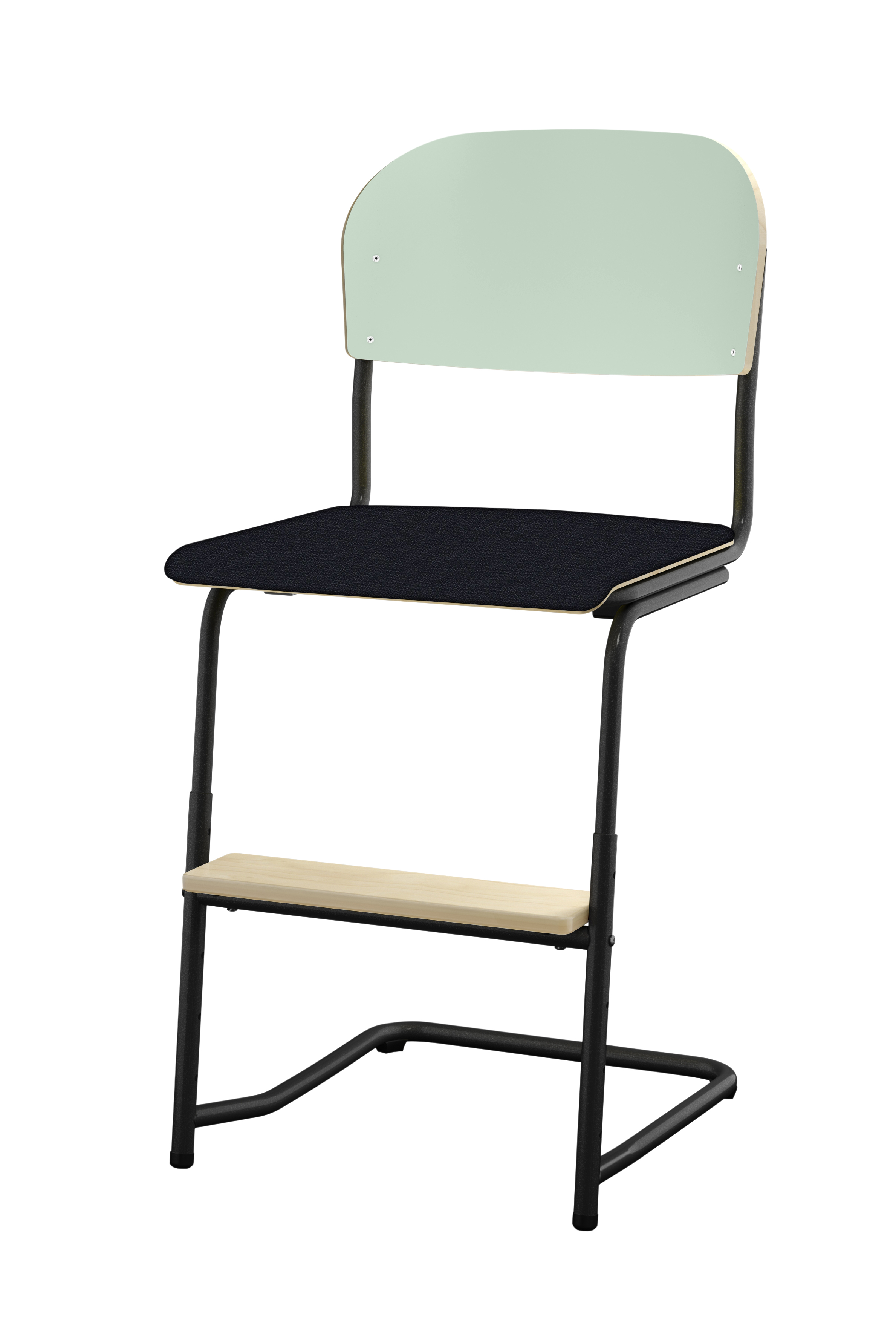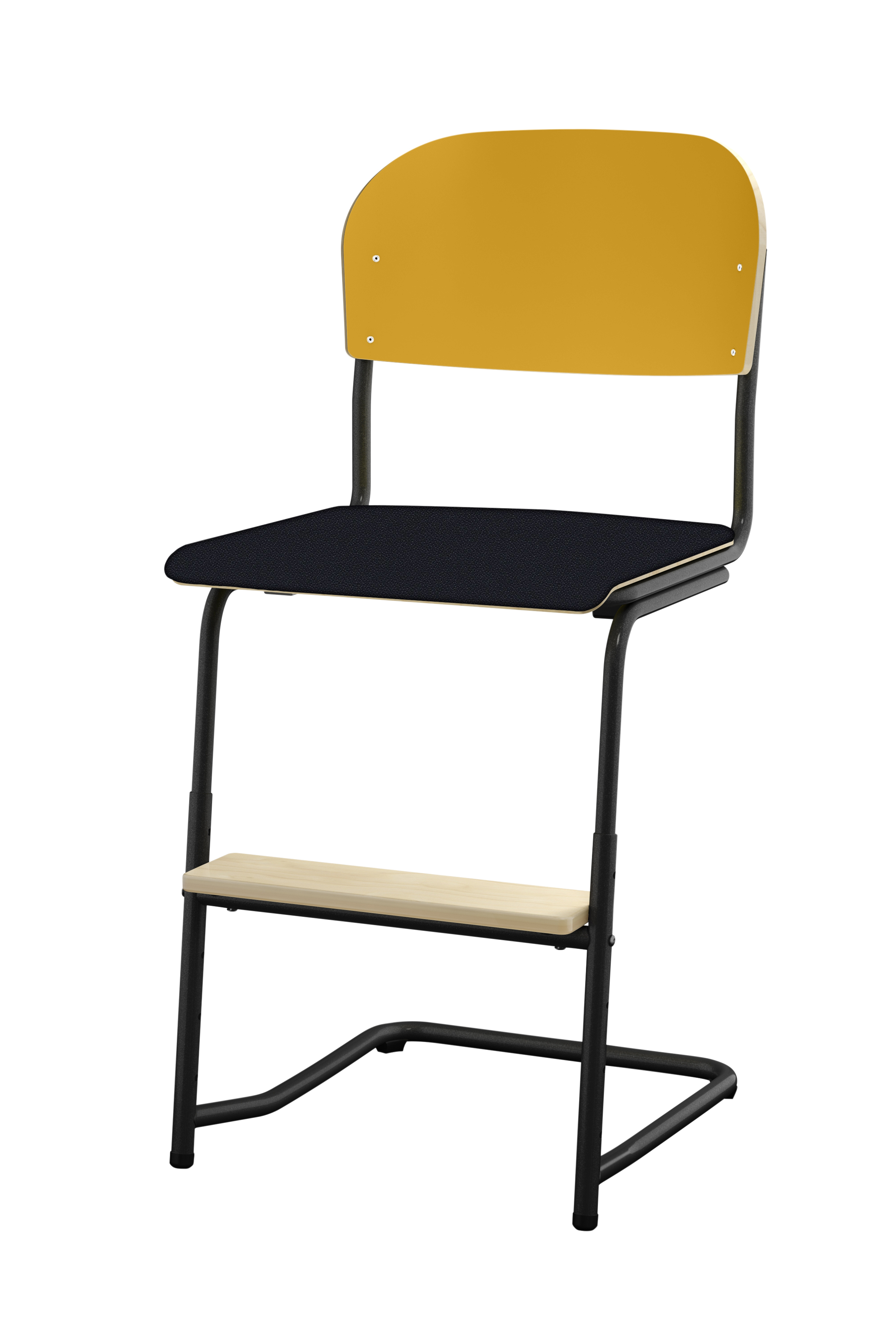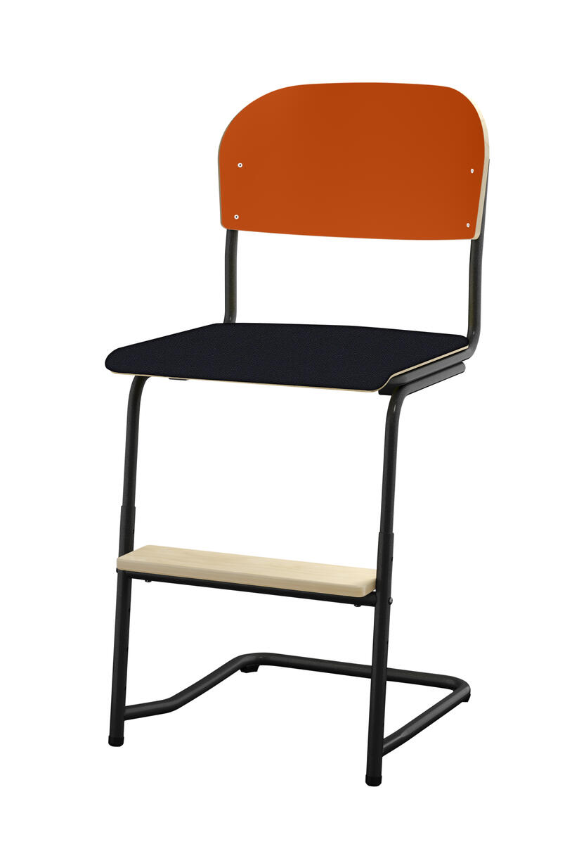 Stapelbar (max 4 st/stapel). Ljuddämpande tassar. Upphängningsbar på bord. Reglerbar fotbräda i 3 fasta lägen. Sitthöjd 50 cm. Sitsmått: B36xD35 cm. Totaldjupet på stativet är 54 cm. Vikt 4,6 kg. Sits och rygg i högtryckslaminat. Silverlackerat stativ, RAL 9006.