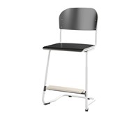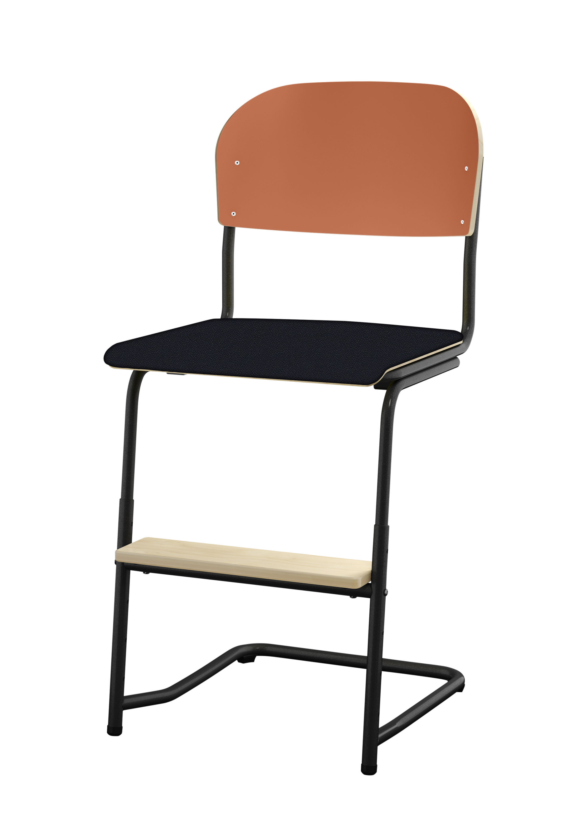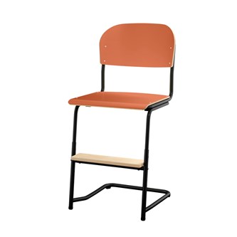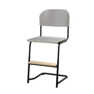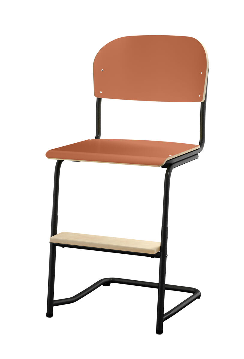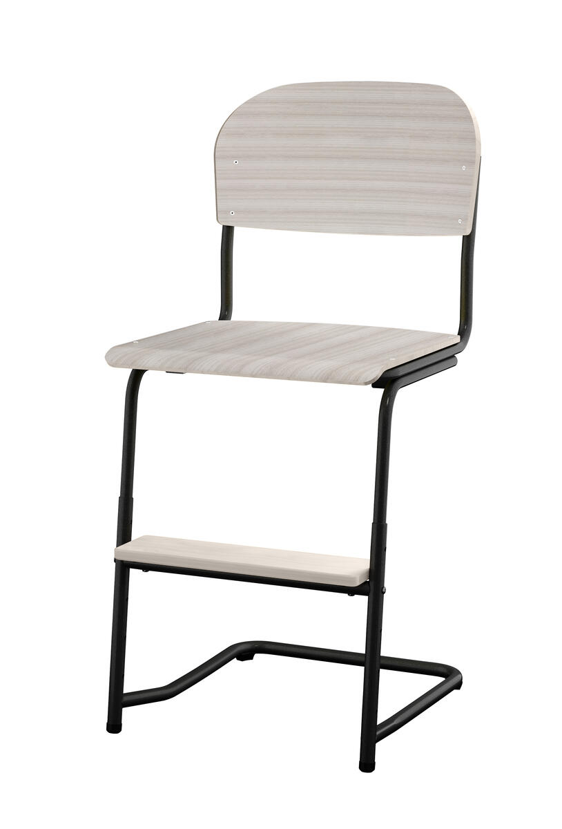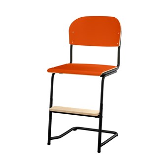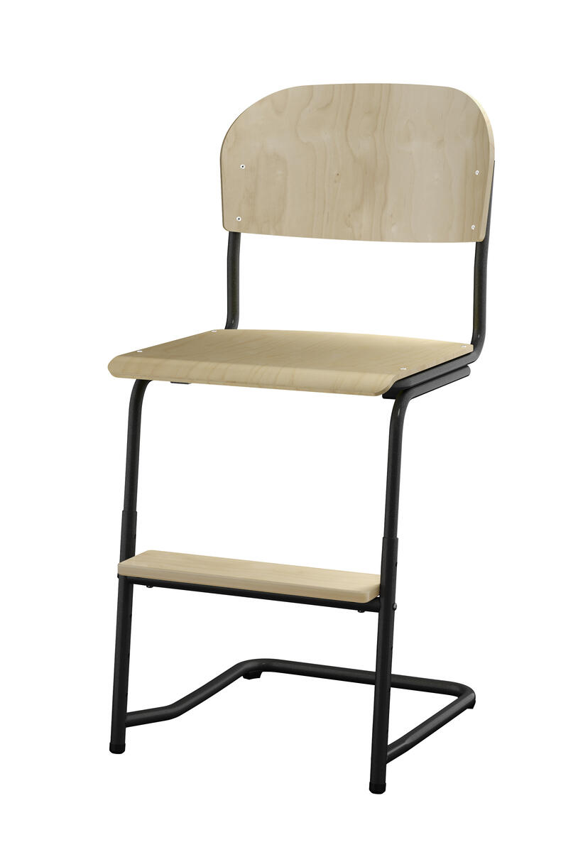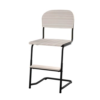 Stapelbar (max 4 st/stapel). Ljuddämpande tassar. Upphängningsbar på bord. Reglerbar fotbräda i 3 fasta lägen. Sitthöjd: 63 cm. Sitsmått: B42xD39 cm. Totaldjupet på stativet är 54 cm. Vikt 7,4 kg. Sits och rygg i högtryckslaminat. Silverlackerat stativ RAL 9006.