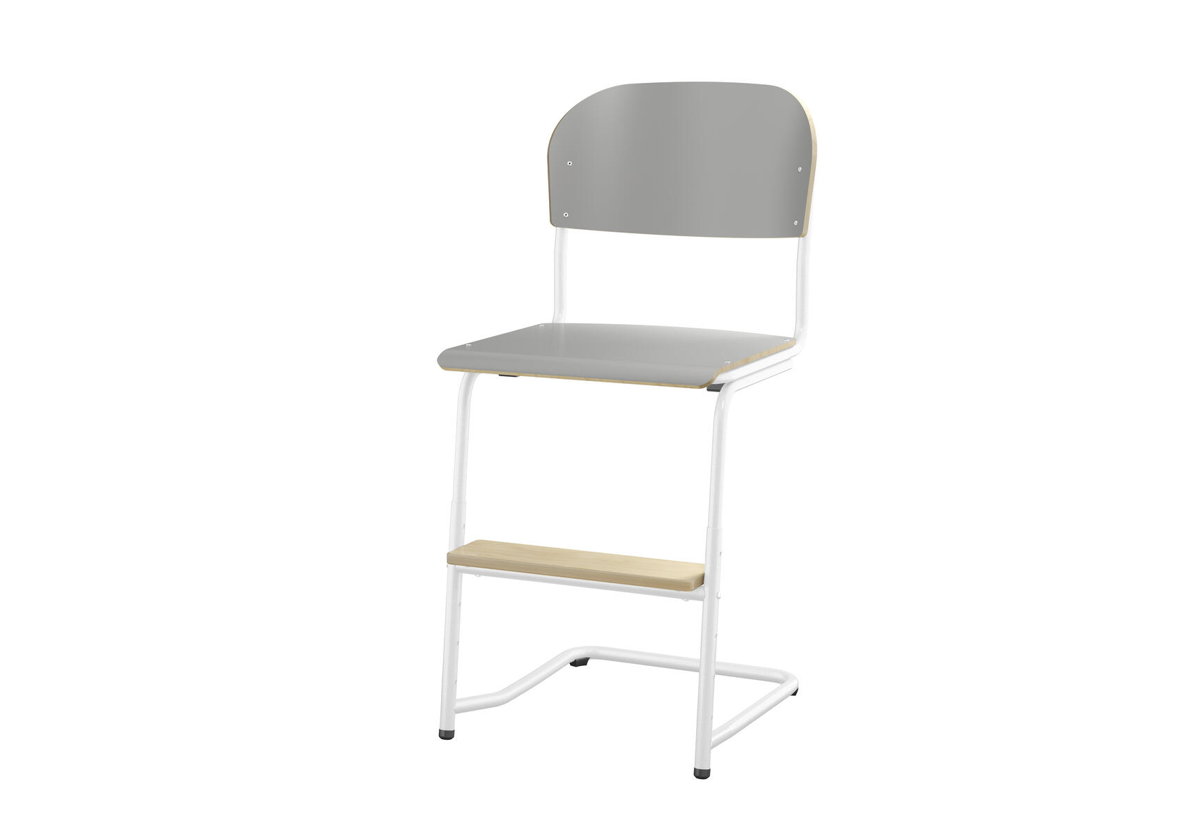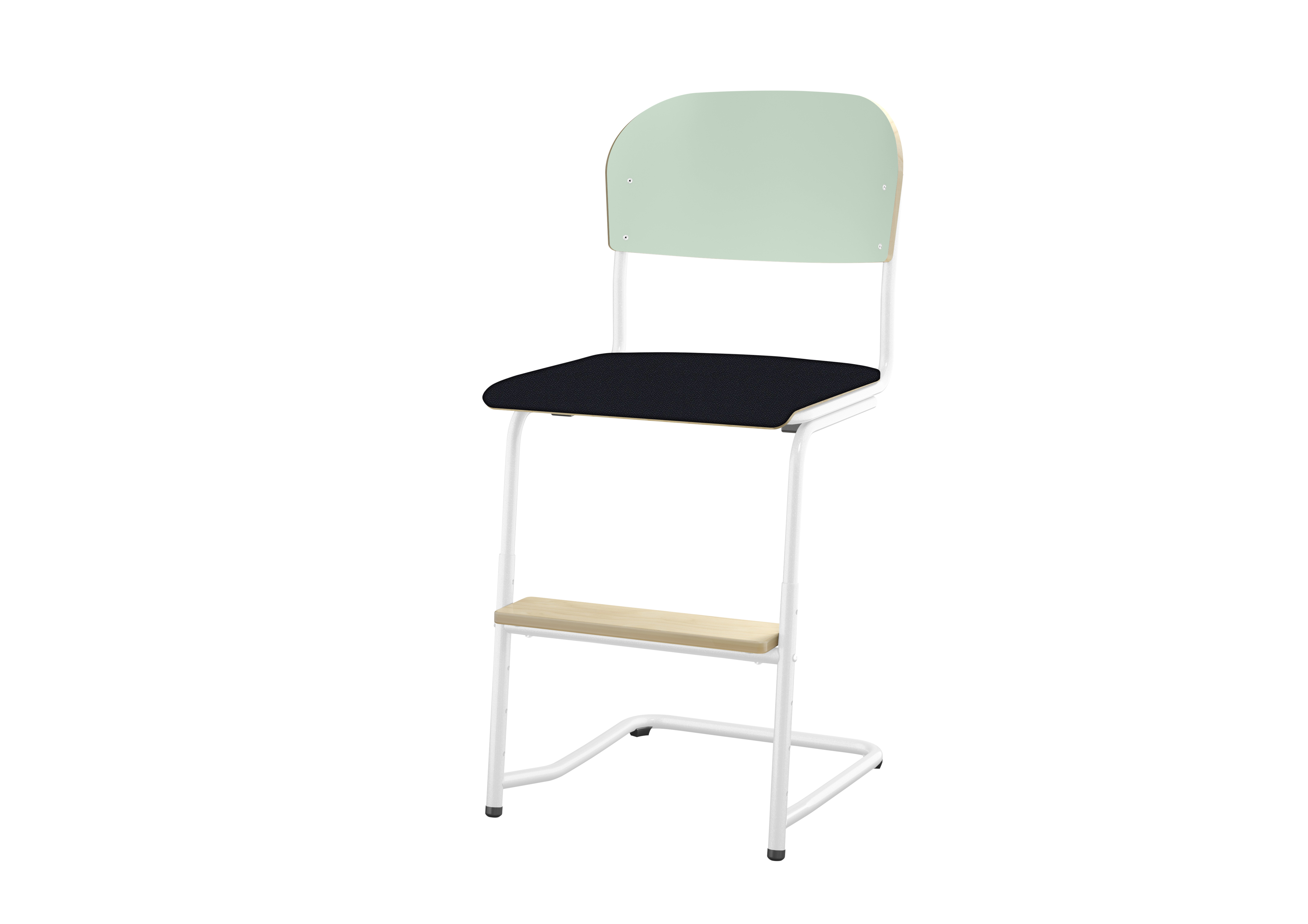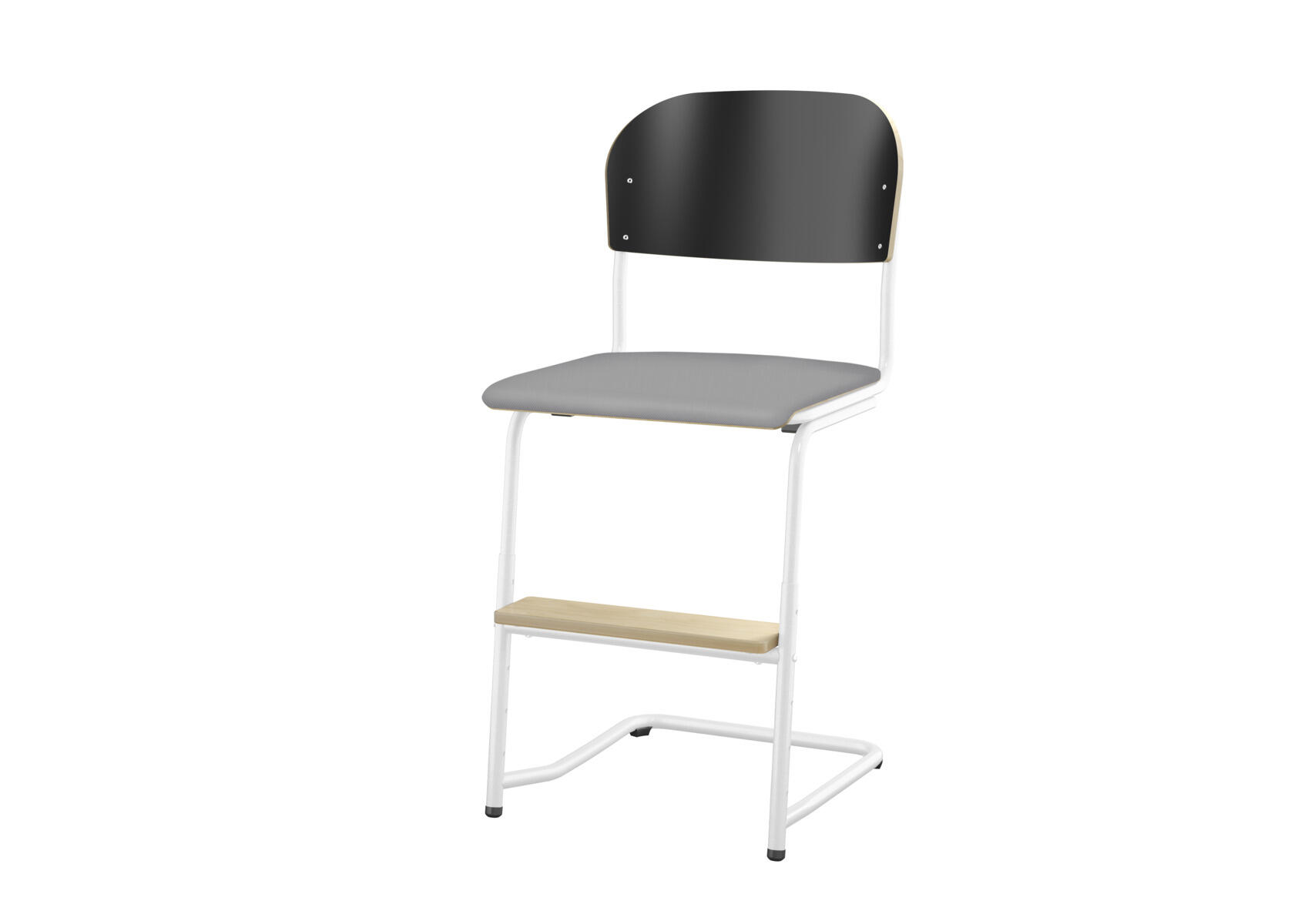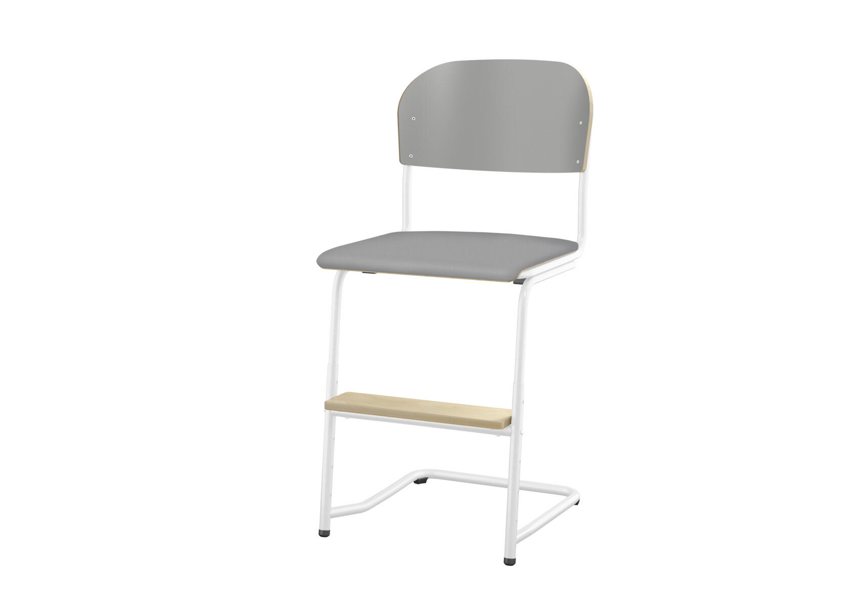 Stapelbar (max 4 st/stapel). Ljuddämpande tassar. Upphängningsbar på bord. Reglerbar fotbräda i 3 fasta lägen. Sitthöjd 50 cm. Sitsmått: B36xD35 cm. Totaldjupet på stativet är 54 cm. Vikt 4,6 kg. Sits och rygg i högtryckslaminat. Silverlackerat stativ, RAL 9006.