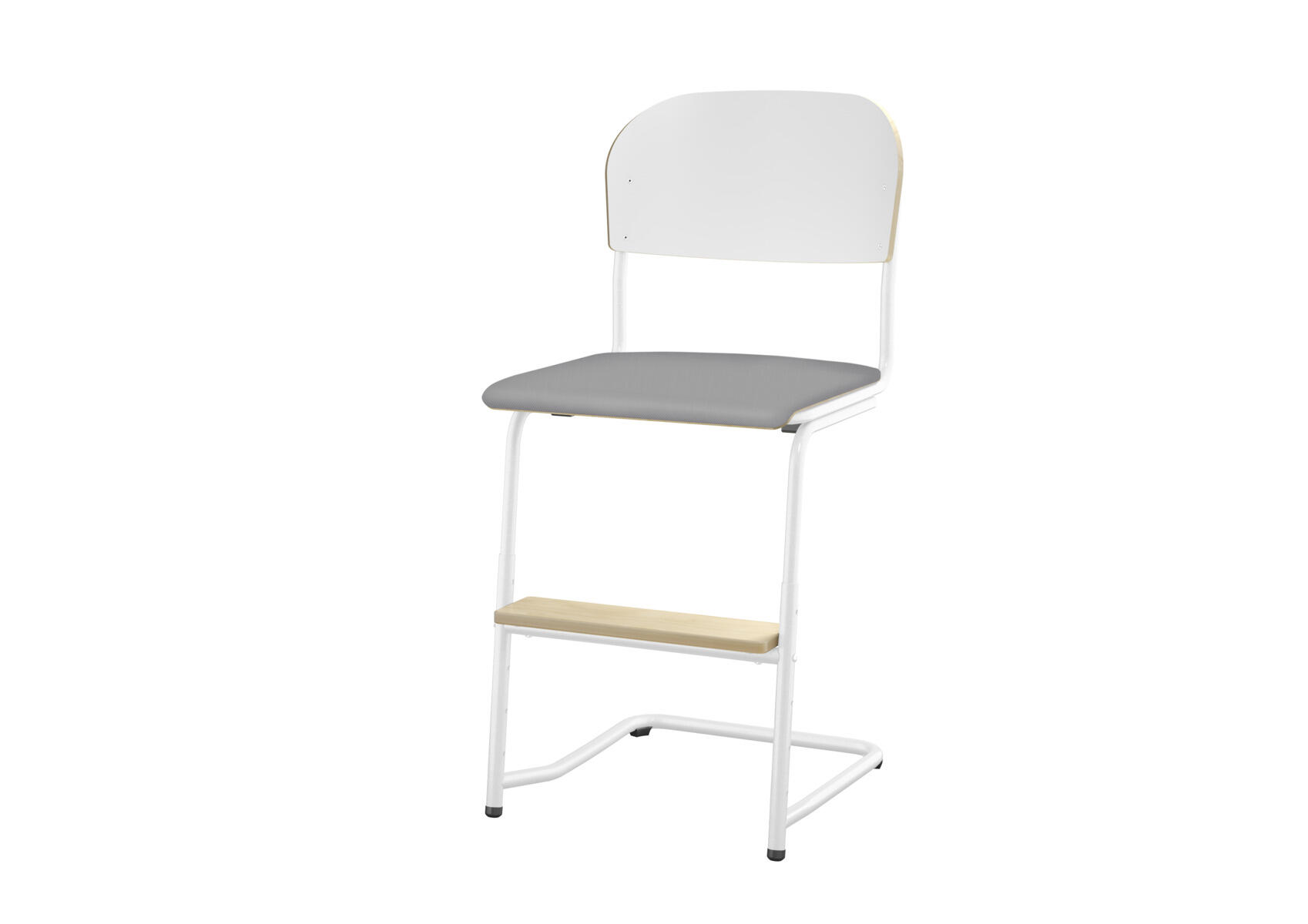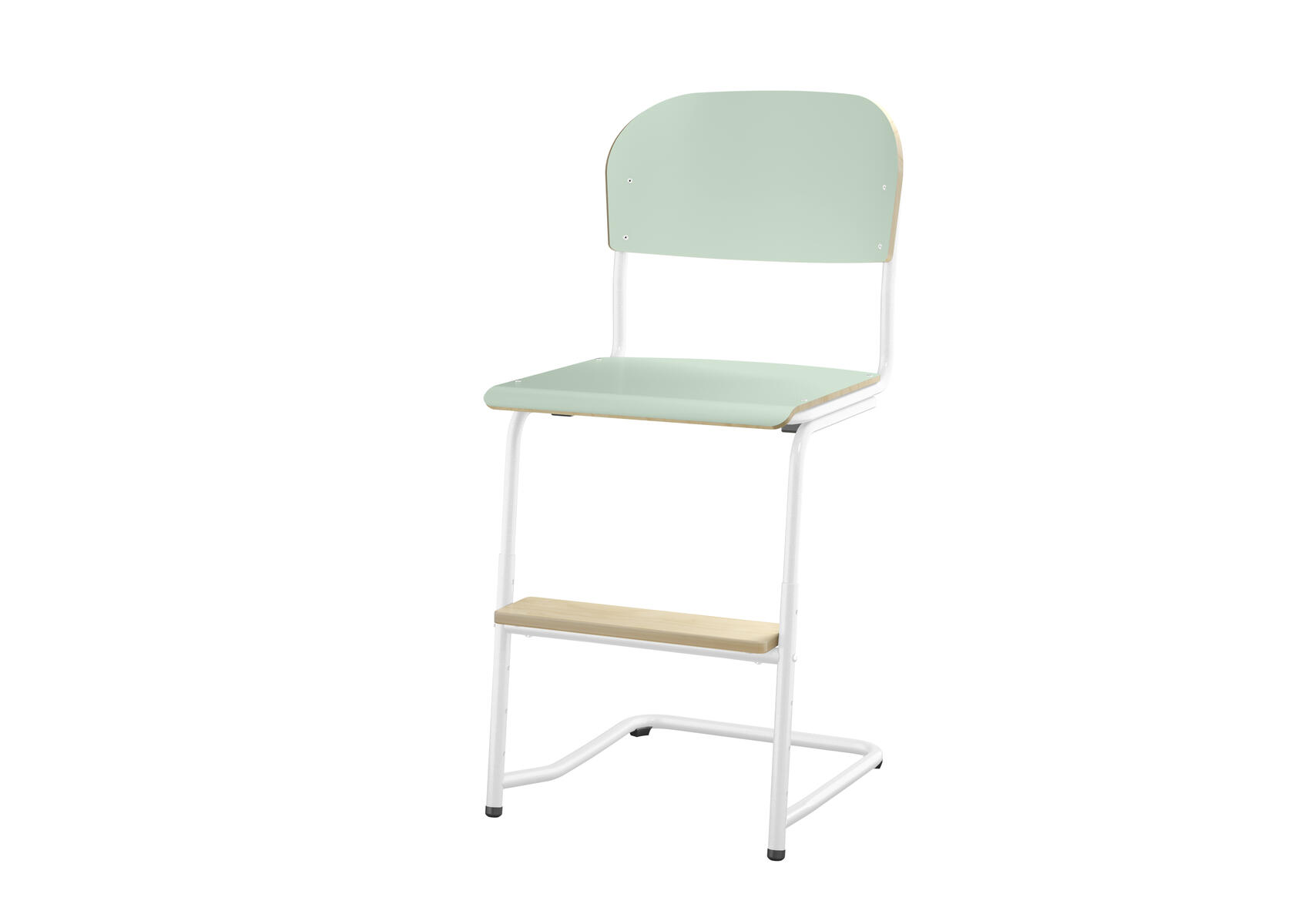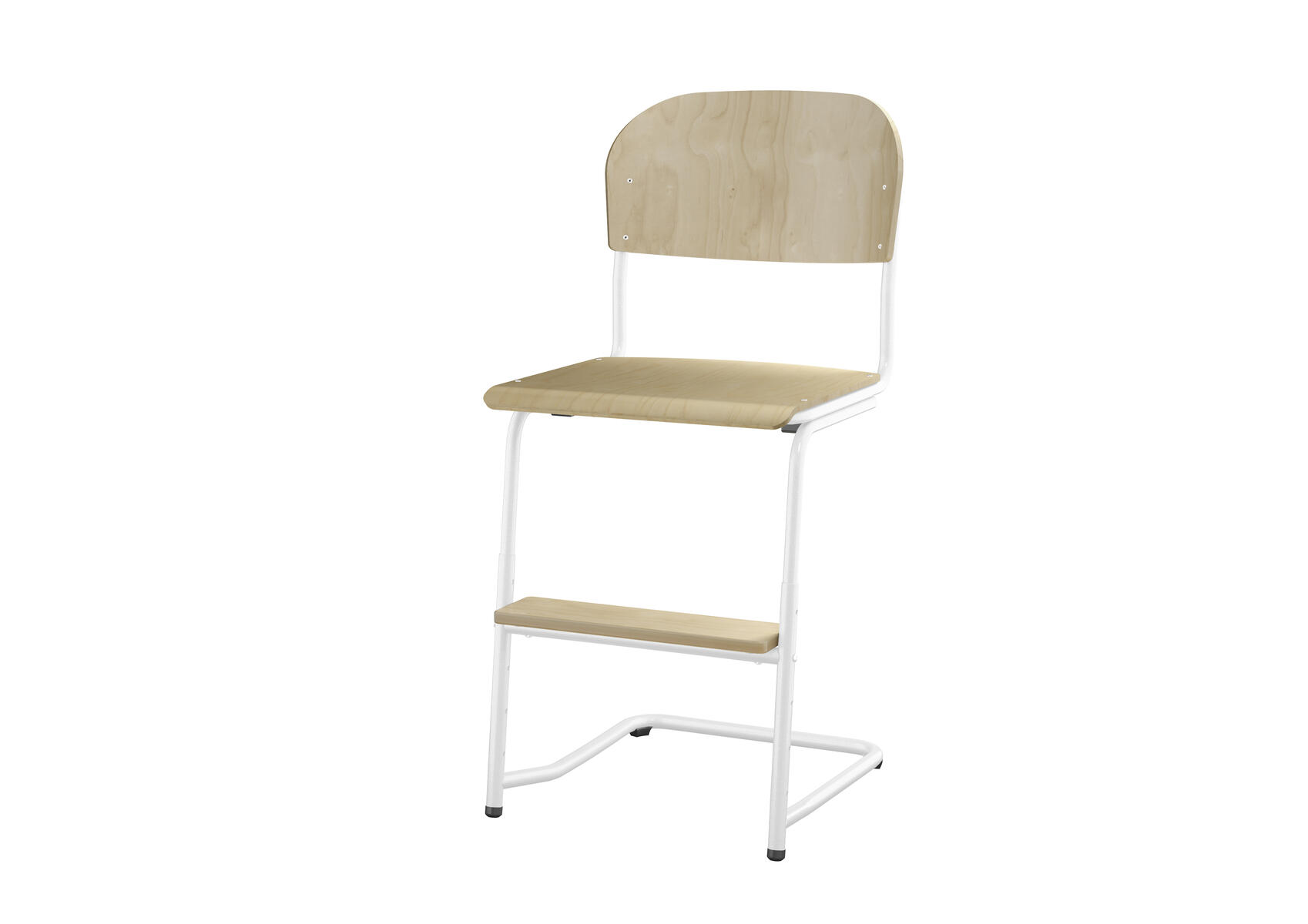 Stapelbar (max 4 st/stapel). Ljuddämpande tassar. Upphängningsbar på bord. Reglerbar fotbräda i 3 fasta lägen. Sitthöjd 50 cm. Sitsmått: B36xD35 cm. Totaldjupet på stativet är 54 cm. Vikt 4,6 kg. Sits och rygg i högtryckslaminat. Silverlackerat stativ, RAL 9006.