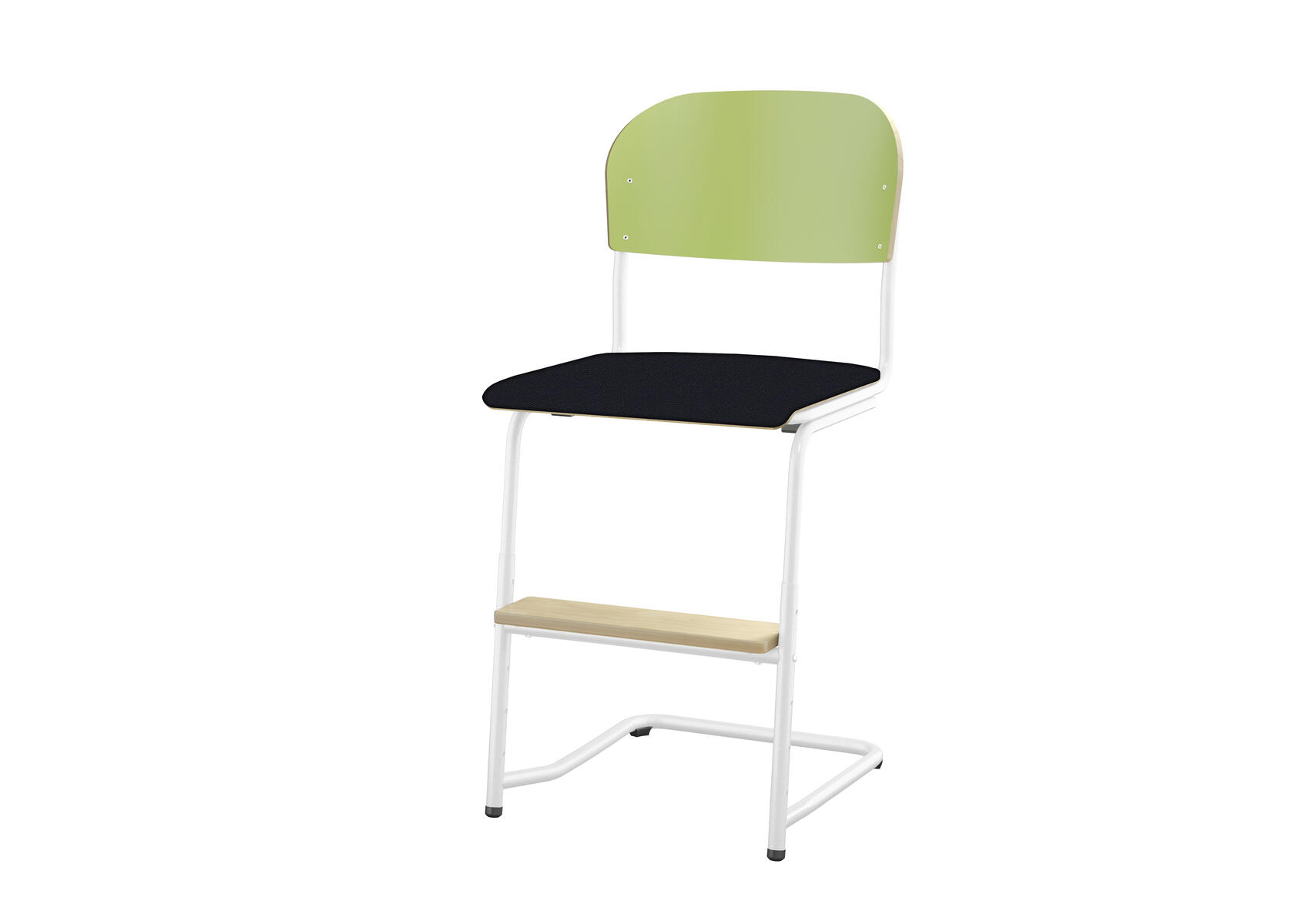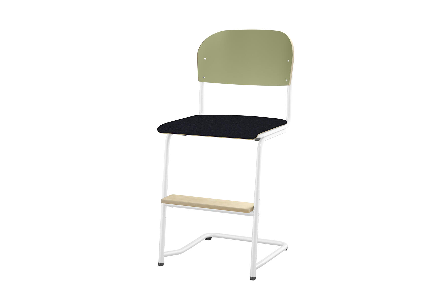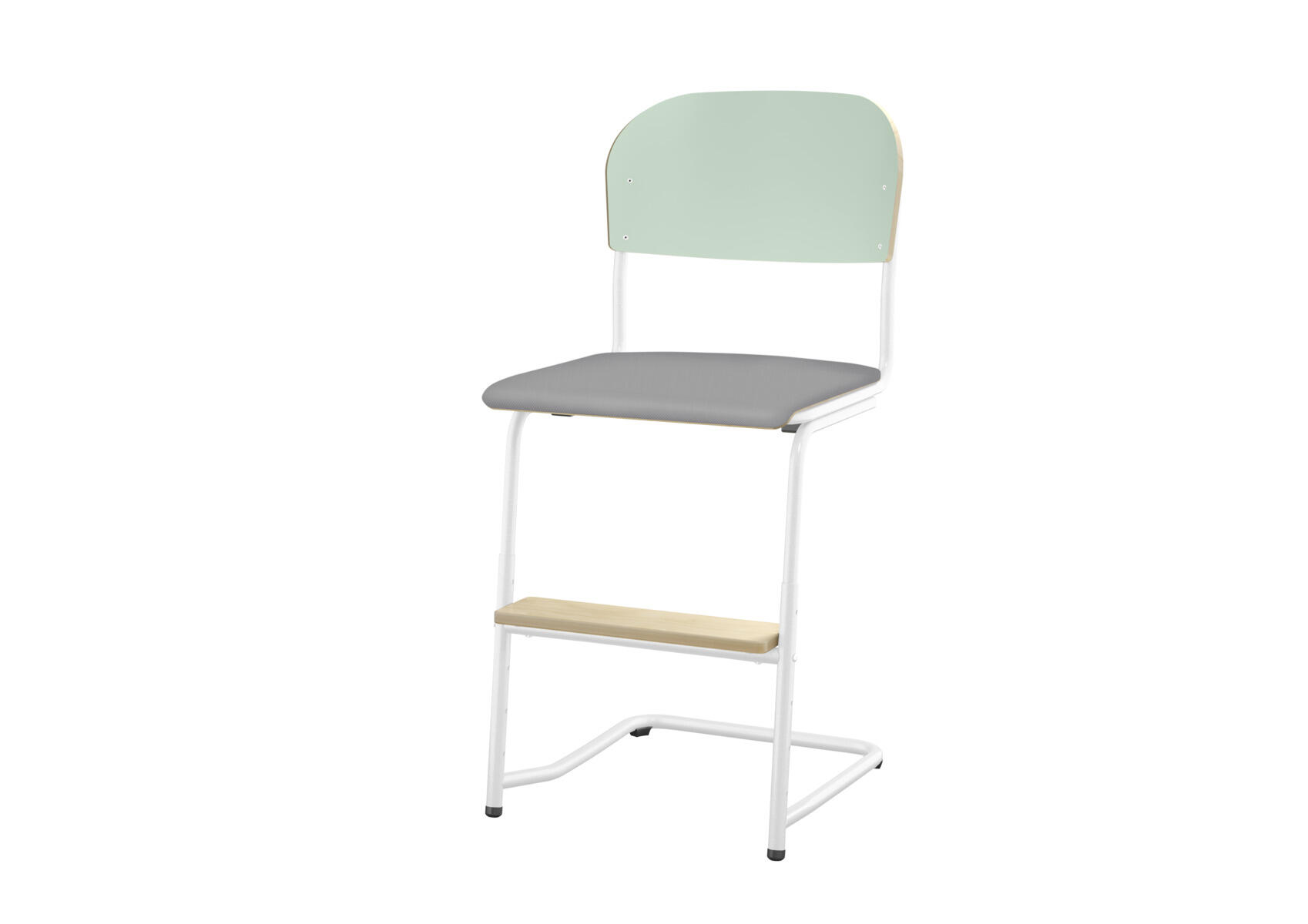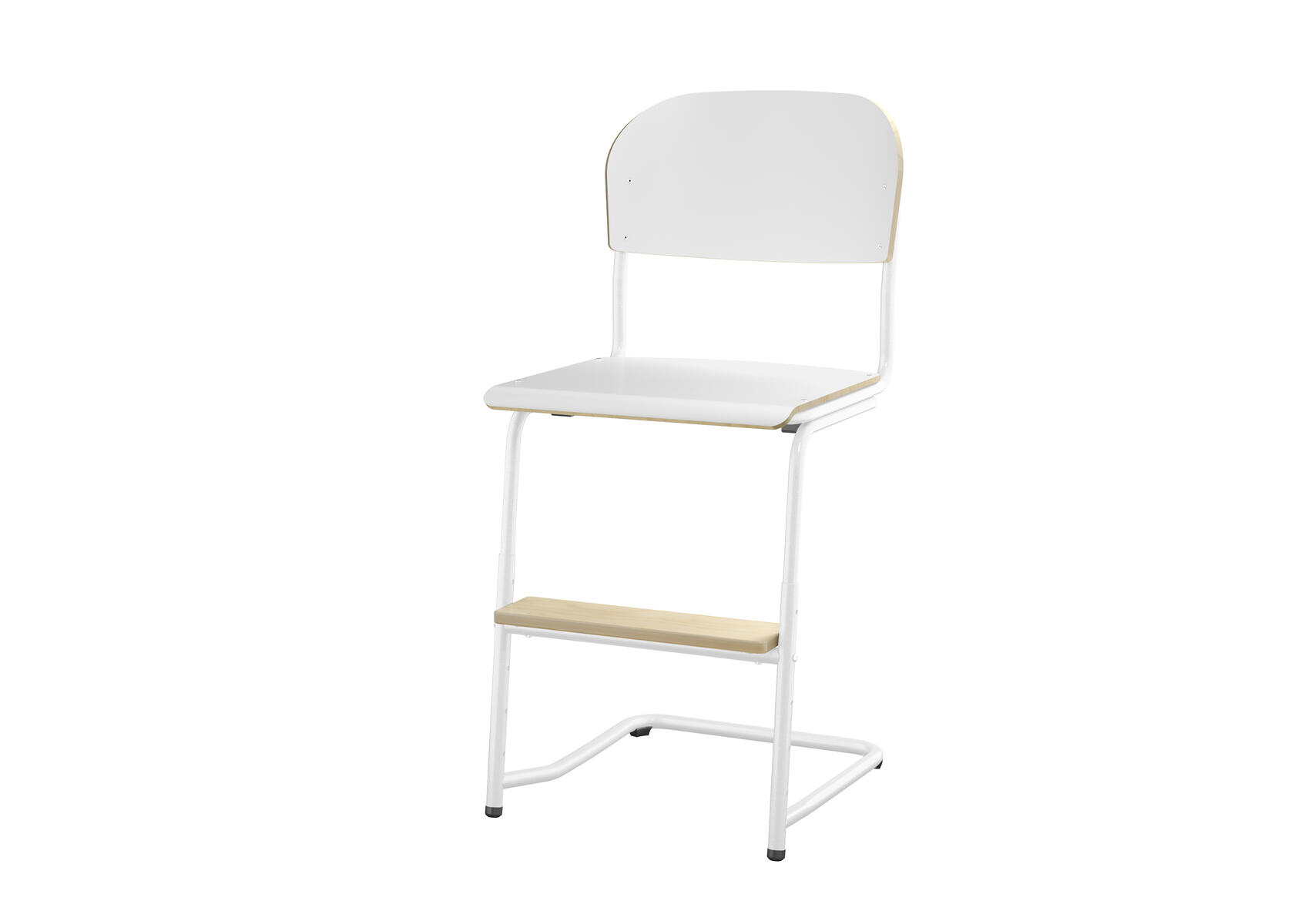 Stapelbar (max 4 st/stapel). Ljuddämpande tassar. Upphängningsbar på bord. Reglerbar fotbräda i 3 fasta lägen. Sitthöjd 50 cm. Sitsmått: B36xD35 cm. Totaldjupet på stativet är 54 cm. Vikt 4,6 kg. Sits och rygg i högtryckslaminat. Silverlackerat stativ, RAL 9006.