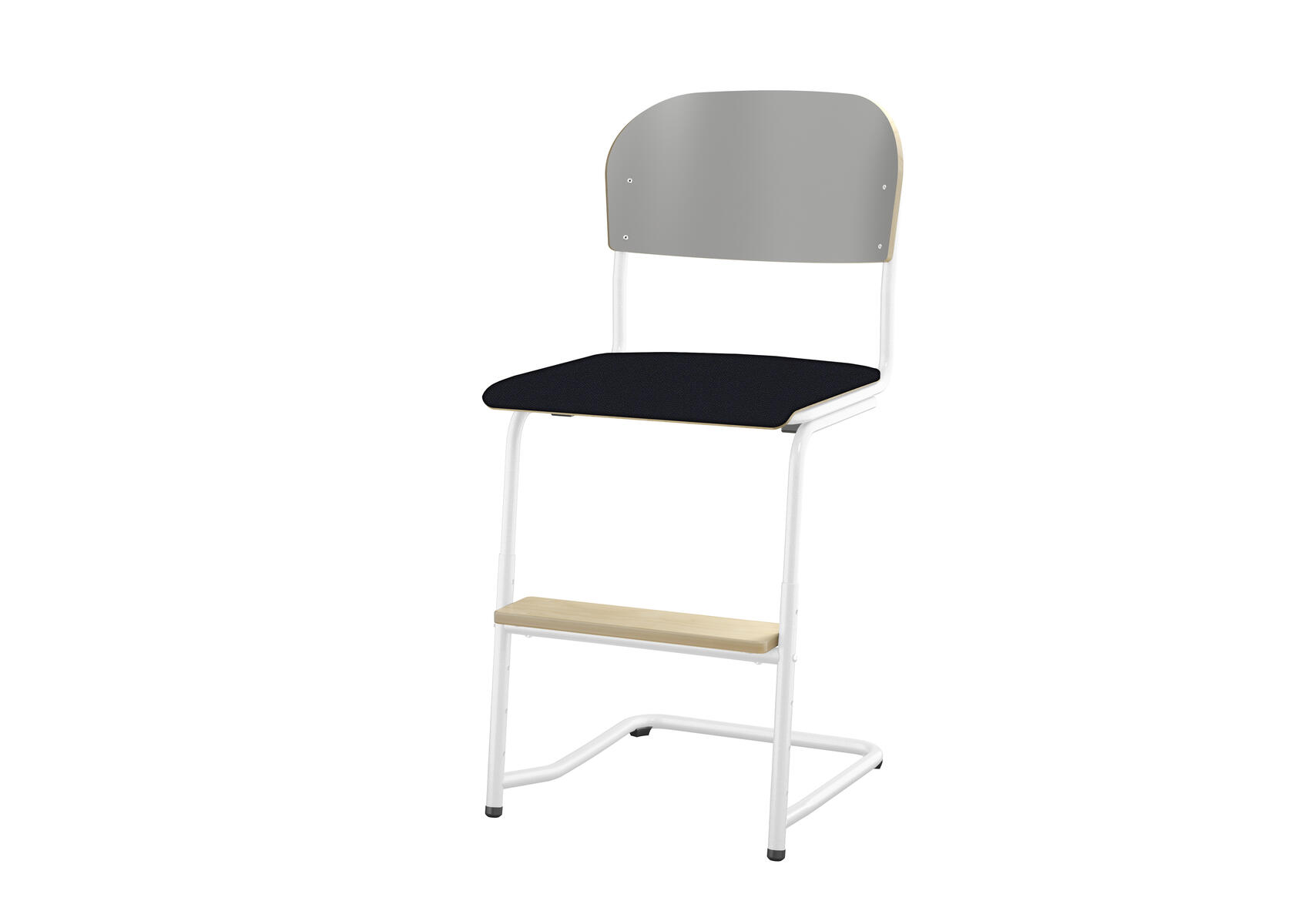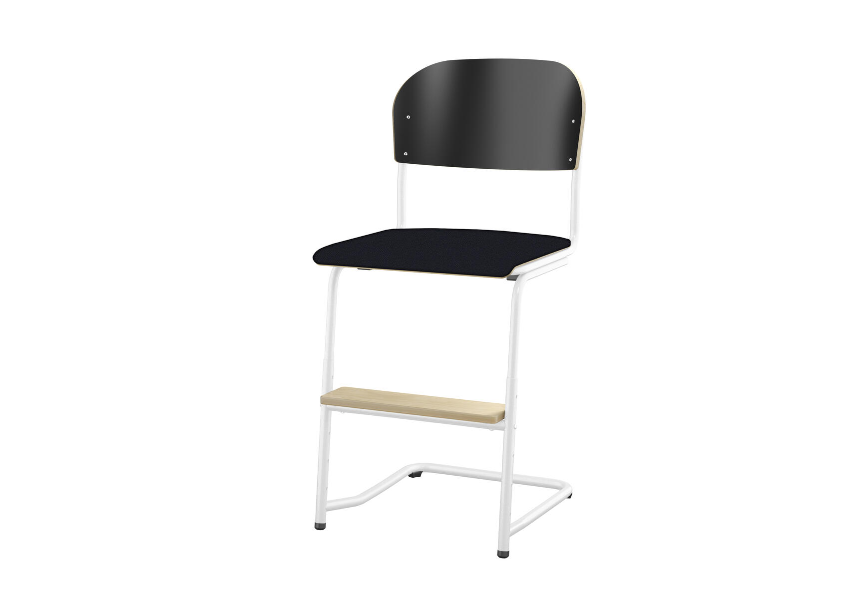 Stapelbar (max 4 st/stapel). Ljuddämpande tassar. Upphängningsbar på bord. Reglerbar fotbräda i 3 fasta lägen. Sitthöjd: 63 cm. Sitsmått: B42xD39 cm. Totaldjupet på stativet är 54 cm. Vikt 7,4 kg. Sits och rygg i högtryckslaminat. Silverlackerat stativ RAL 9006.