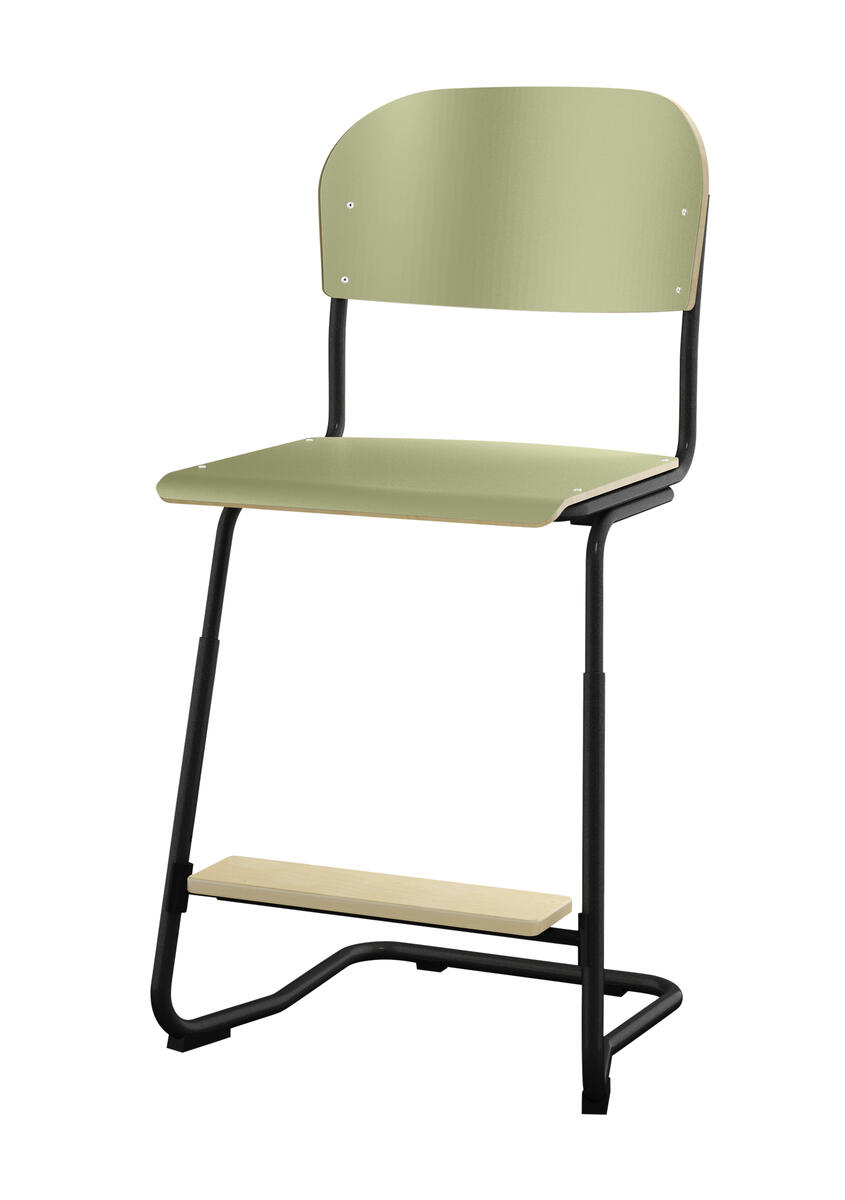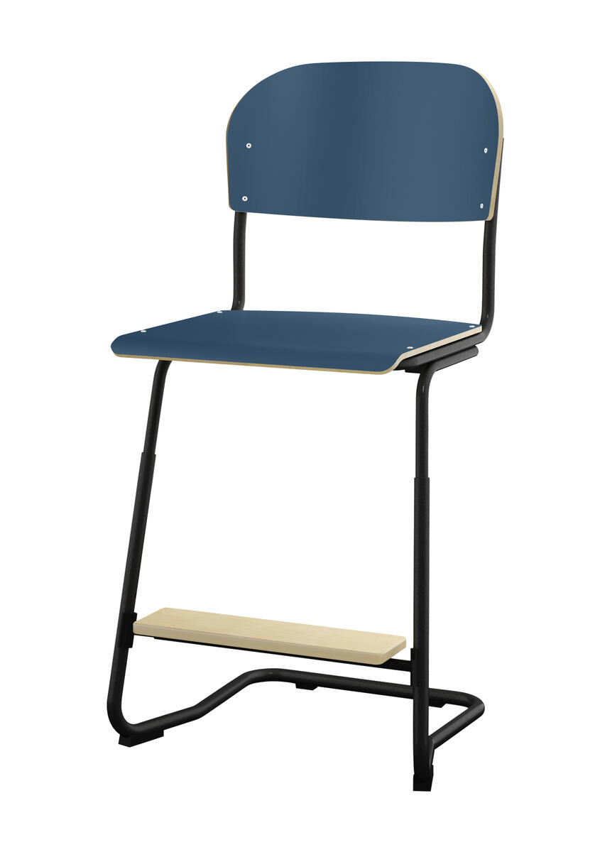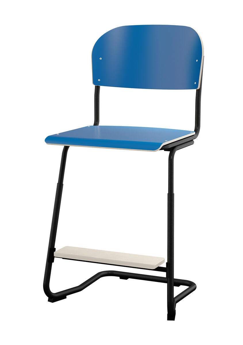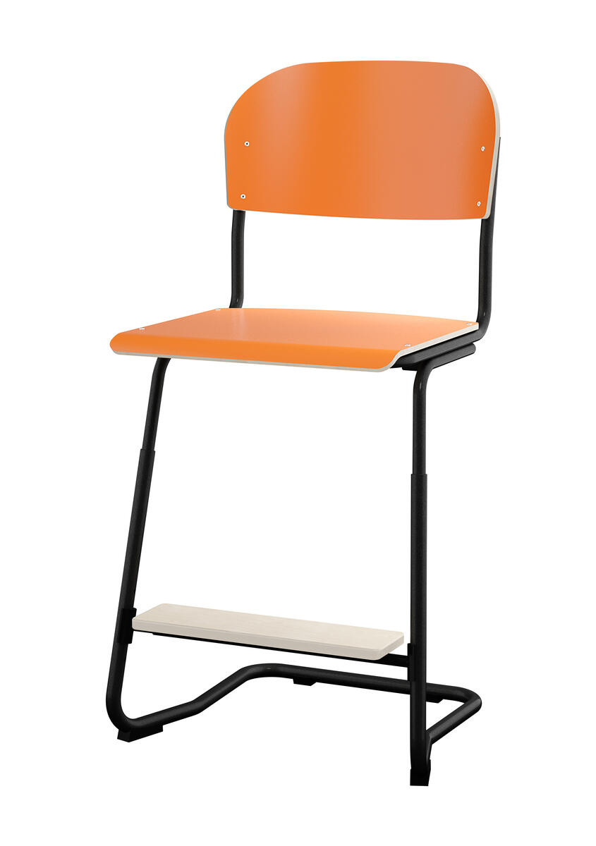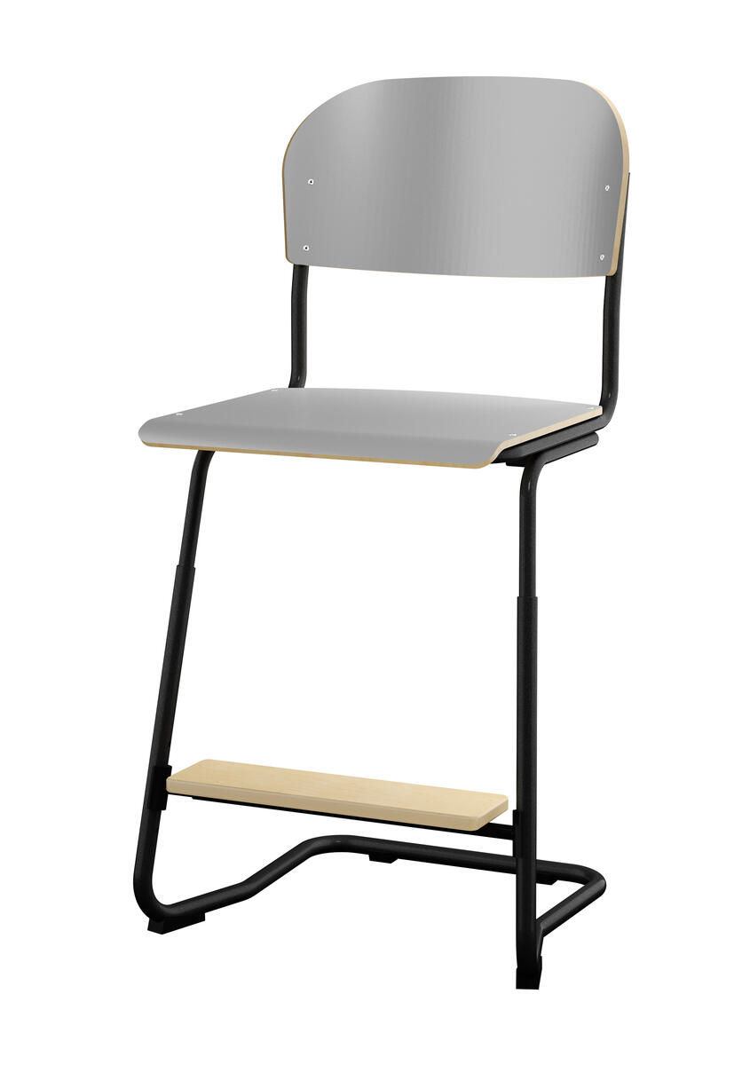 Stapelbar (max 4 st/stapel). Ljuddämpande tassar. Upphängningsbar på bord. Reglerbar fotbräda i 3 fasta lägen. Sitthöjd 50 cm. Sitsmått: B36xD35 cm. Totaldjupet på stativet är 54 cm. Vikt 4,6 kg. Sits och rygg i högtryckslaminat. Silverlackerat stativ, RAL 9006.