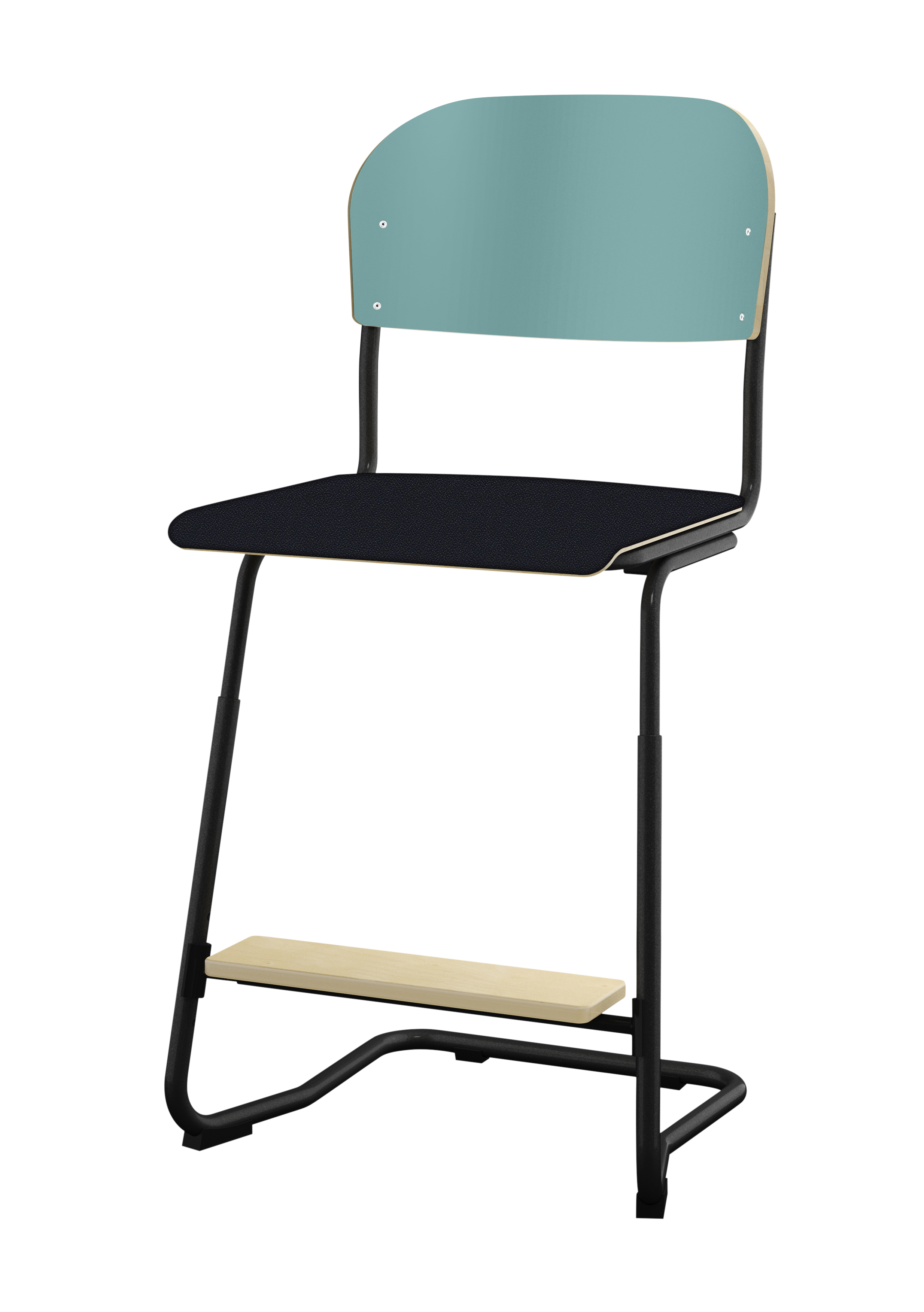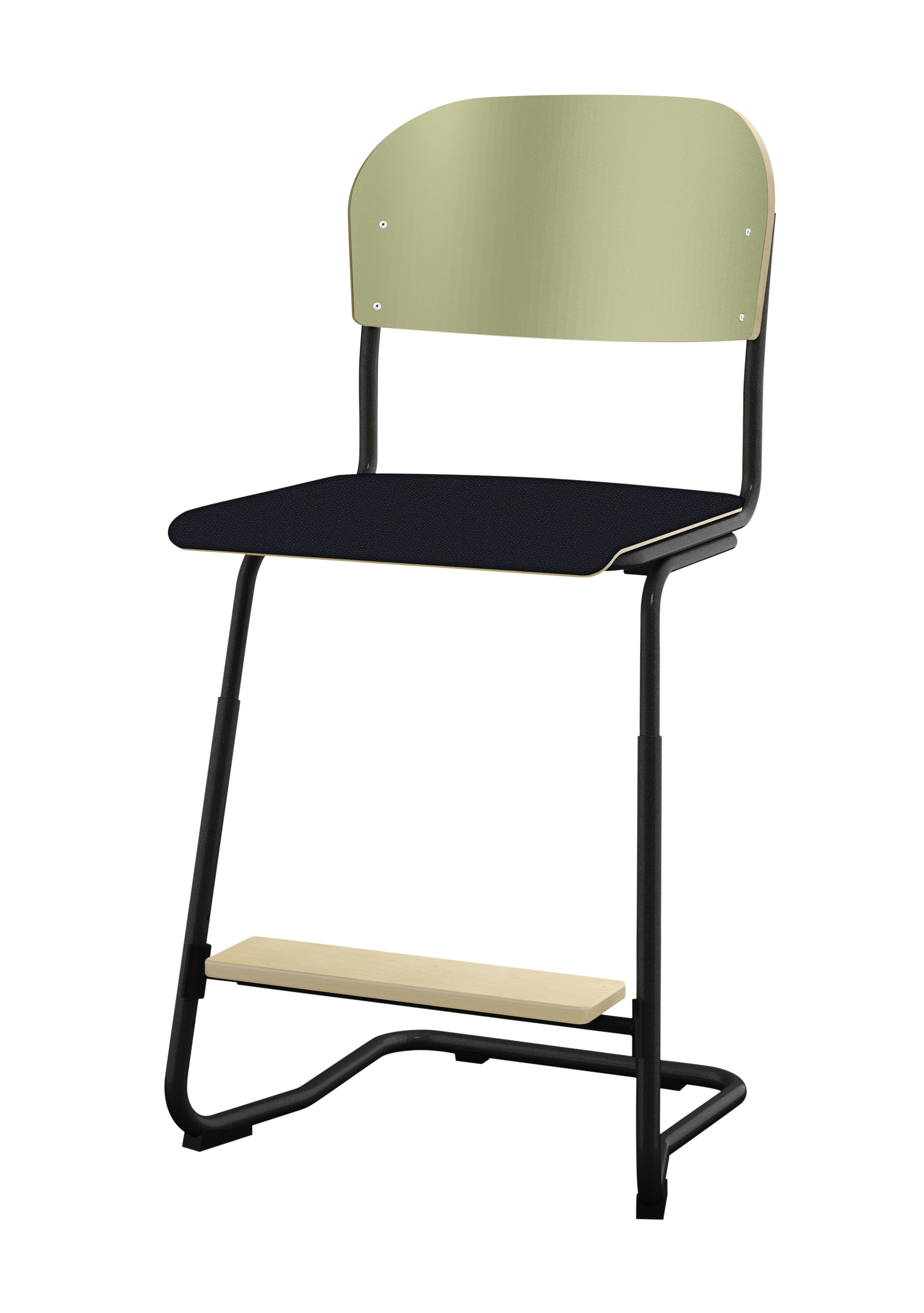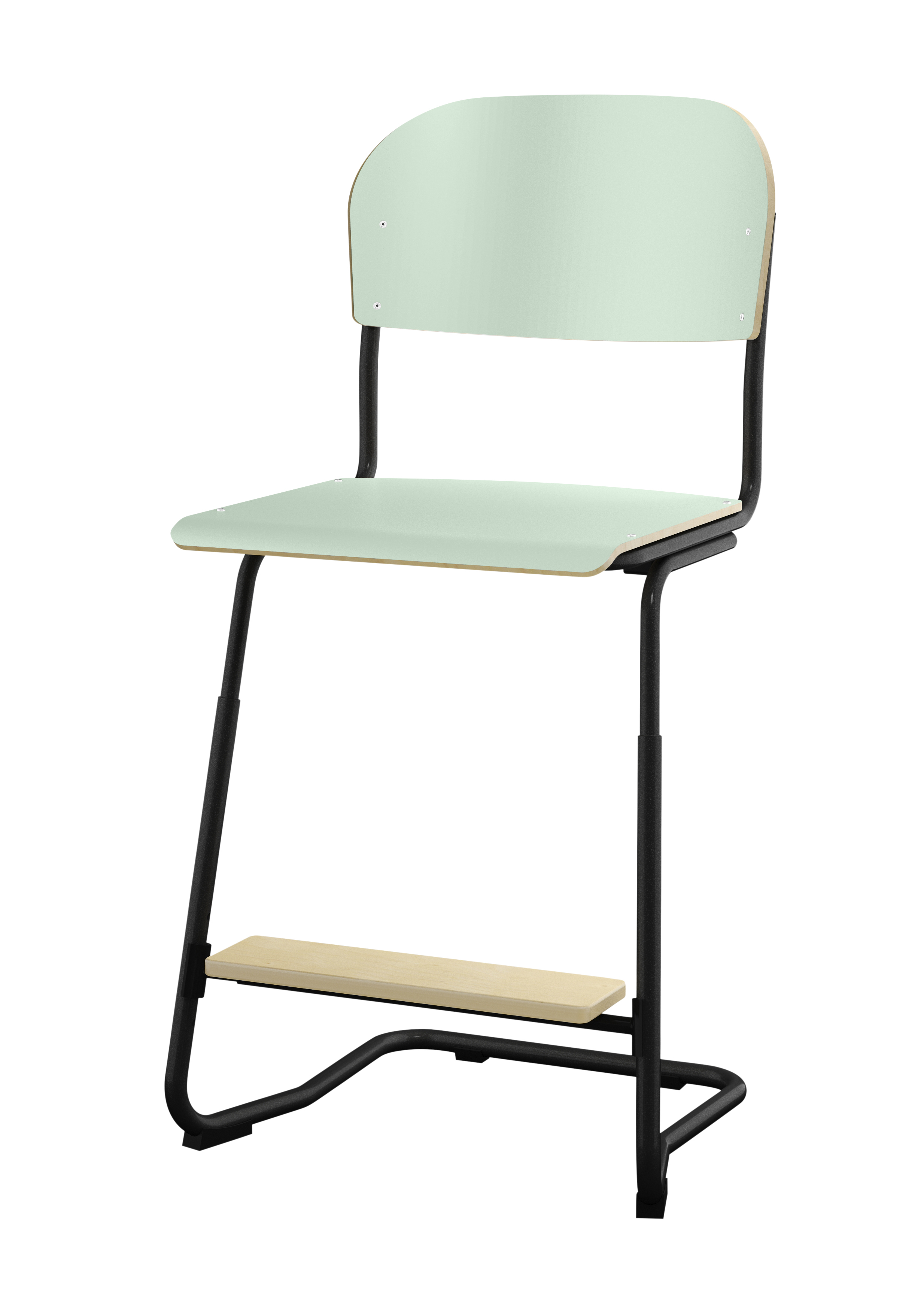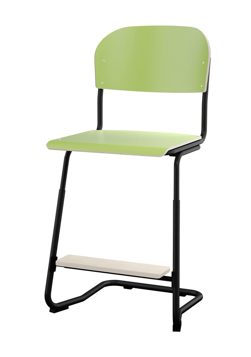 Stapelbar (max 4 st/stapel). Ljuddämpande tassar. Upphängningsbar på bord. Reglerbar fotbräda i 3 fasta lägen. Sitthöjd 50 cm. Sitsmått: B36xD35 cm. Totaldjupet på stativet är 54 cm. Vikt 4,6 kg. Sits och rygg i högtryckslaminat. Silverlackerat stativ, RAL 9006.