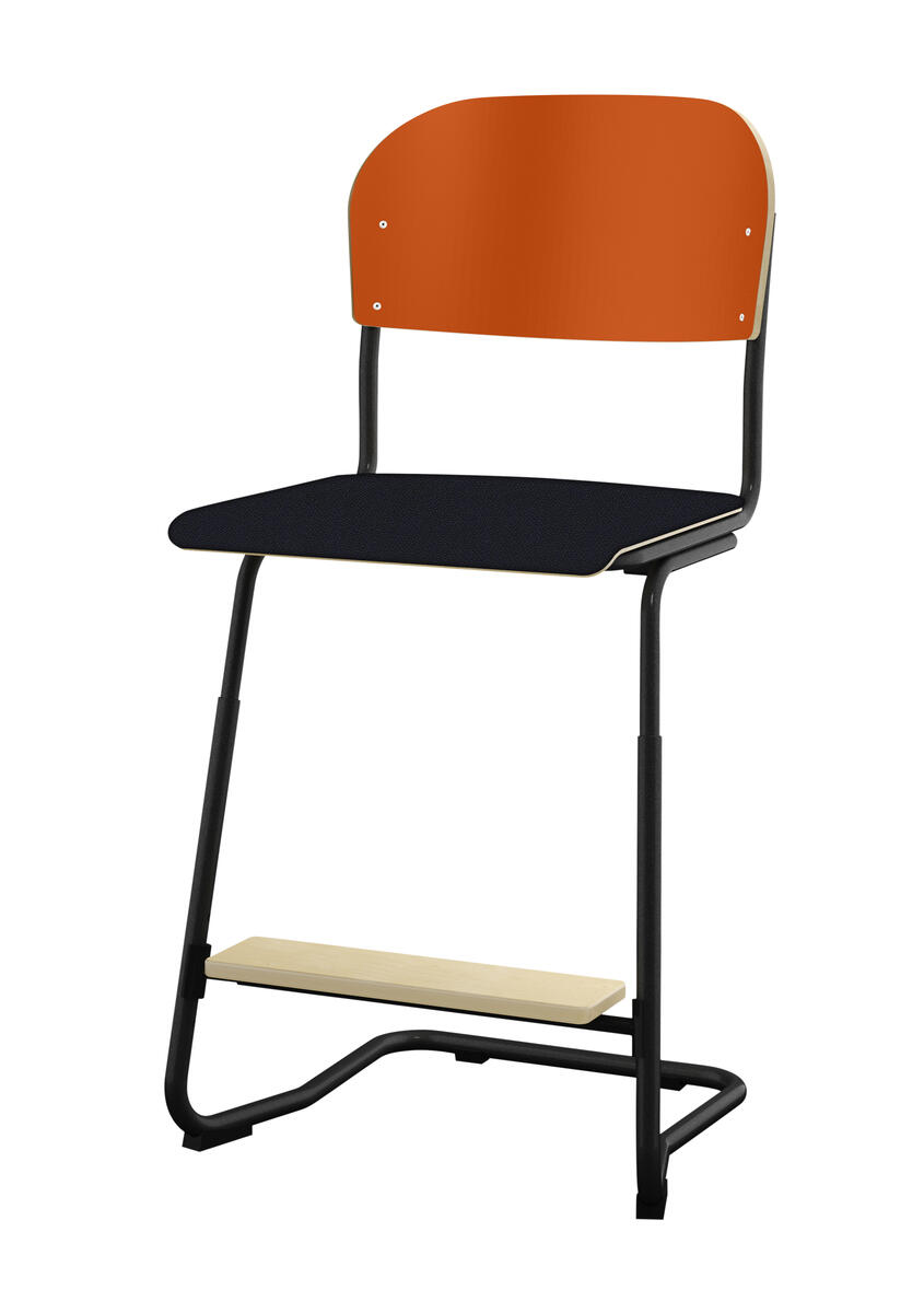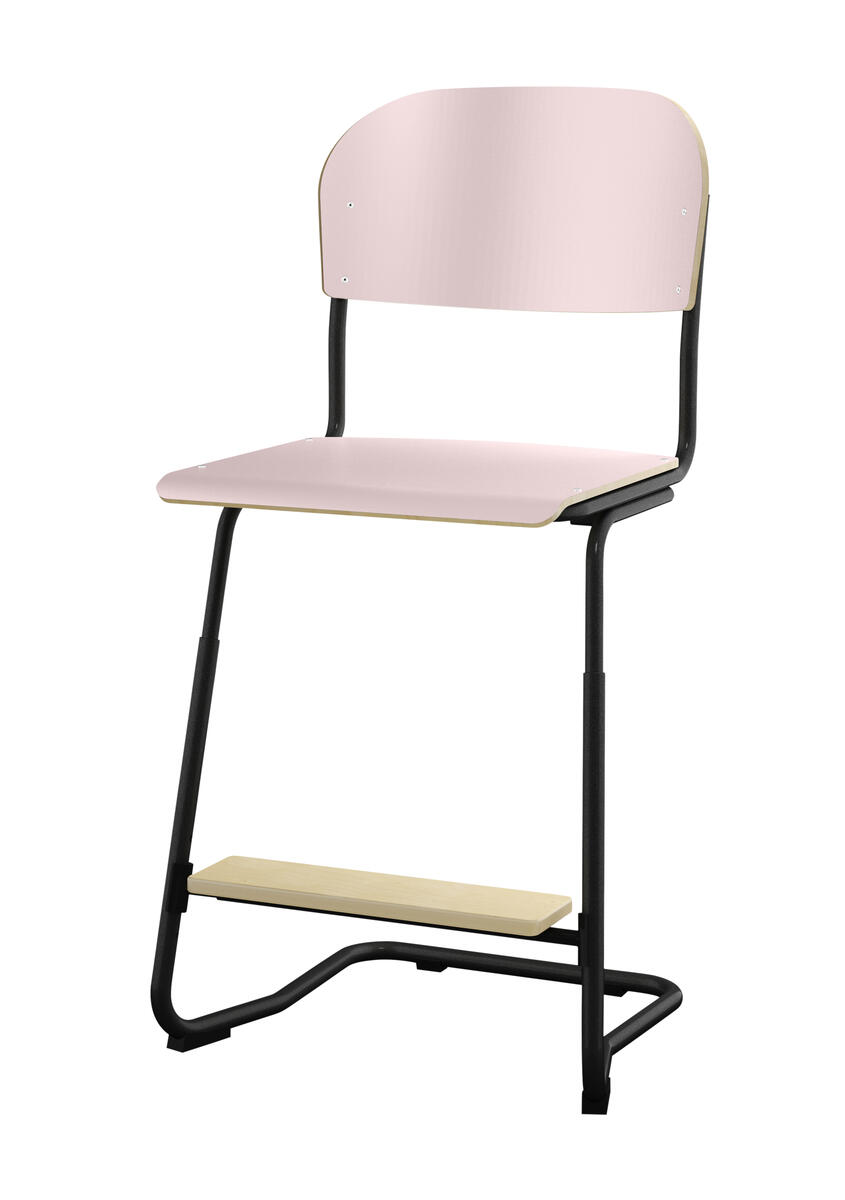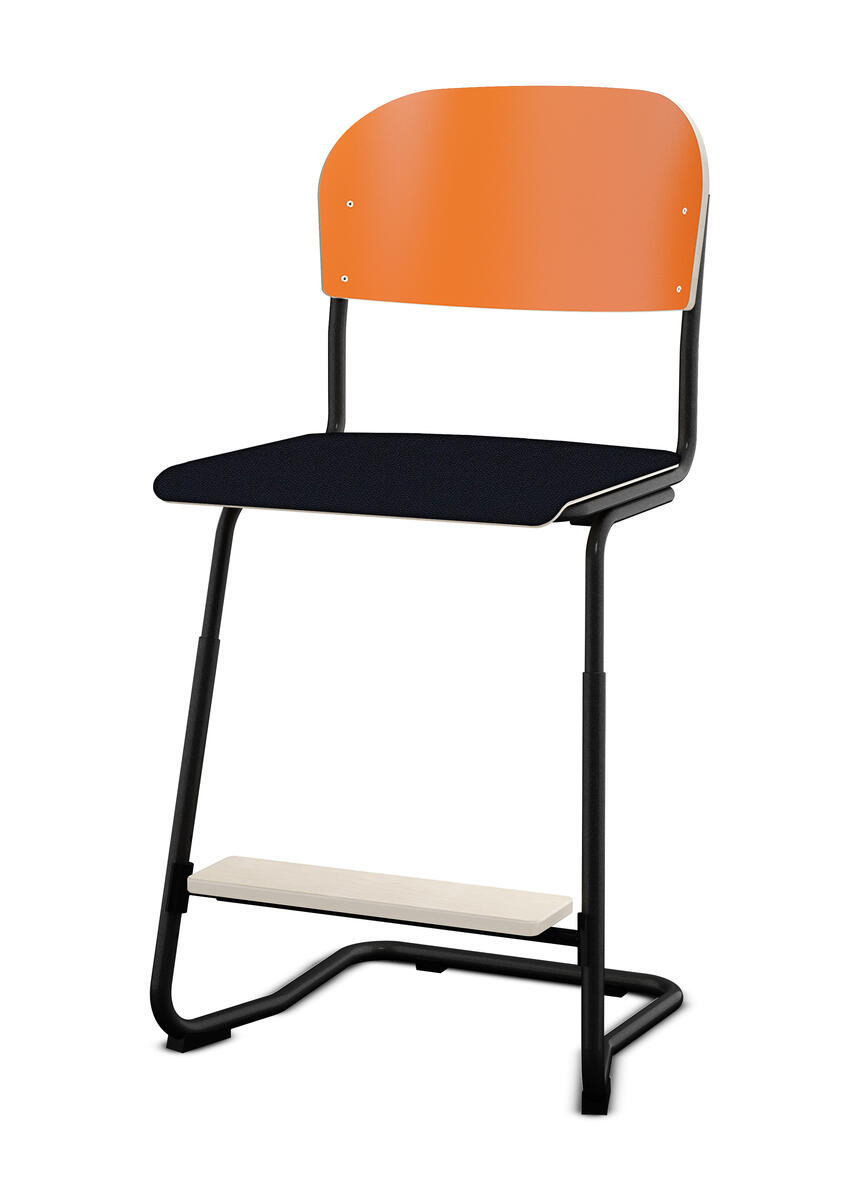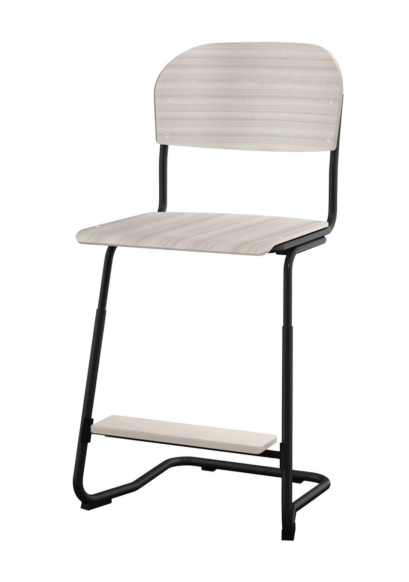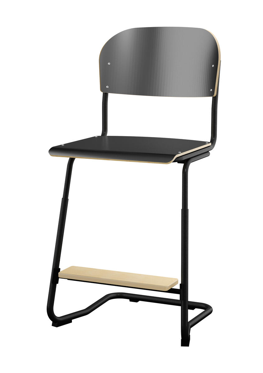 Stapelbar (max 4 st/stapel). Ljuddämpande tassar. Upphängningsbar på bord. Reglerbar fotbräda i 3 fasta lägen. Sitthöjd: ställbar till 57, 60 eller 63 cm. Sitsmått: B42xD39 cm. Totaldjupet på stativet är 54 cm. Vikt 7,4 kg. Sits och rygg i högtryckslaminat. Svartlackerat stativ, RAL 9005.