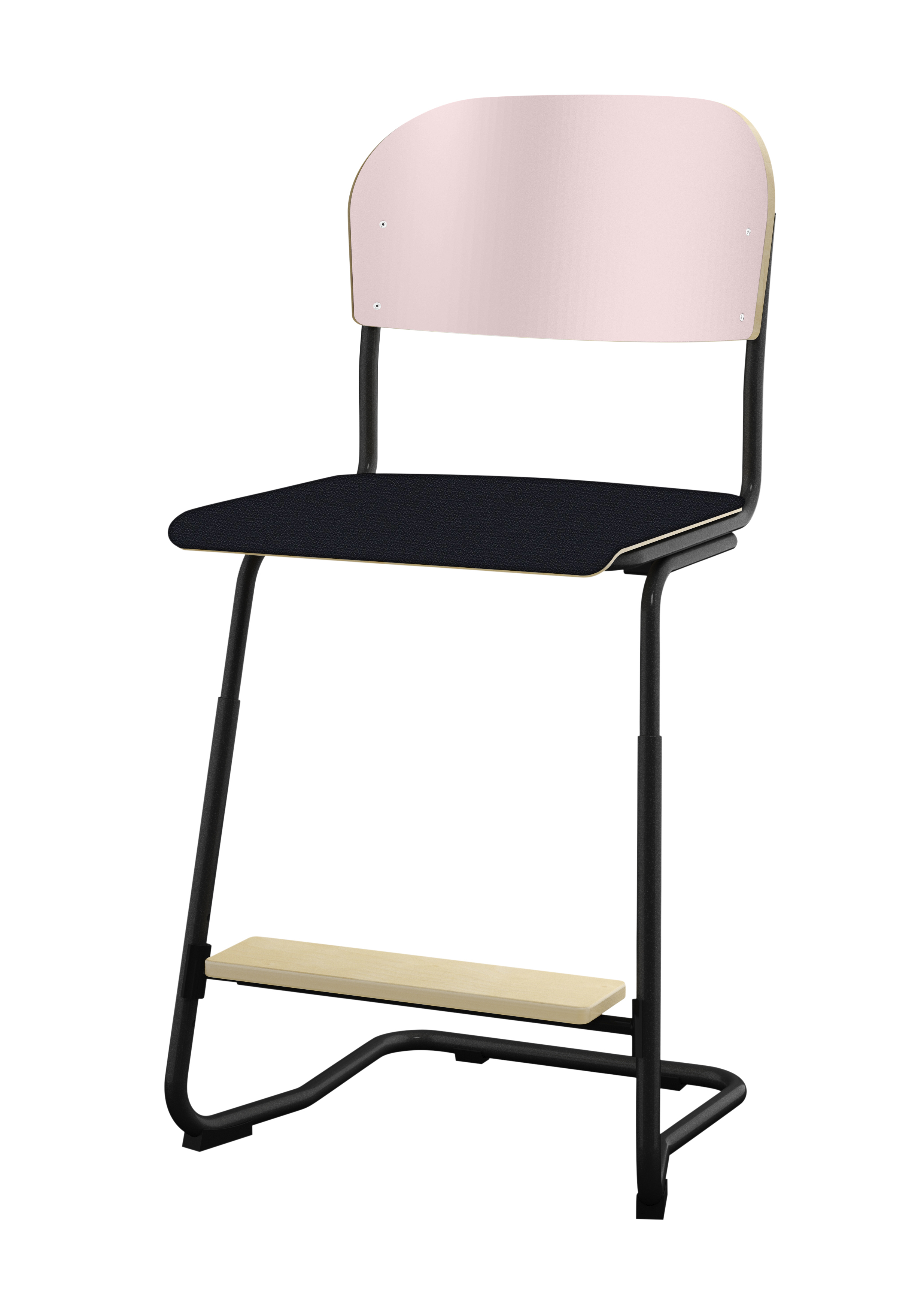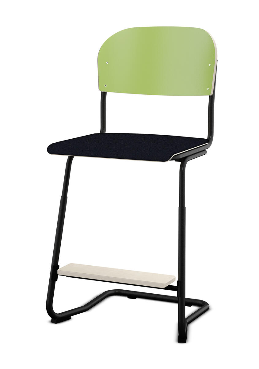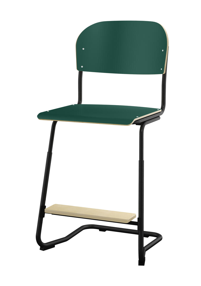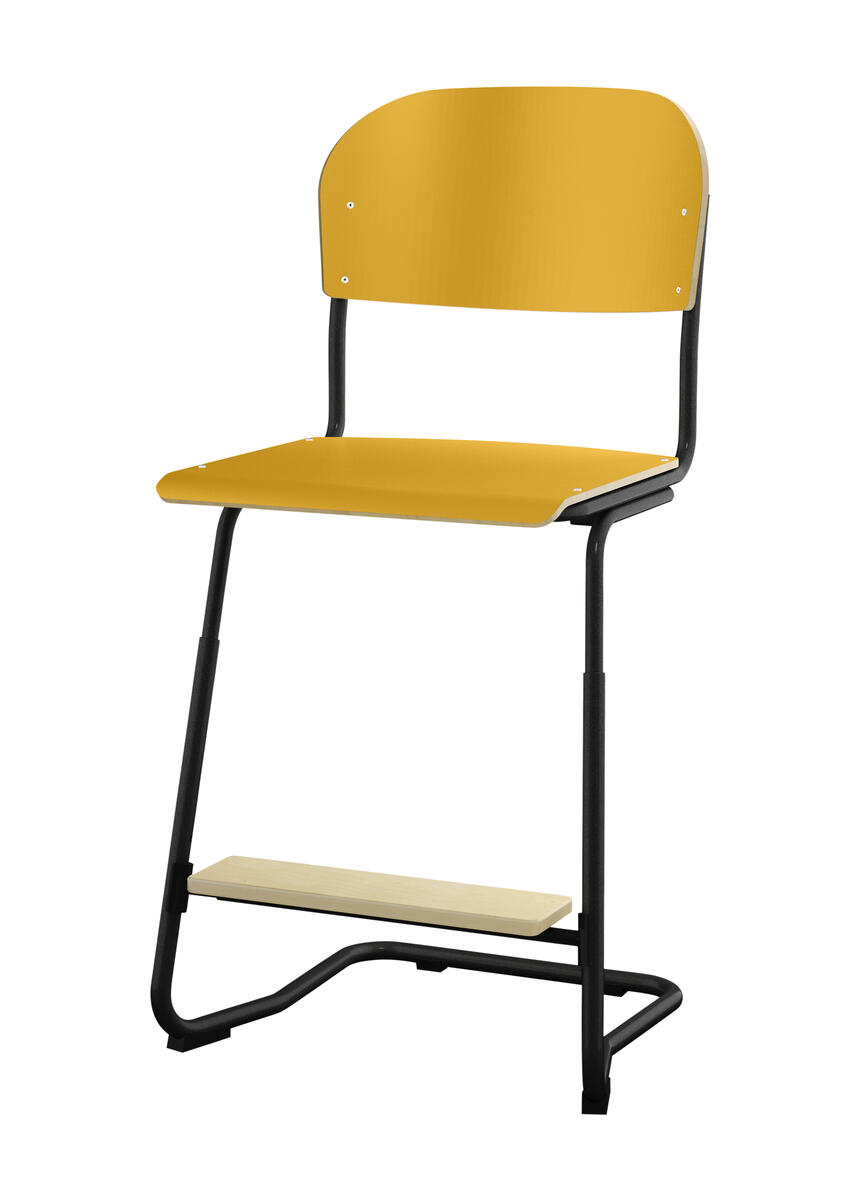 Stapelbar (max 4 st/stapel). Ljuddämpande tassar. Upphängningsbar på bord. Reglerbar fotbräda i 3 fasta lägen. Sitthöjd: ställbar till 57, 60 eller 63 cm. Sitsmått: B42xD39 cm. Totaldjupet på stativet är 54 cm. Vikt 7,4 kg. Sits och rygg i högtryckslaminat. Svartlackerat stativ, RAL 9005.
