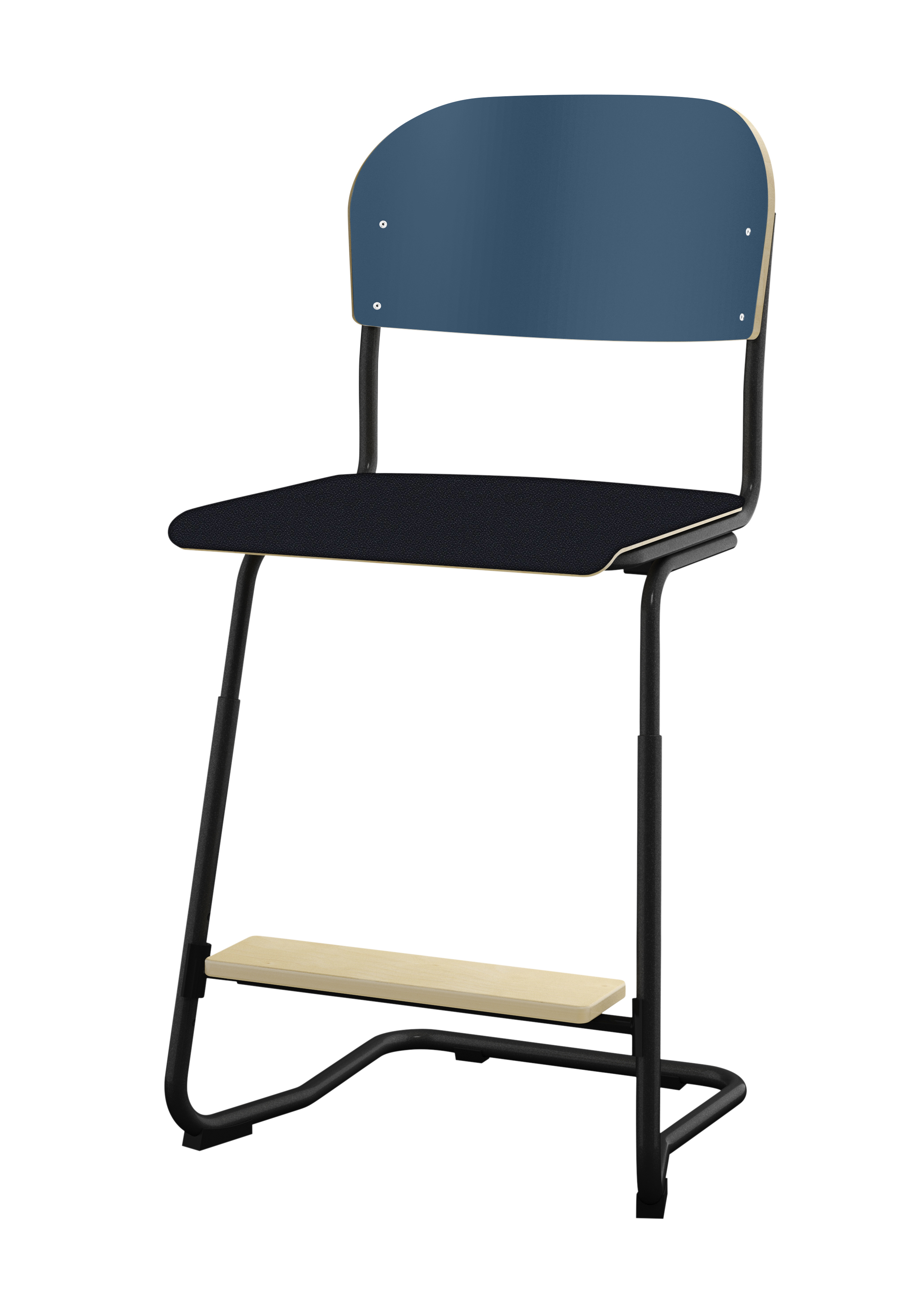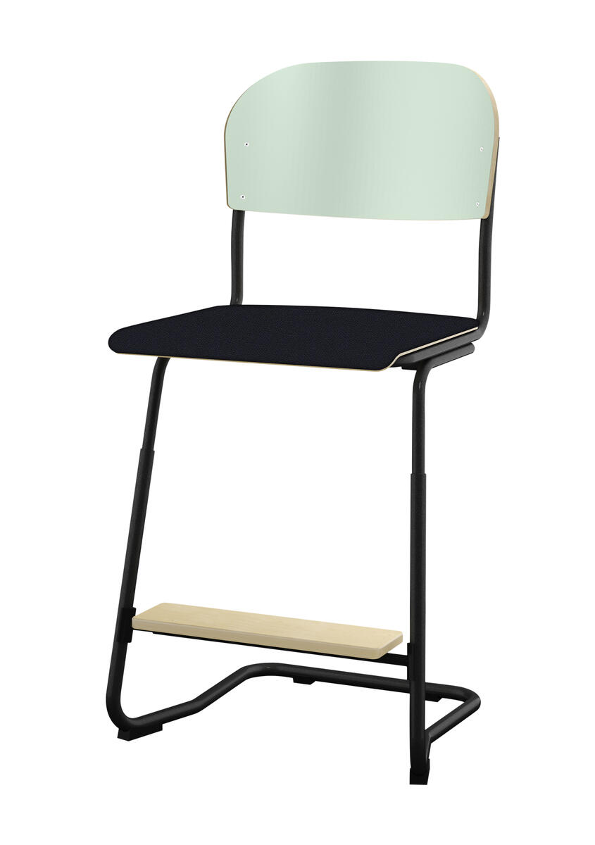 Stapelbar (max 4 st/stapel). Ljuddämpande tassar. Upphängningsbar på bord. Reglerbar fotbräda i 3 fasta lägen. Sitthöjd: ställbar till 57, 60 eller 63 cm. Sitsmått: B36xD35 cm. Totaldjupet på stativet är 54 cm. Vikt 6,4 kg. Sits och rygg i högtryckslaminat. Svartlackerat stativ, RAL 9005.