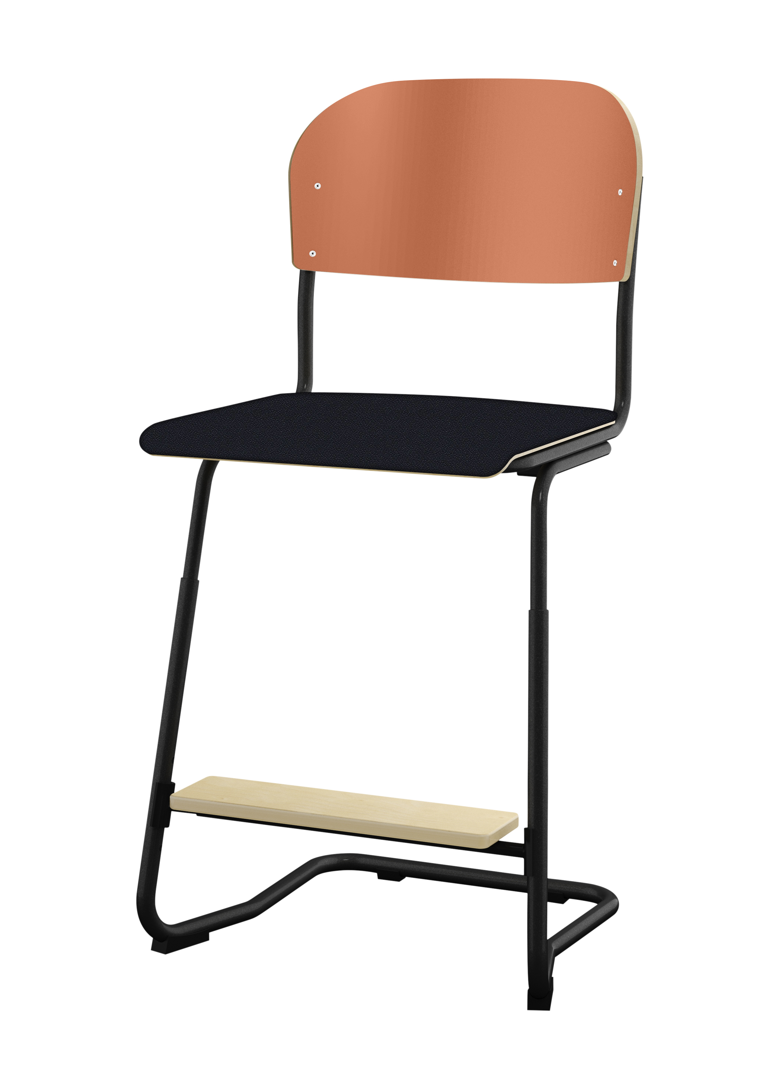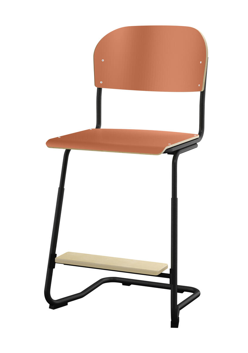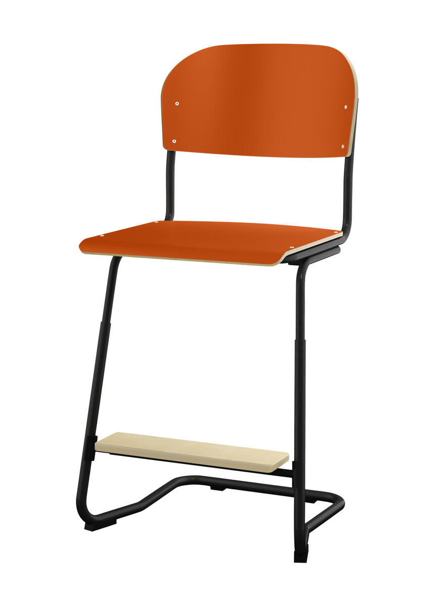 Stapelbar (max 4 st/stapel). Ljuddämpande tassar. Upphängningsbar på bord. Reglerbar fotbräda i 3 fasta lägen. Sitthöjd: 63 cm. Sitsmått: B42xD39 cm. Totaldjupet på stativet är 54 cm. Vikt 7,4 kg. Sits och rygg i högtryckslaminat. Silverlackerat stativ RAL 9006.