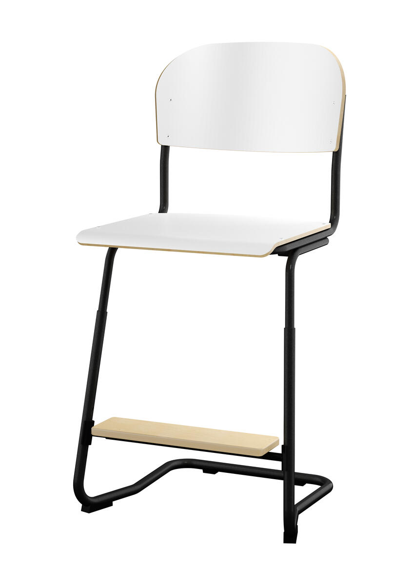 Stapelbar (max 4 st/stapel). Ljuddämpande tassar. Upphängningsbar på bord. Reglerbar fotbräda i 3 fasta lägen. Sitthöjd: ställbar till 57, 60 eller 63 cm. Sitsmått: B42xD39 cm. Totaldjupet på stativet är 54 cm. Vikt 7,4 kg. Sits och rygg i högtryckslaminat. Vitlackerat stativ RAL 9003.