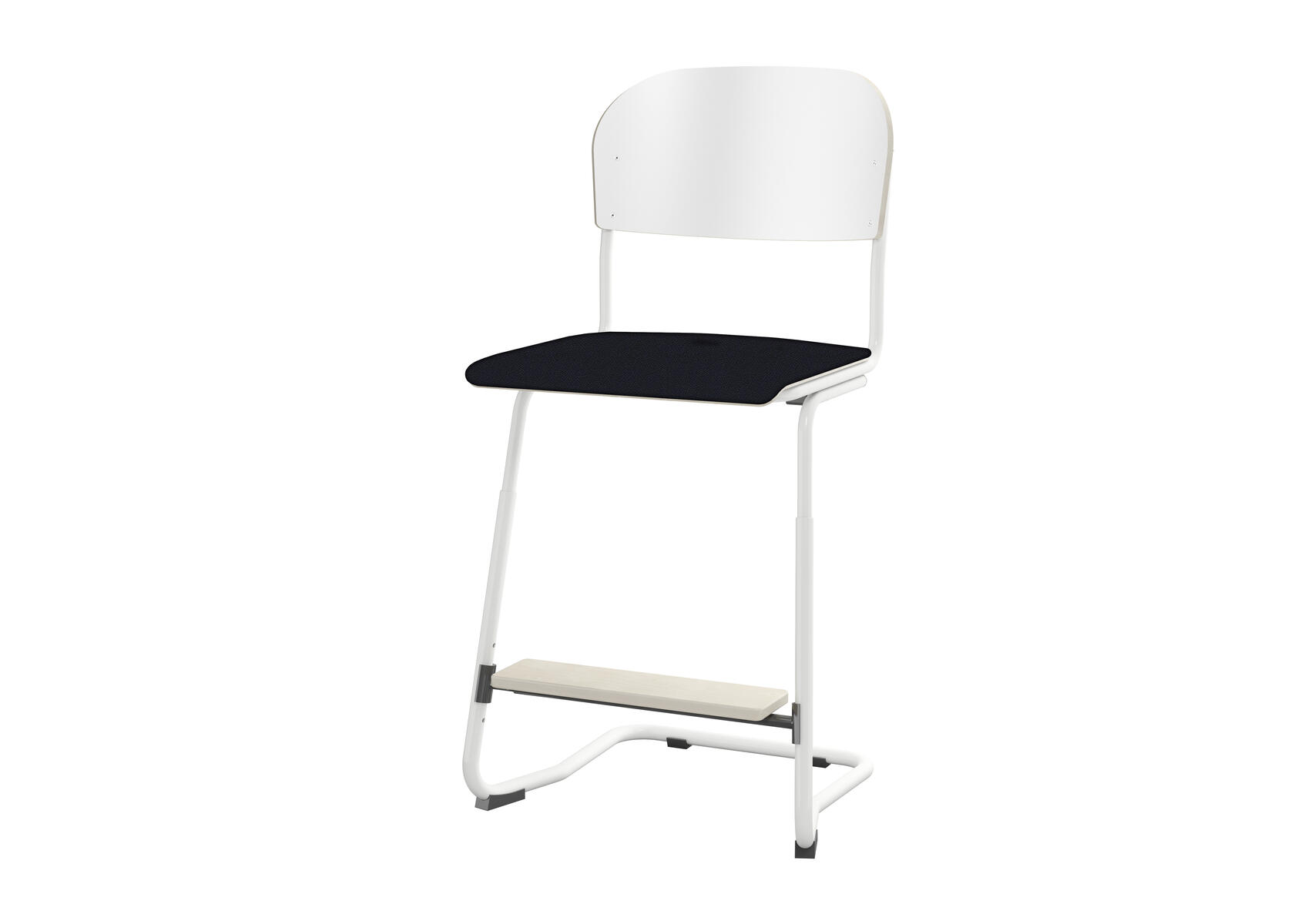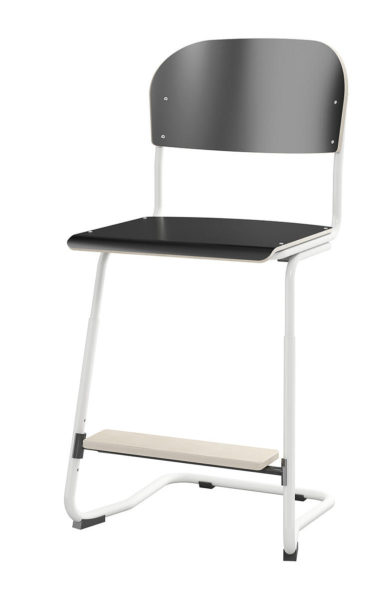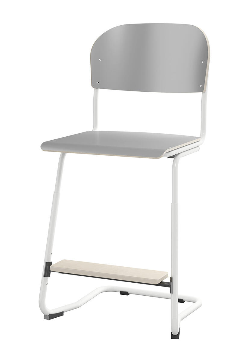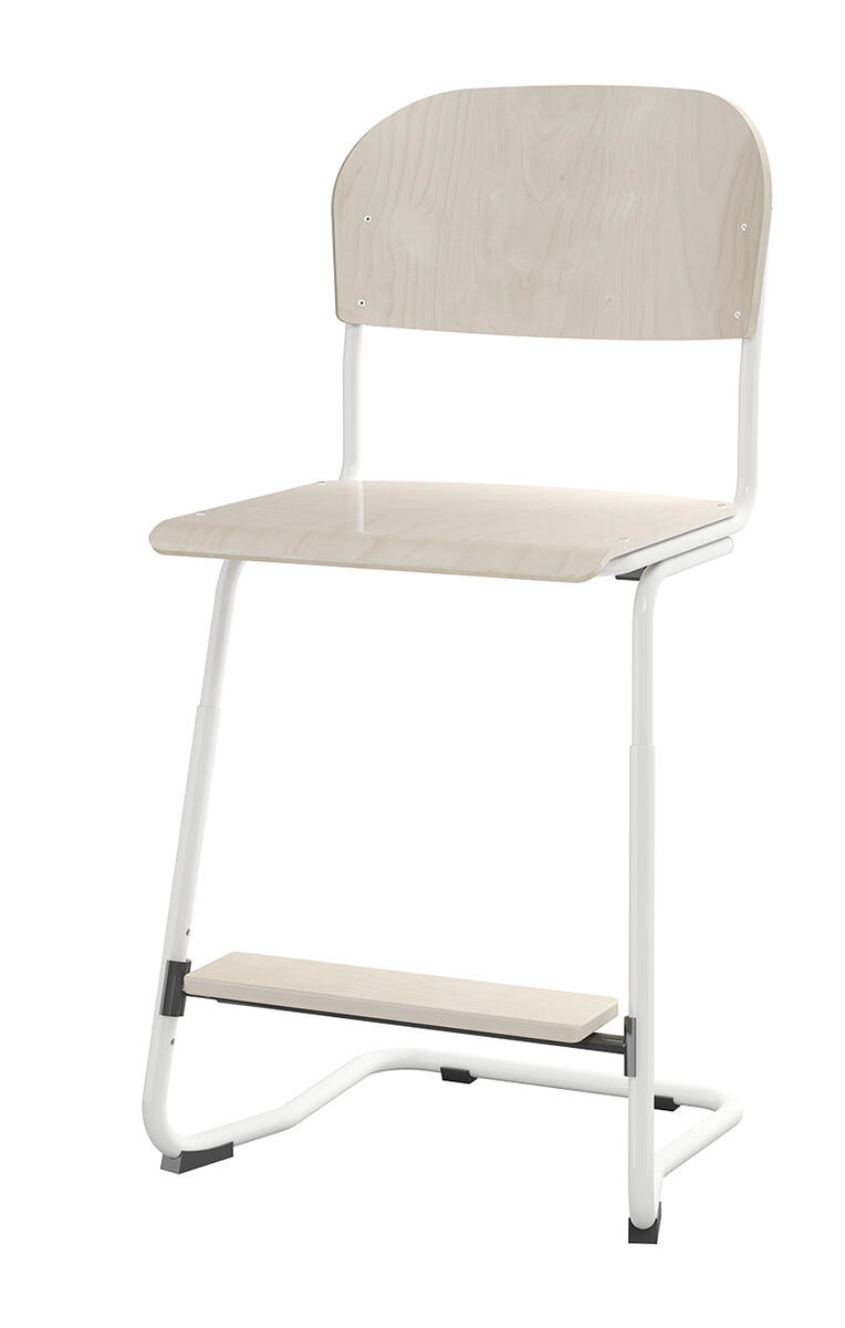 Stapelbar (max 4 st/stapel). Ljuddämpande tassar. Upphängningsbar på bord. Reglerbar fotbräda i 3 fasta lägen. Sitthöjd: ställbar till 57, 60 eller 63 cm. Sitsmått: B42xD39 cm. Totaldjupet på stativet är 54 cm. Vikt 7,4 kg. Sits och rygg i högtryckslaminat. Vitlackerat stativ RAL 9003.
