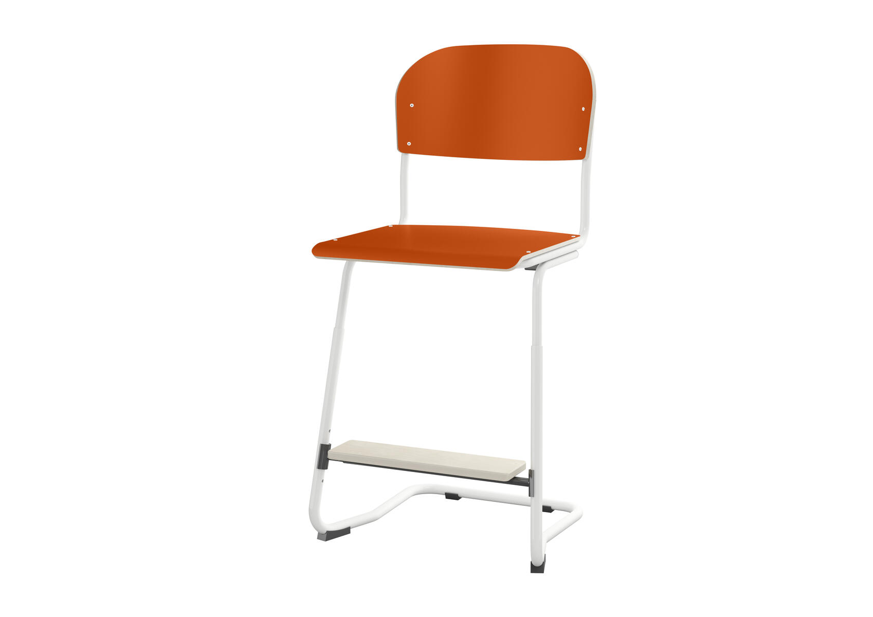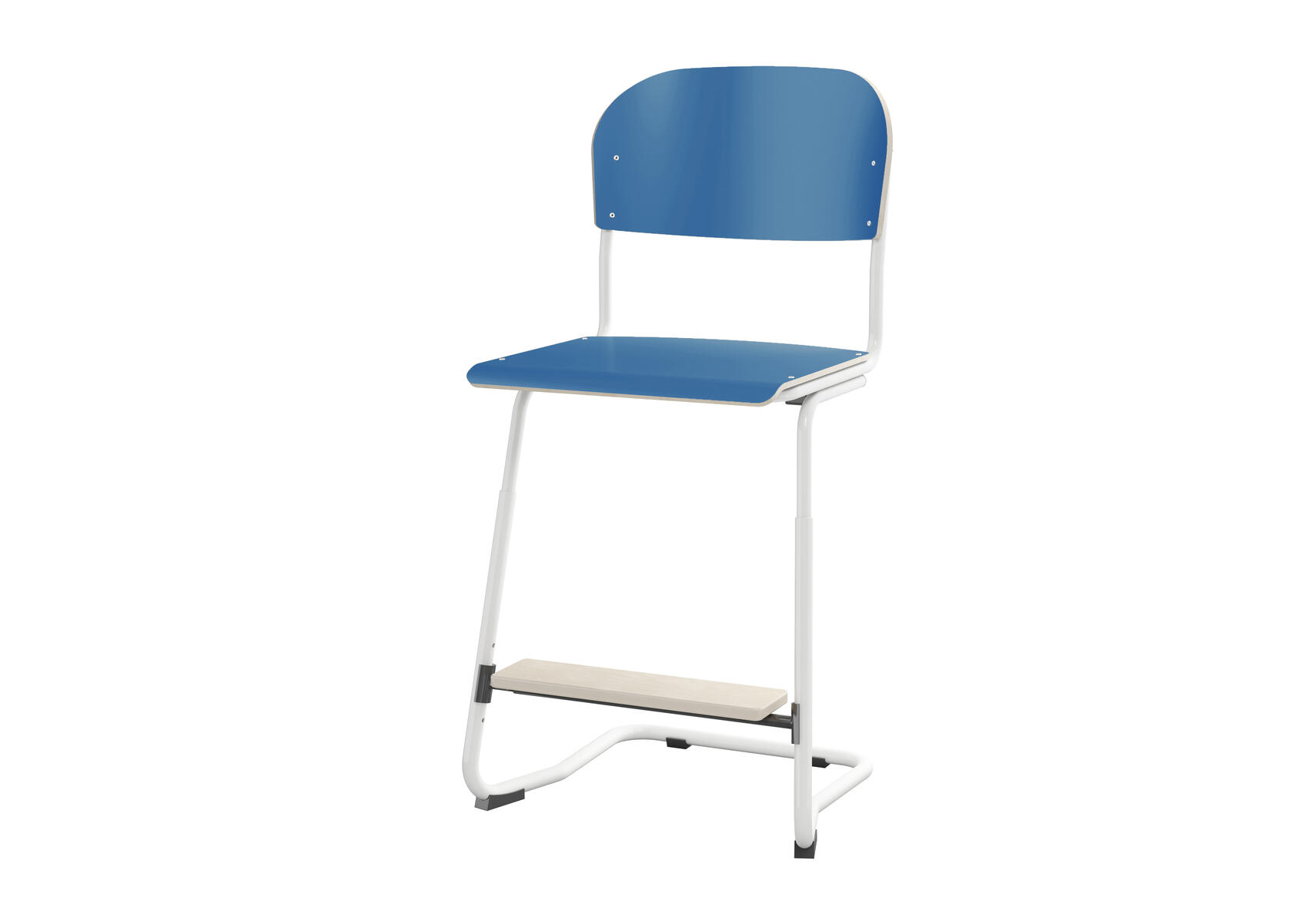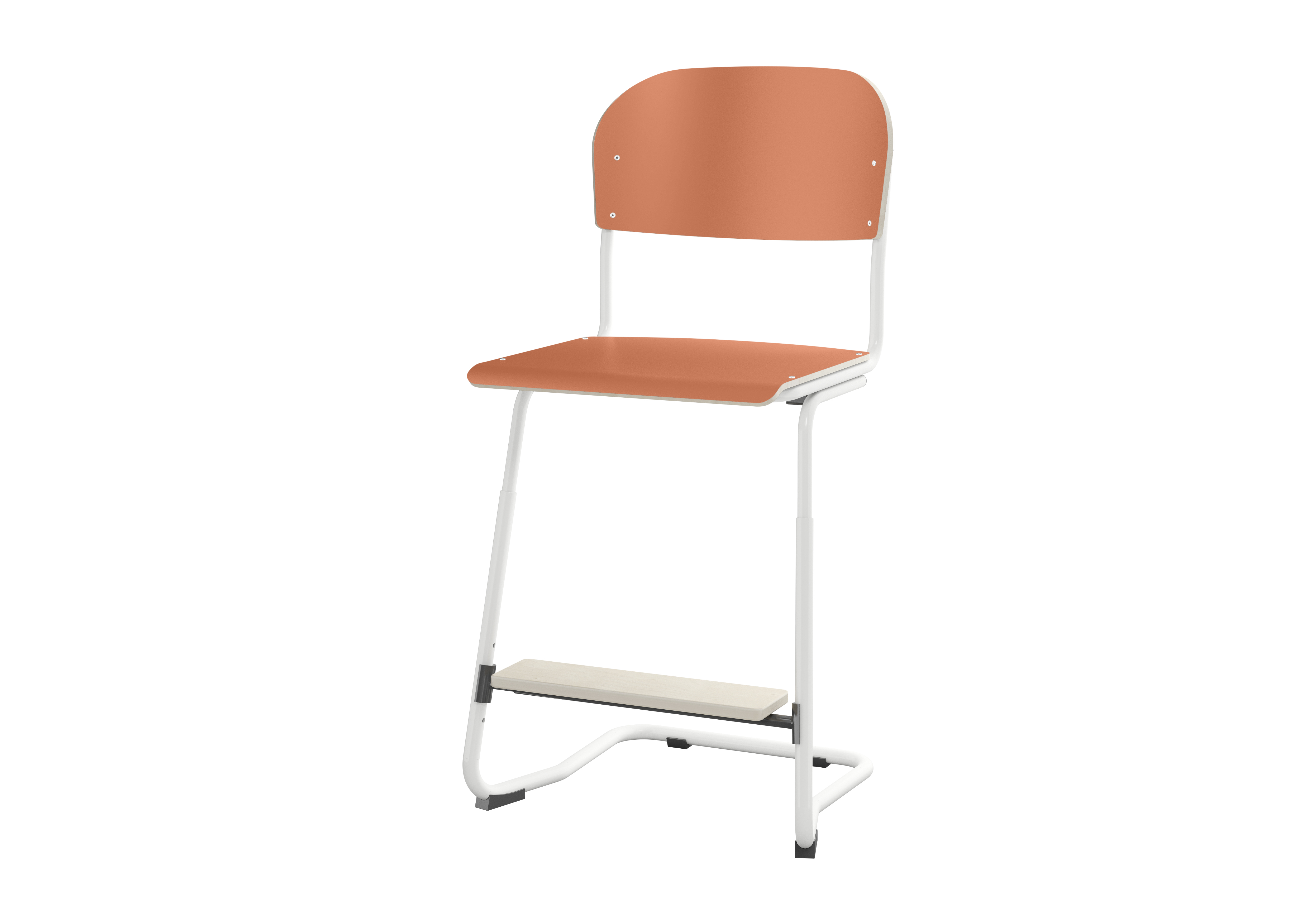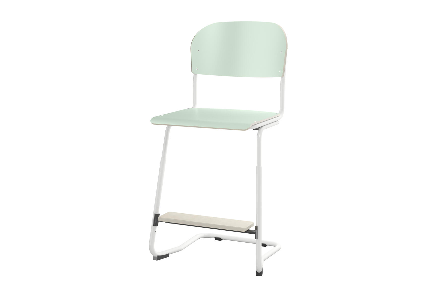 Stapelbar (max 4 st/stapel). Ljuddämpande tassar. Upphängningsbar på bord. Reglerbar fotbräda i 3 fasta lägen. Sitthöjd: ställbar till 57, 60 eller 63 cm. Sitsmått: B42xD39 cm. Totaldjupet på stativet är 54 cm. Vikt 7,4 kg. Sits och rygg i högtryckslaminat. Vitlackerat stativ RAL 9003.