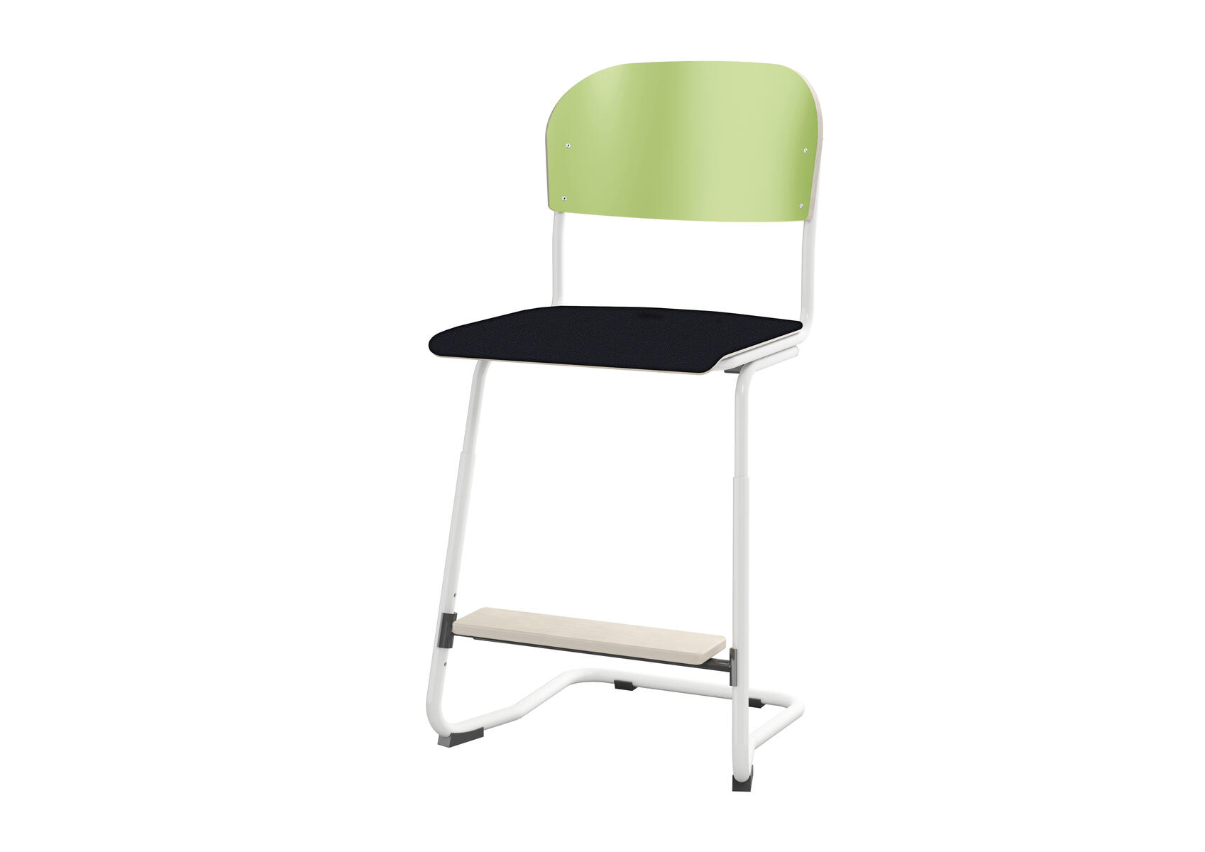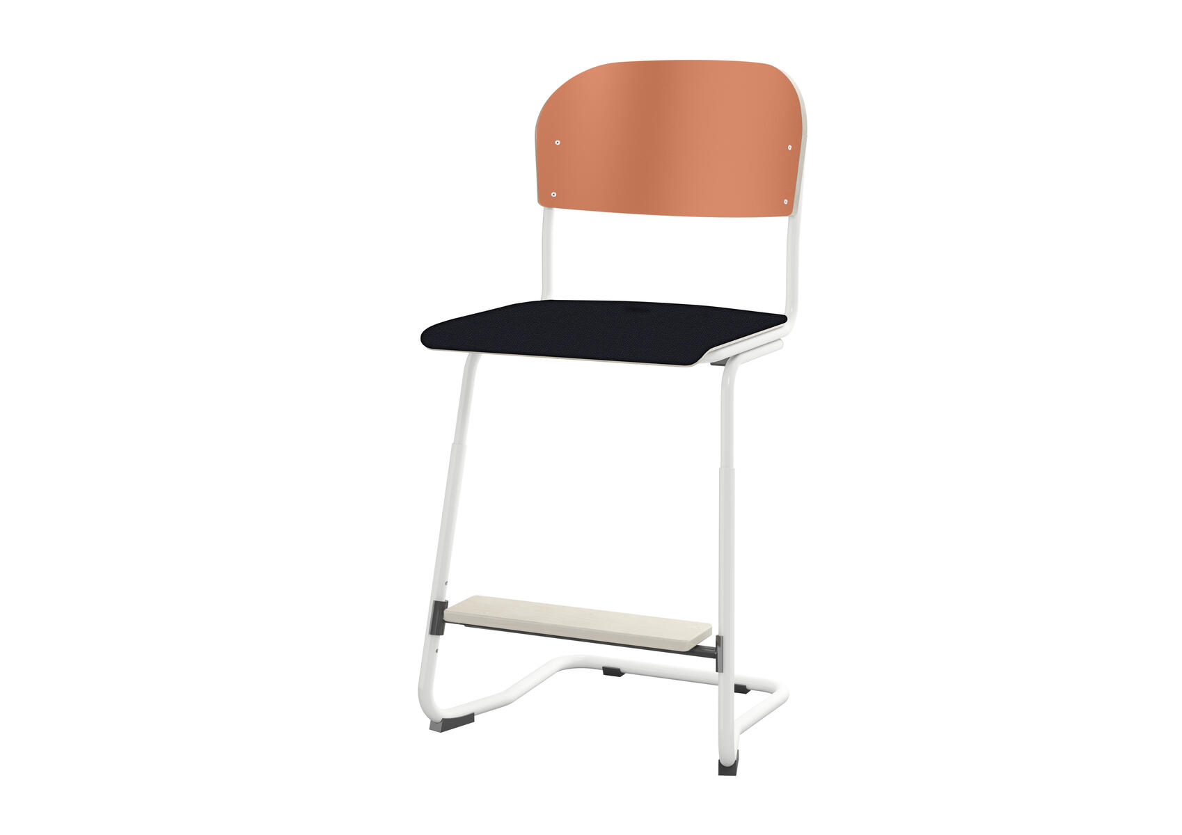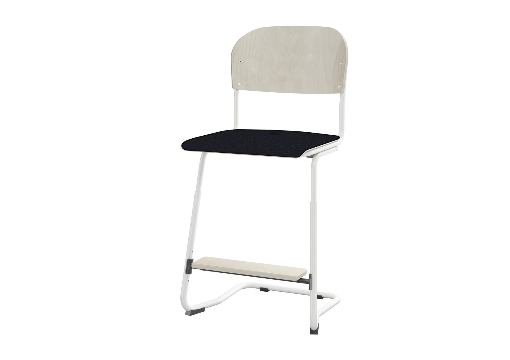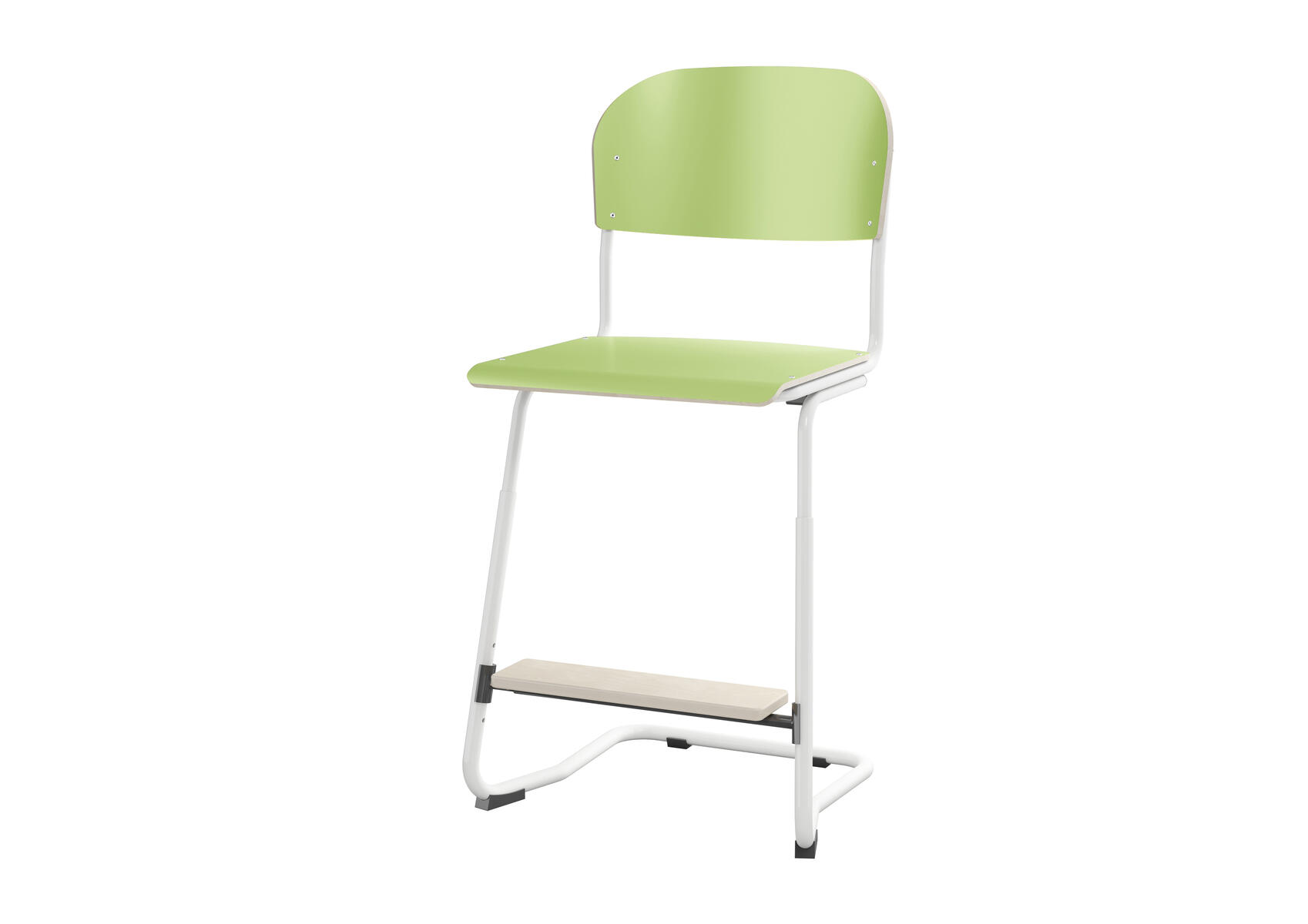 Stapelbar (max 4 st/stapel). Ljuddämpande tassar. Upphängningsbar på bord. Reglerbar fotbräda i 3 fasta lägen. Sitthöjd: ställbar till 57, 60 eller 63 cm. Sitsmått: B42xD39 cm. Totaldjupet på stativet är 54 cm. Vikt 7,4 kg. Sits och rygg i högtryckslaminat. Vitlackerat stativ RAL 9003.