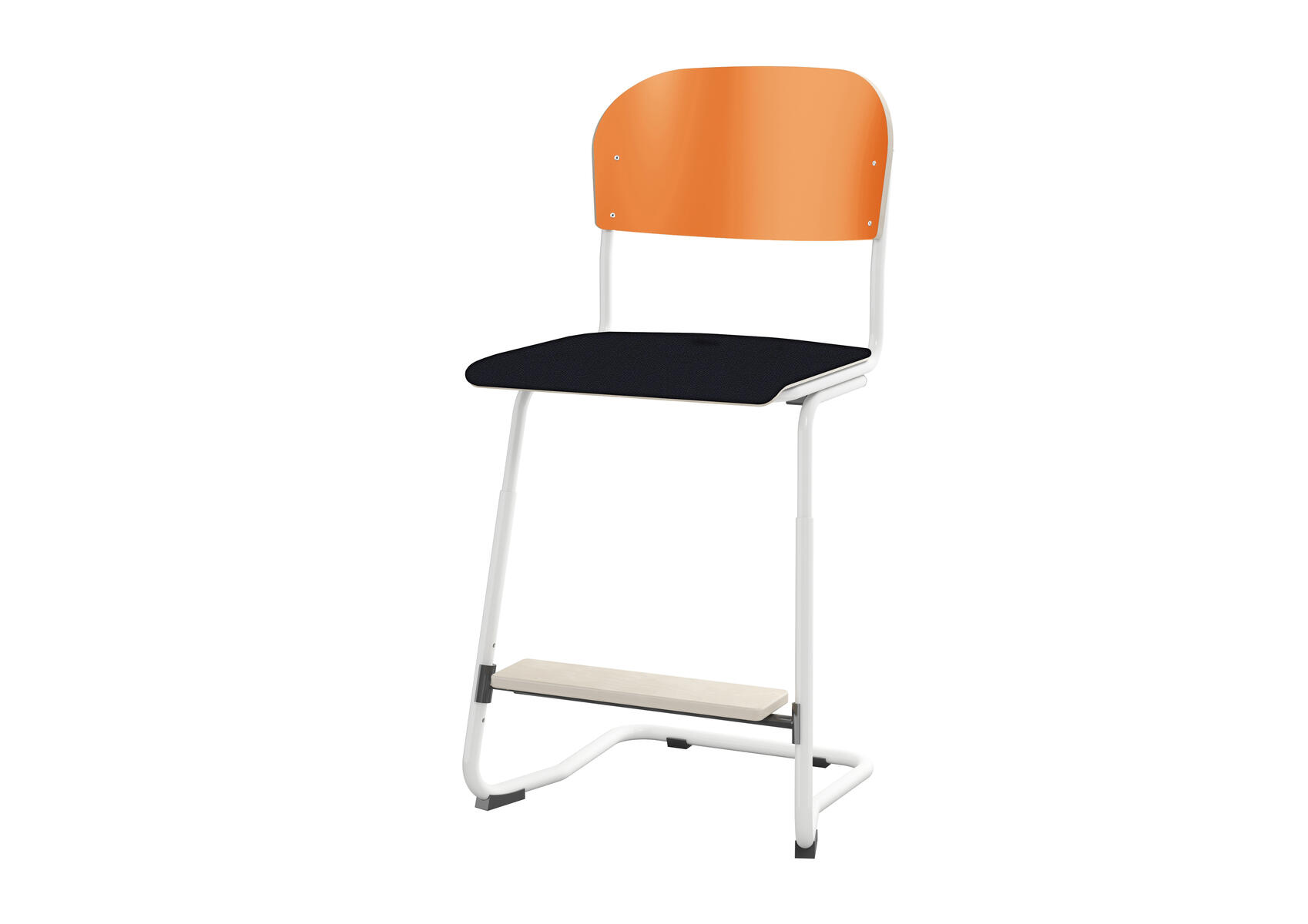 Stapelbar (max 4 st/stapel). Ljuddämpande tassar. Upphängningsbar på bord. Reglerbar fotbräda i 3 fasta lägen. Sitthöjd 50 cm. Sitsmått: B36xD35 cm. Totaldjupet på stativet är 54 cm. Vikt 4,6 kg. Sits och rygg i högtryckslaminat. Silverlackerat stativ, RAL 9006.