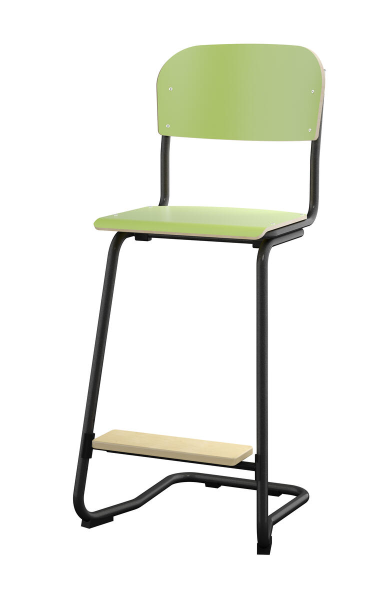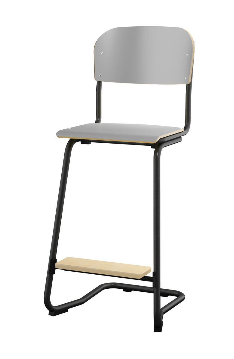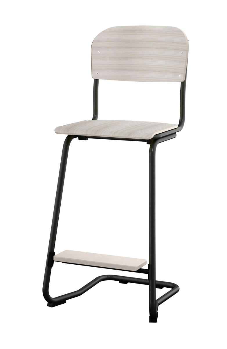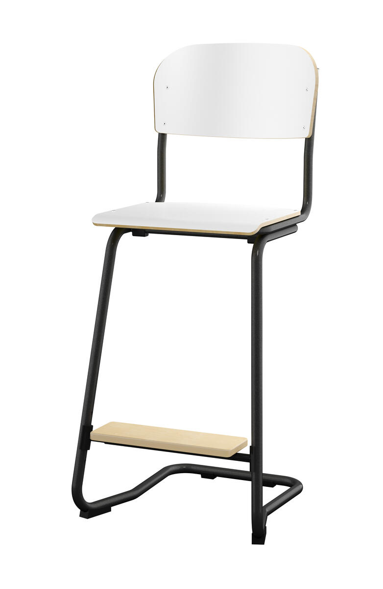 Stapelbar (max 4 st/stapel). Ljuddämpande tassar. Upphängningsbar på bord. Reglerbar fotbräda i 3 fasta lägen. Sitthöjd 50 cm. Sitsmått: B36xD35 cm. Totaldjupet på stativet är 54 cm. Vikt 4,6 kg. Sits och rygg i högtryckslaminat. Silverlackerat stativ, RAL 9006.