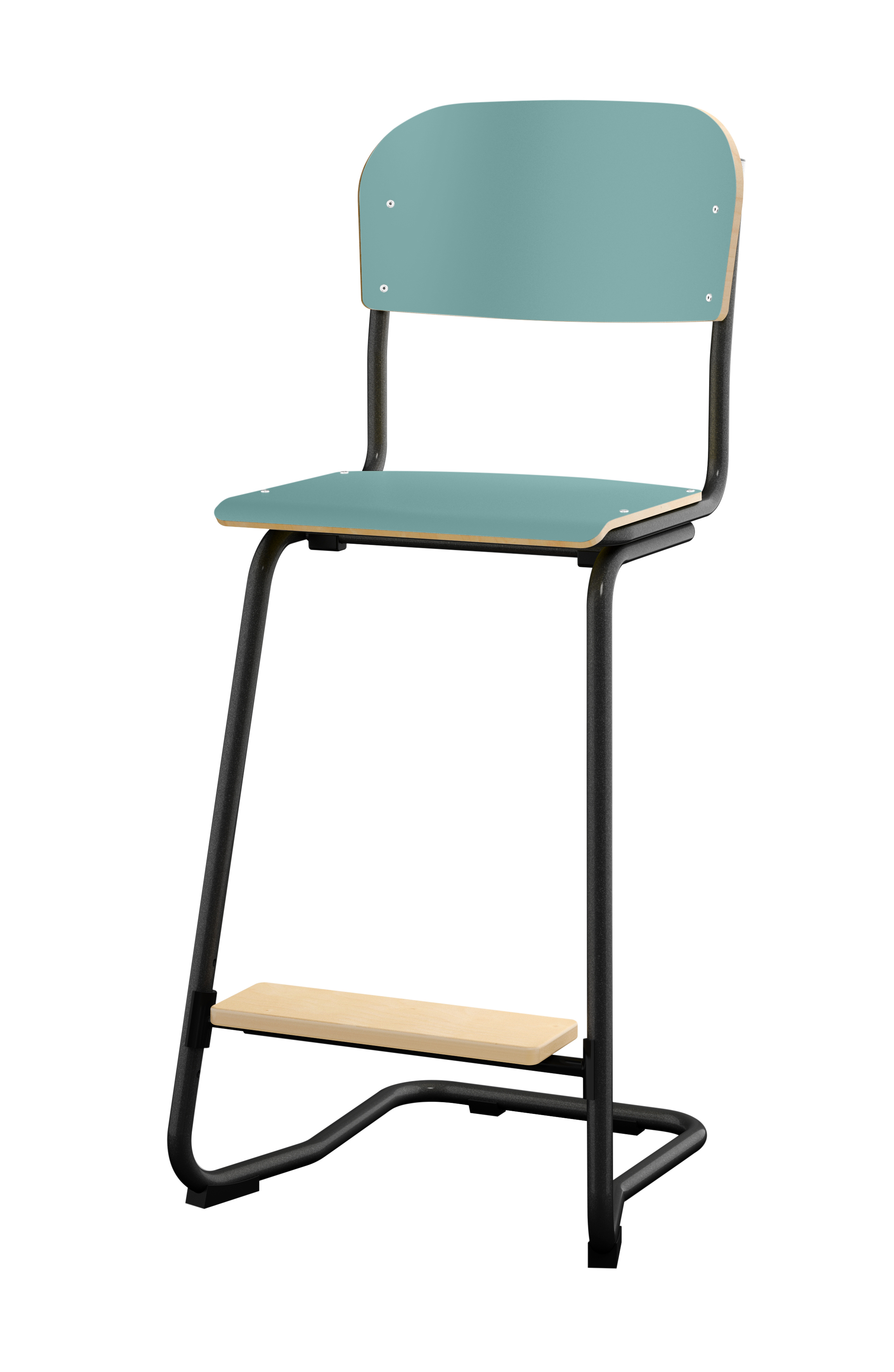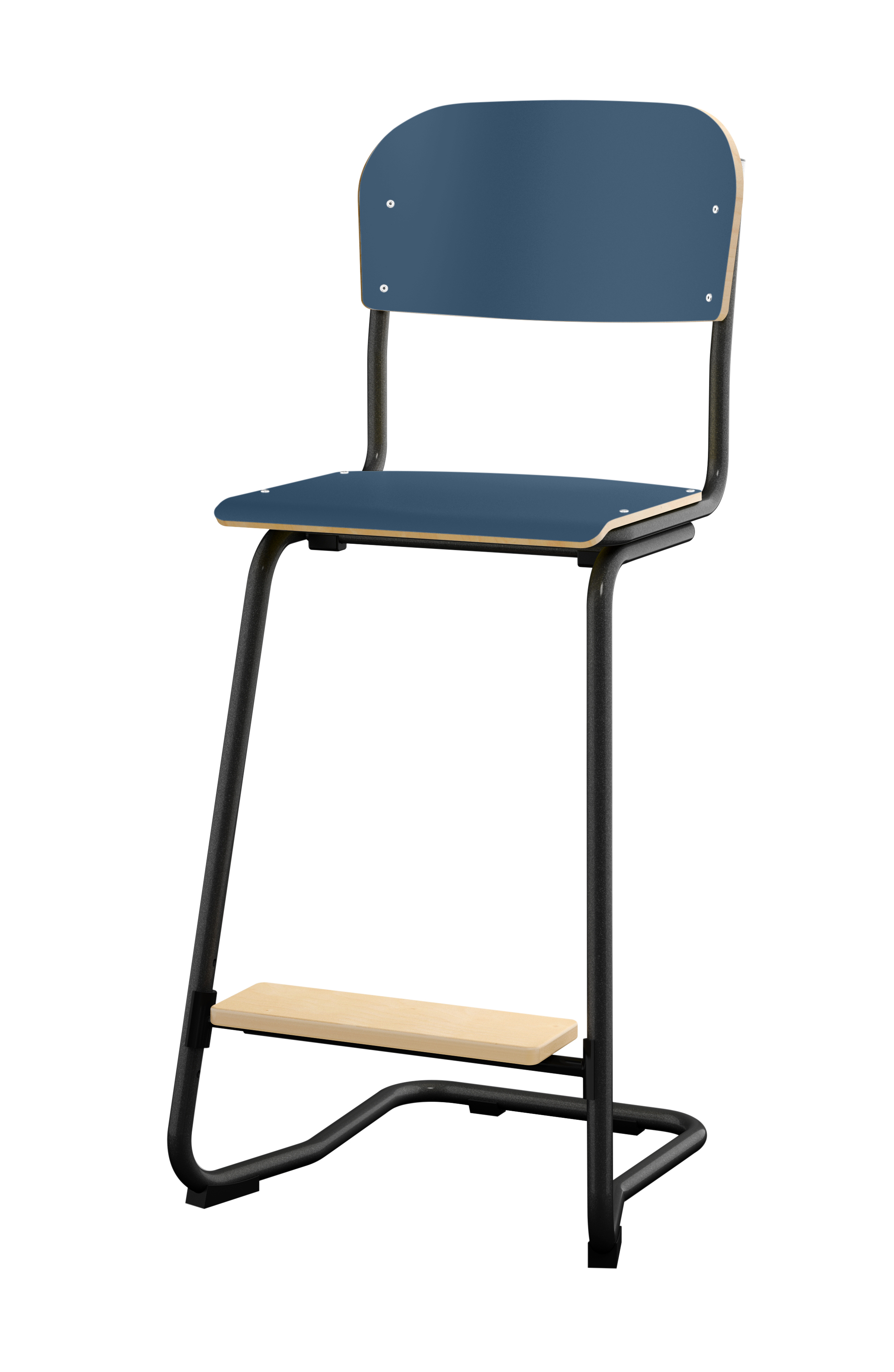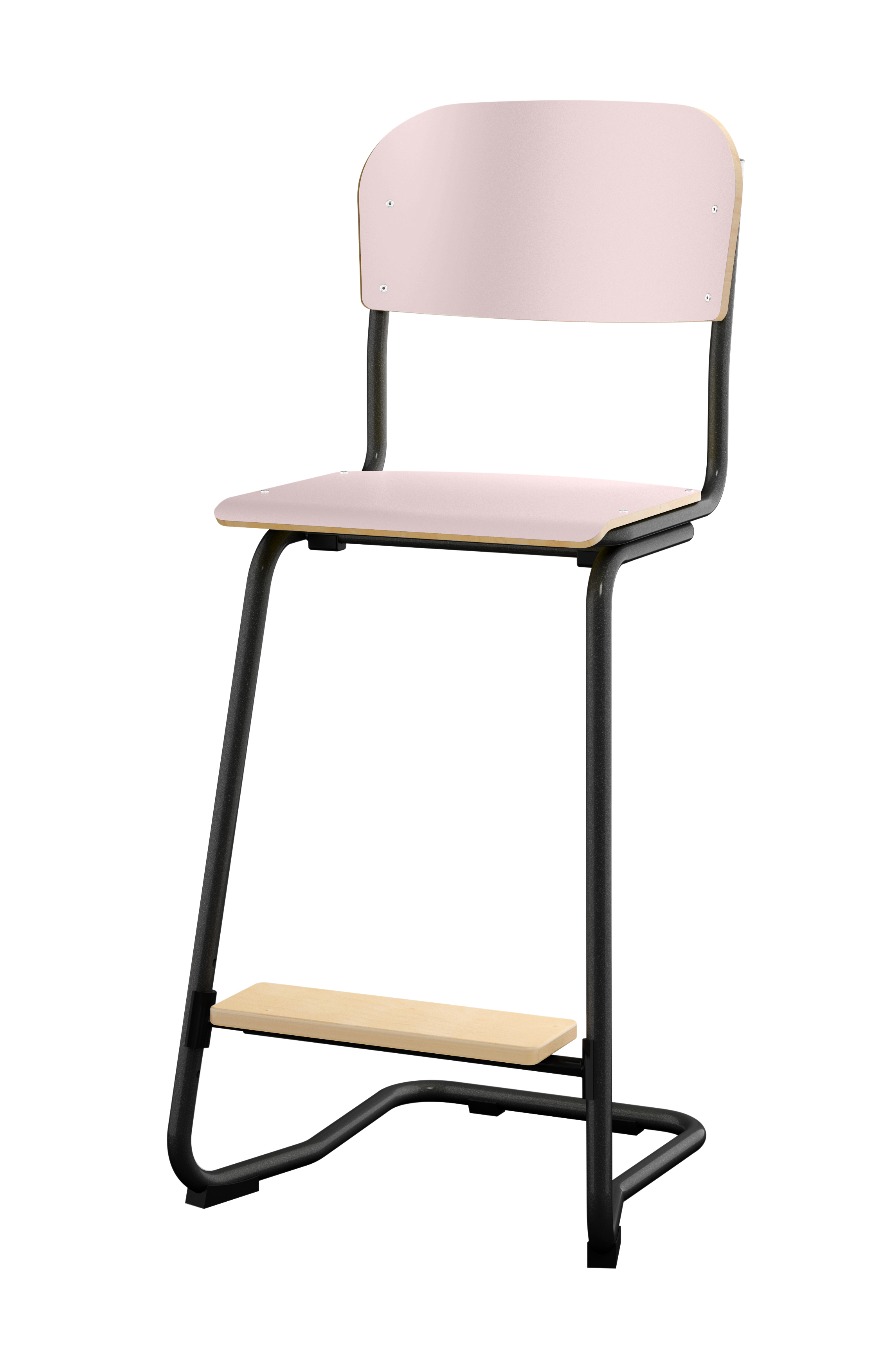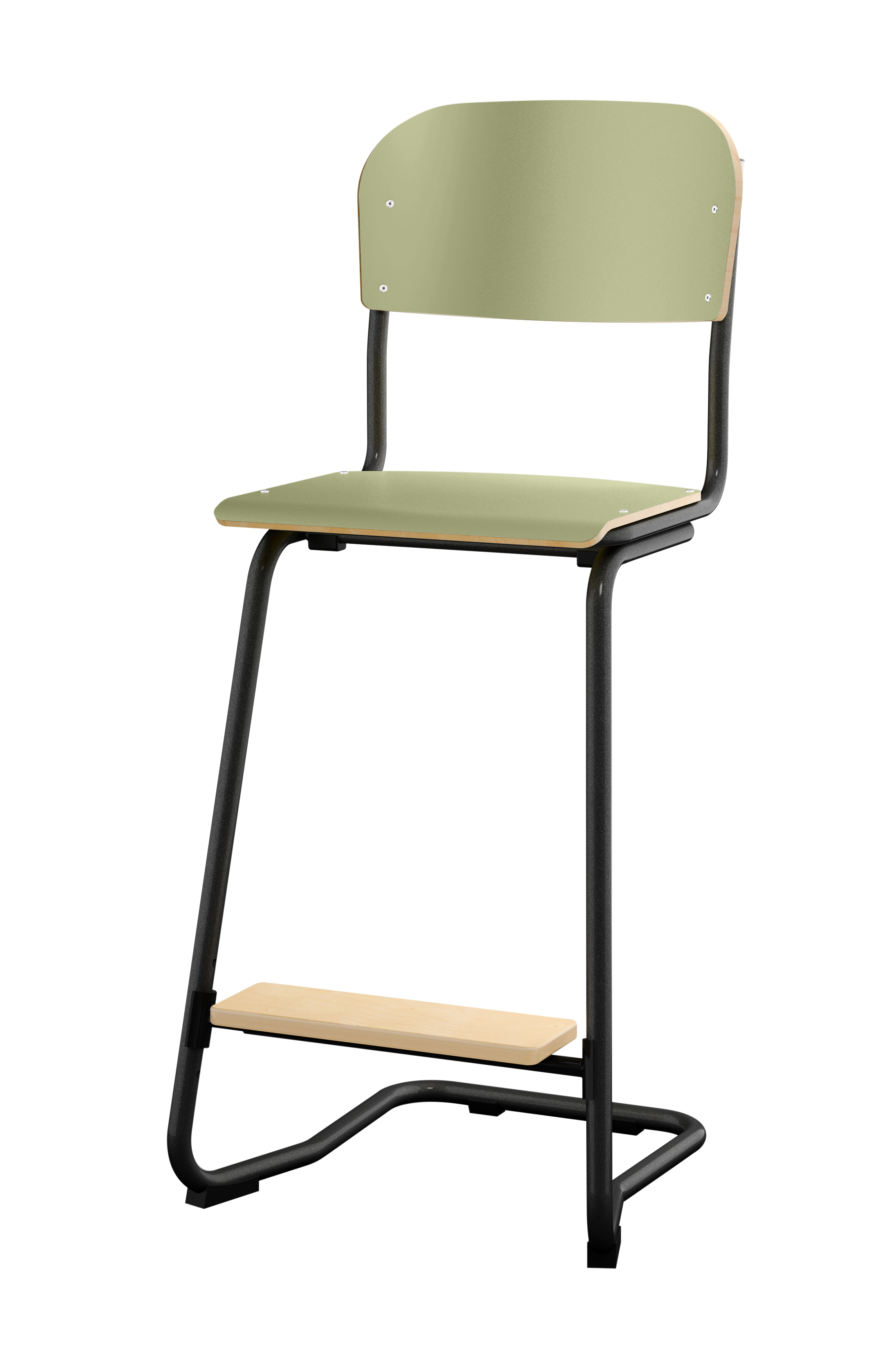 Stapelbar (max 4 st/stapel). Ljuddämpande tassar. Upphängningsbar på bord. Reglerbar fotbräda i 3 fasta lägen. Sitthöjd 50 cm. Sitsmått: B36xD35 cm. Totaldjupet på stativet är 54 cm. Vikt 4,6 kg. Sits och rygg i högtryckslaminat. Silverlackerat stativ, RAL 9006.