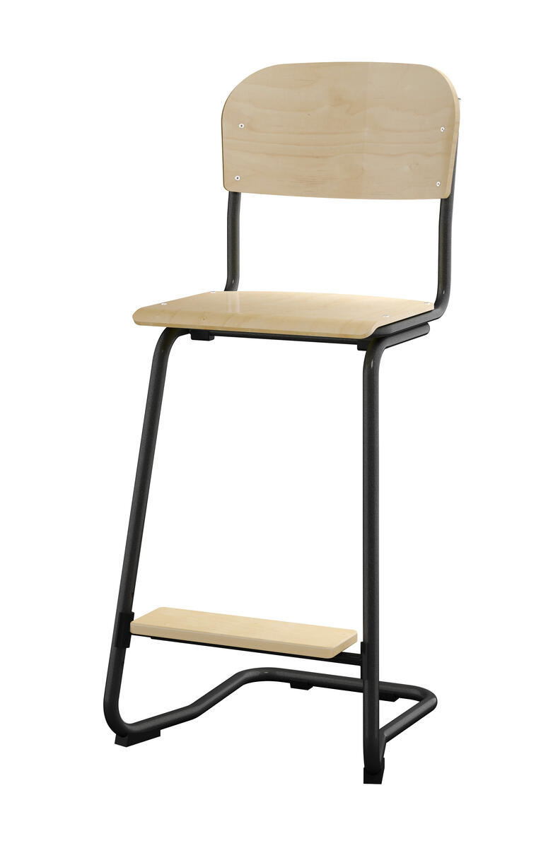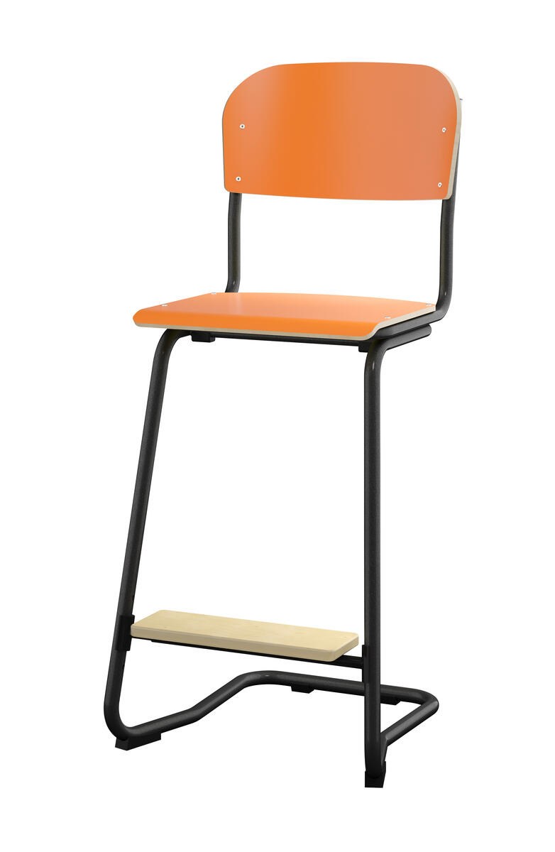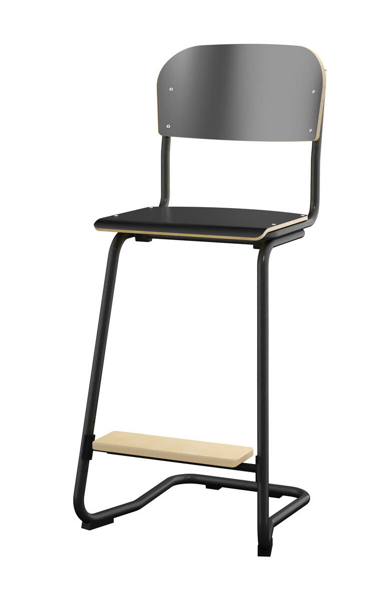 Stapelbar (max 4 st/stapel). Ljuddämpande tassar. Upphängningsbar på bord. Reglerbar fotbräda i 3 fasta lägen. Sitthöjd: 63 cm. Sitsmått: B42xD39 cm. Totaldjupet på stativet är 54 cm. Vikt 7,4 kg. Sits och rygg i högtryckslaminat. Svart stativ RAL 9005.
